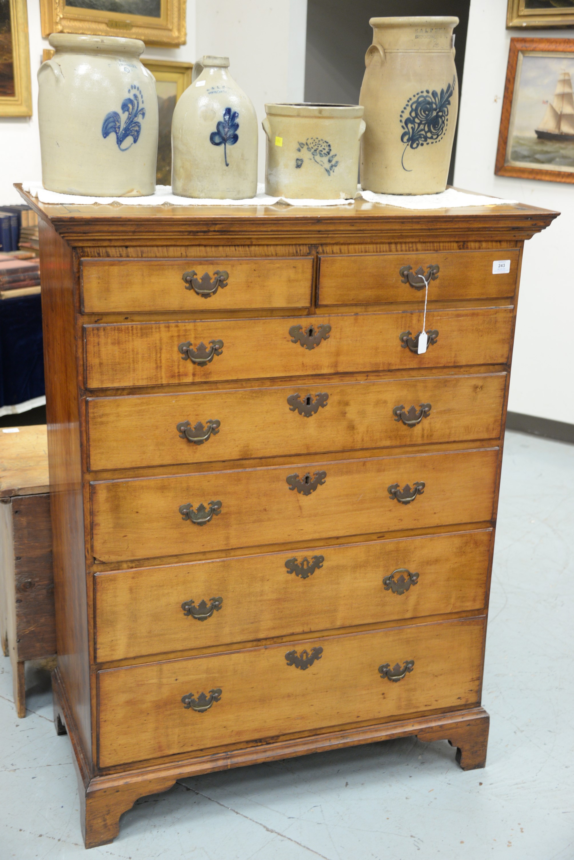 Lot 243: Maple six drawer tall chest having cornice molded top over two short drawers over five drawers all set on bracket base. ht. 51 1/…