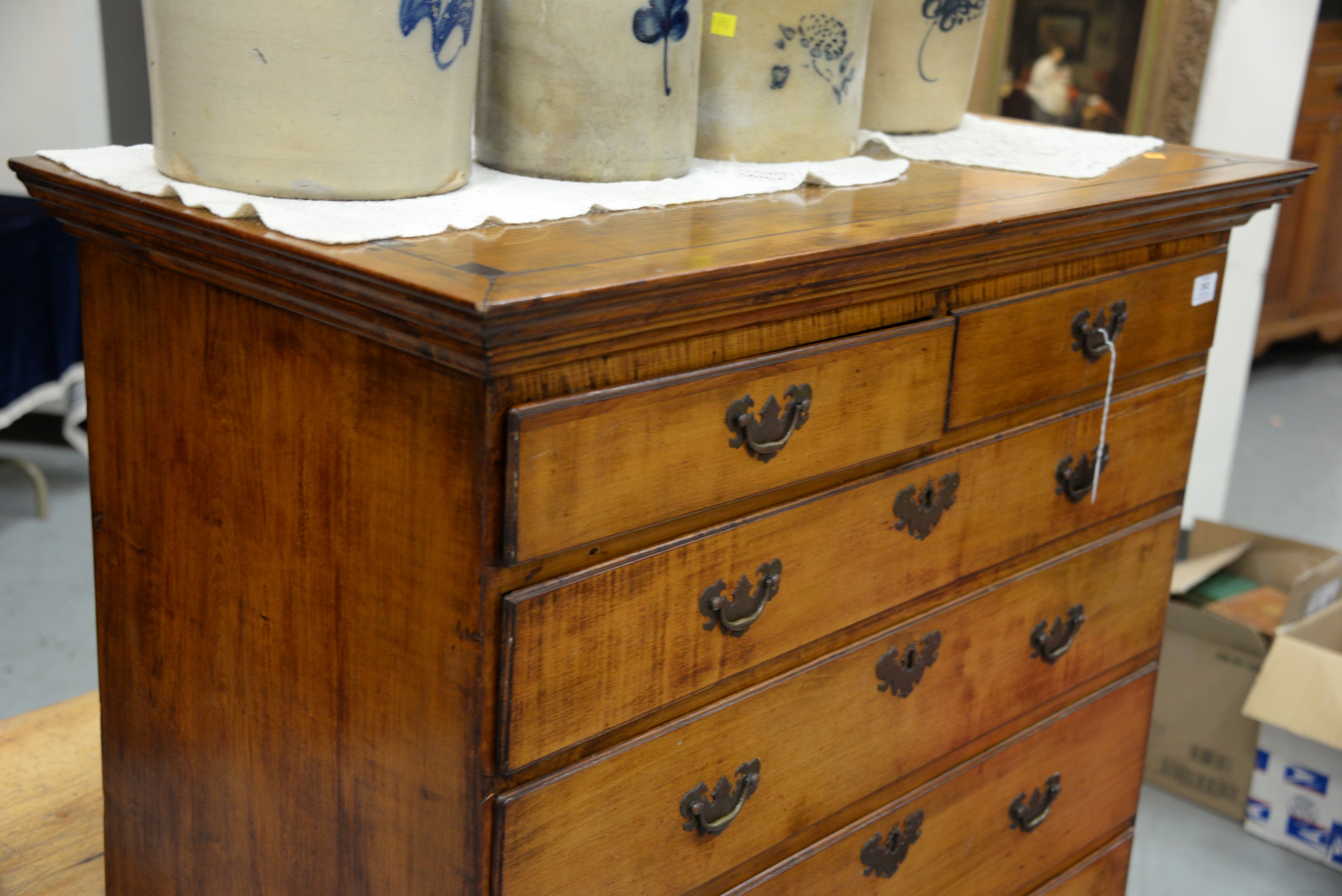 Maple six drawer tall chest having cornice molded top over two short drawers over five drawers all set on bracket base. ht. 51 1/4 in. wd. 36 in. dp. 20 in. Provenance: The Estate of Natalie Rafferty