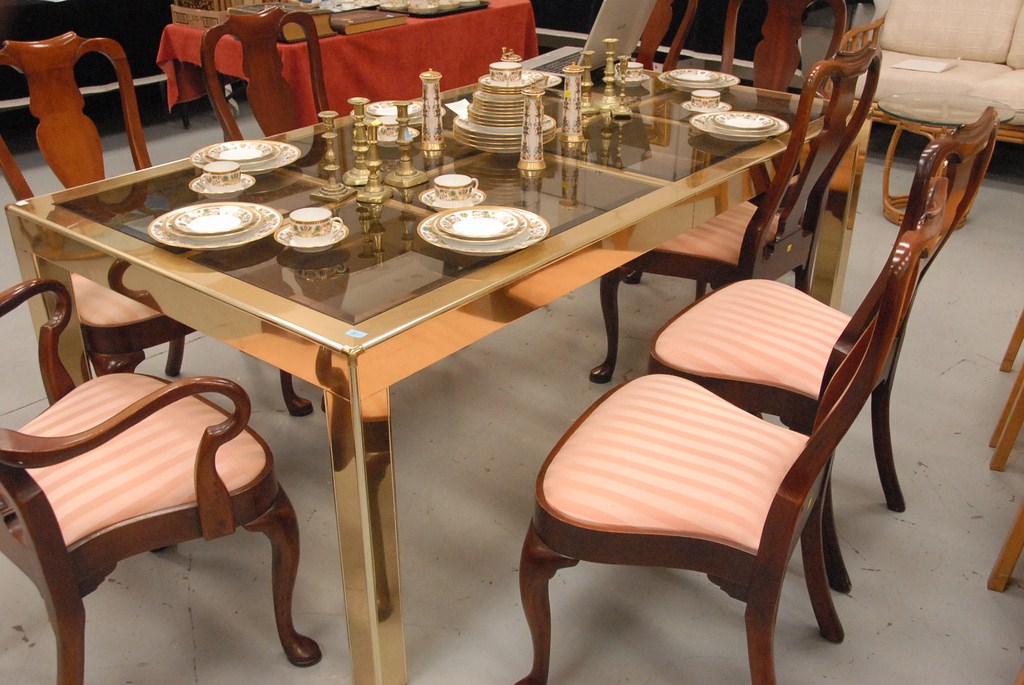 Lot 243: MasterCraft metal table with glass inserts and two leaves and tinted glass, ht. 29 1/2in. lg. 81in. wd. 42in. plus two 20in. leav…