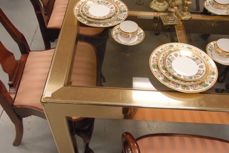 MasterCraft metal table with glass inserts and two leaves and tinted glass, ht. 29 1/2in. lg. 81in. wd. 42in. plus two 20in. leaves, opening to 10ft.1in.