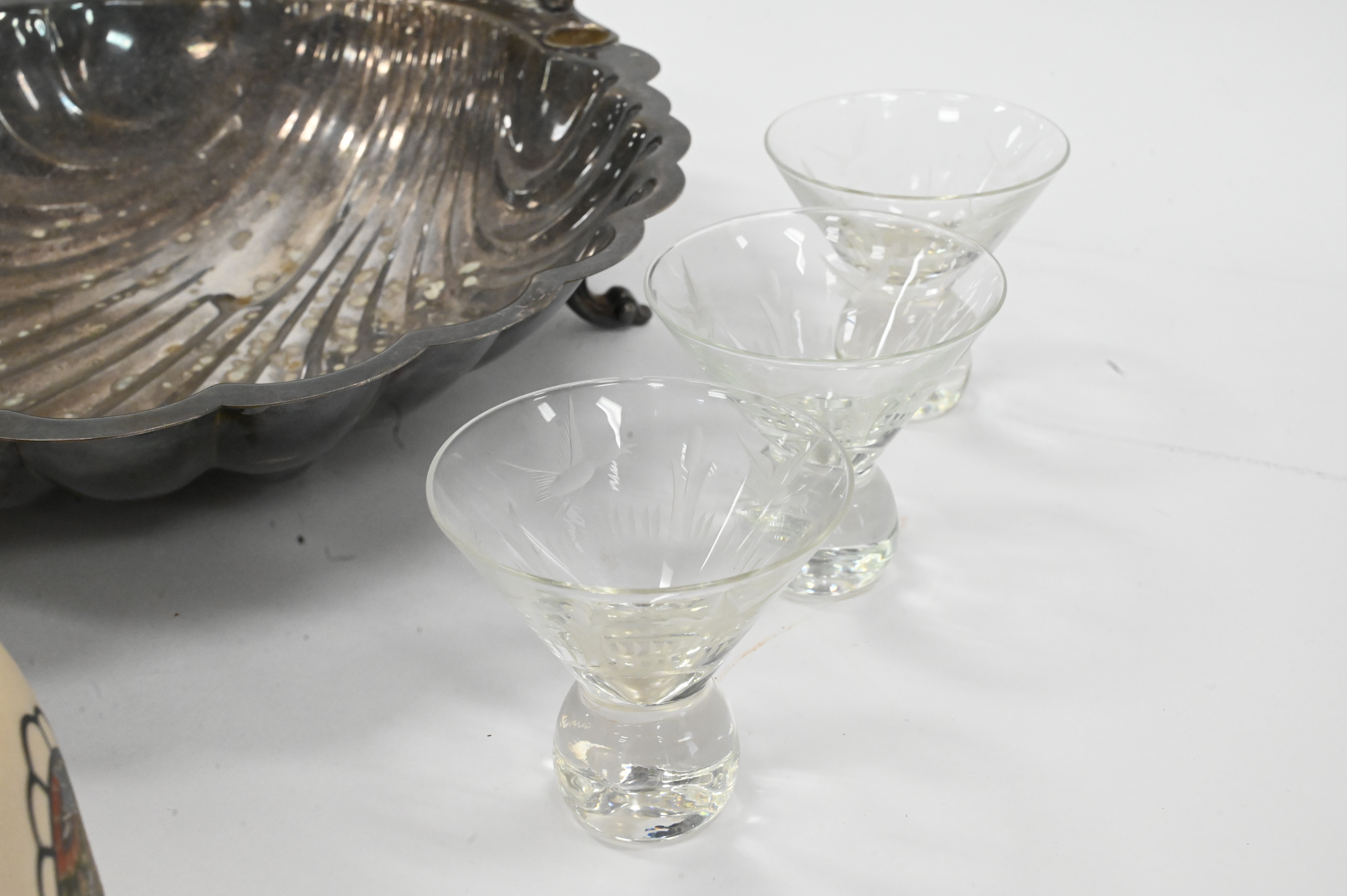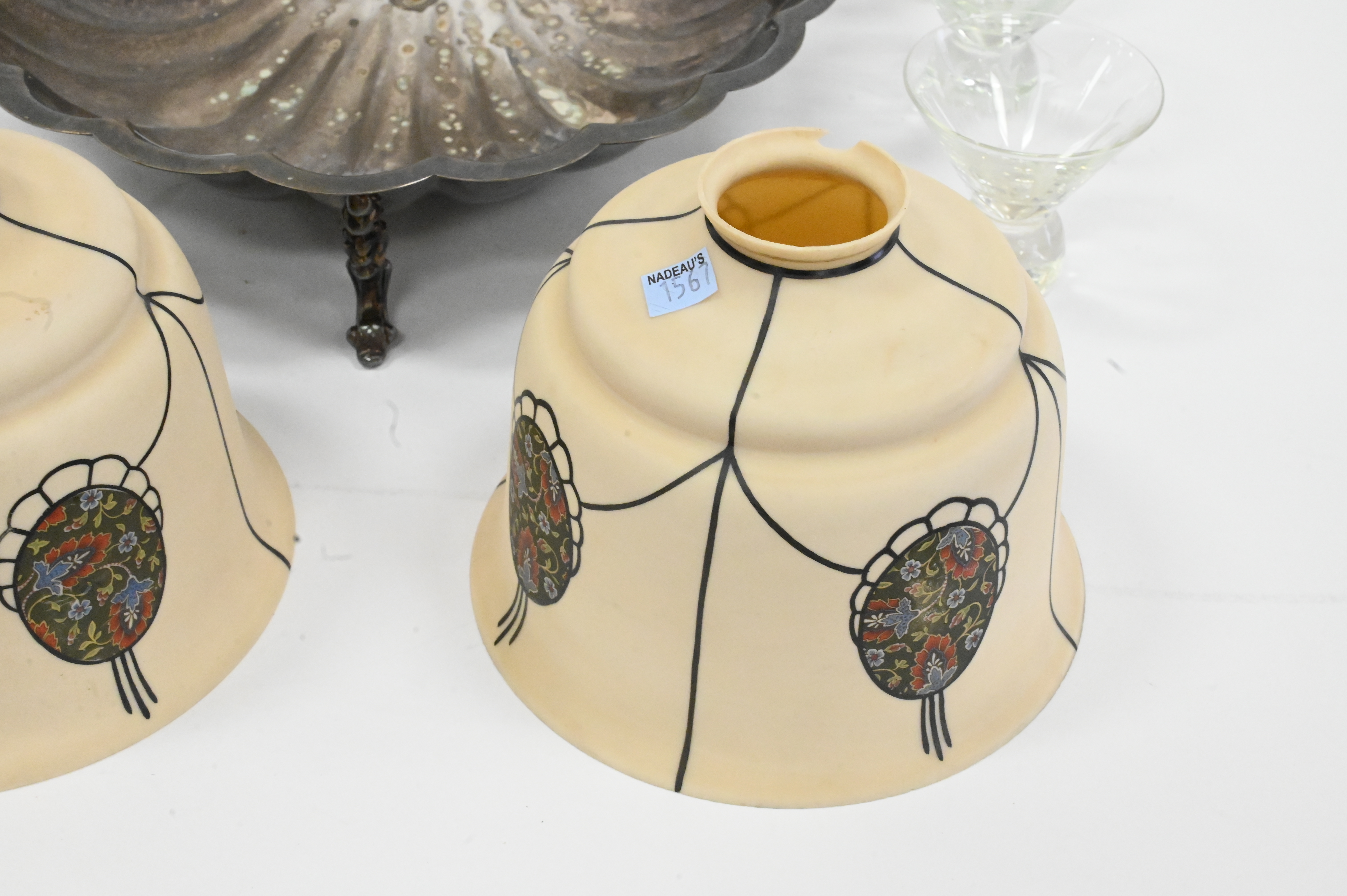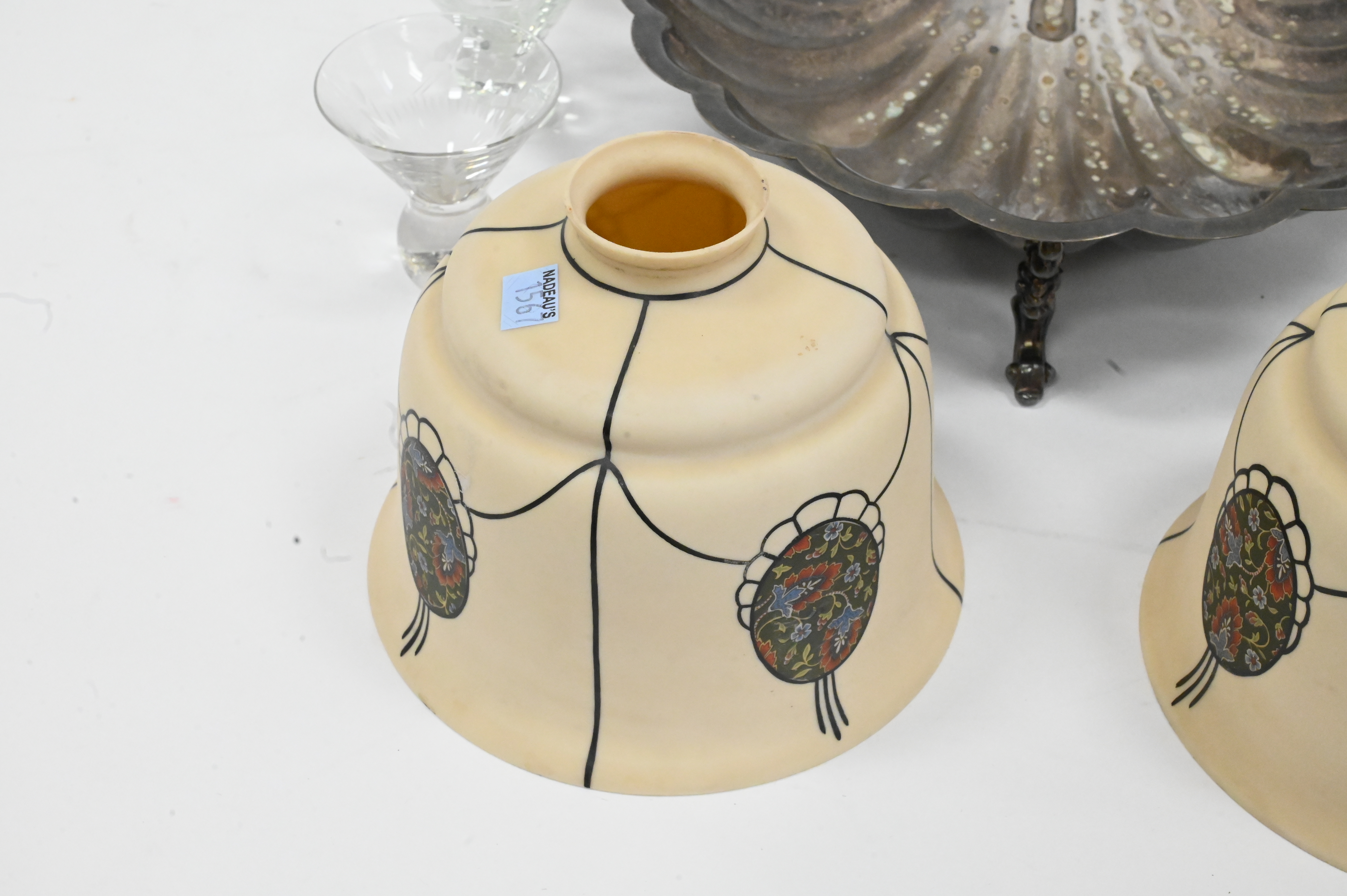 Nine Piece Assorted Grouping, to include a pair of calcite lampshades (chipped) having painted floral and egg design, six glasses, along with a silver painted shell tray; shade height 6 inches.