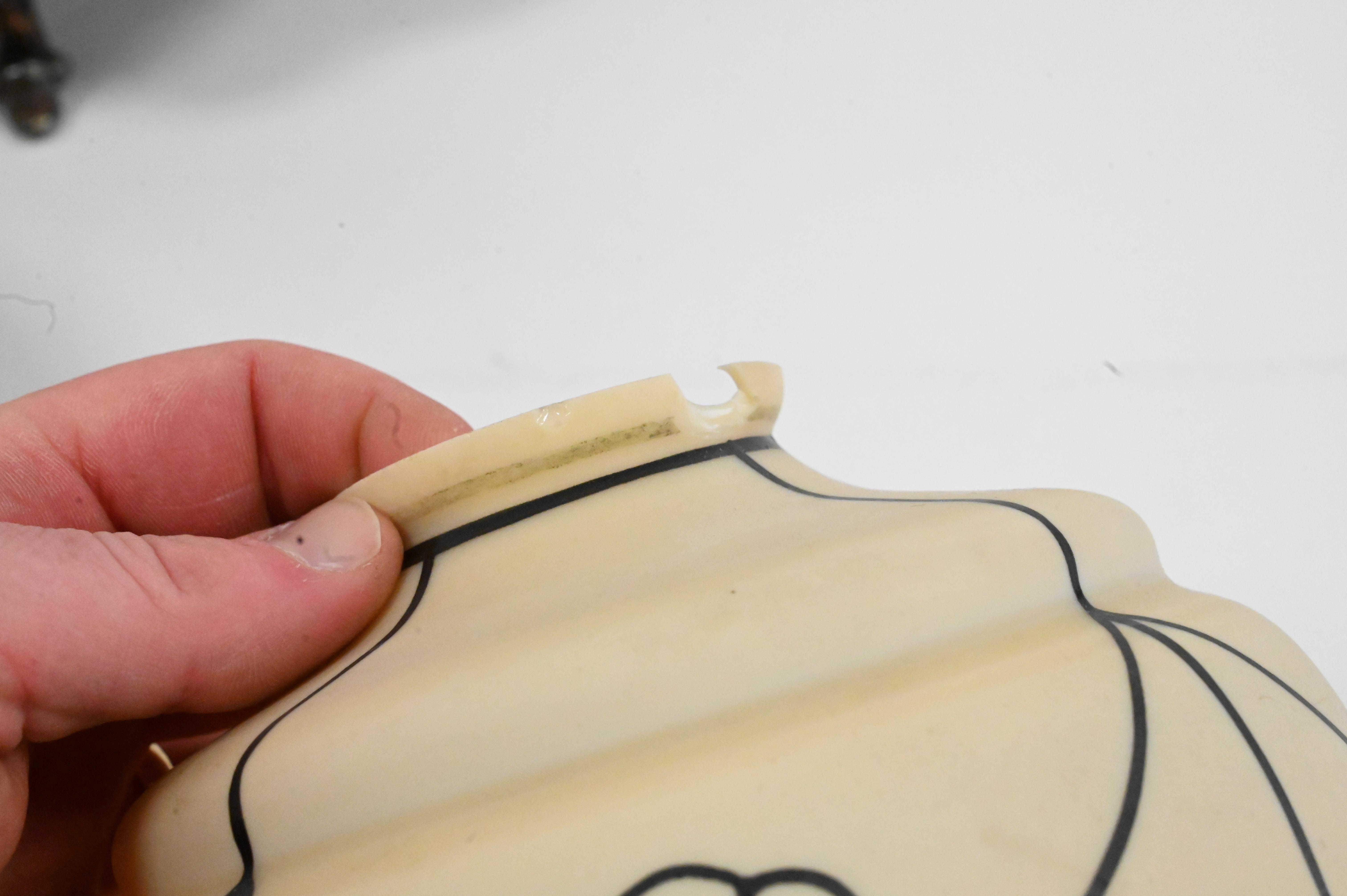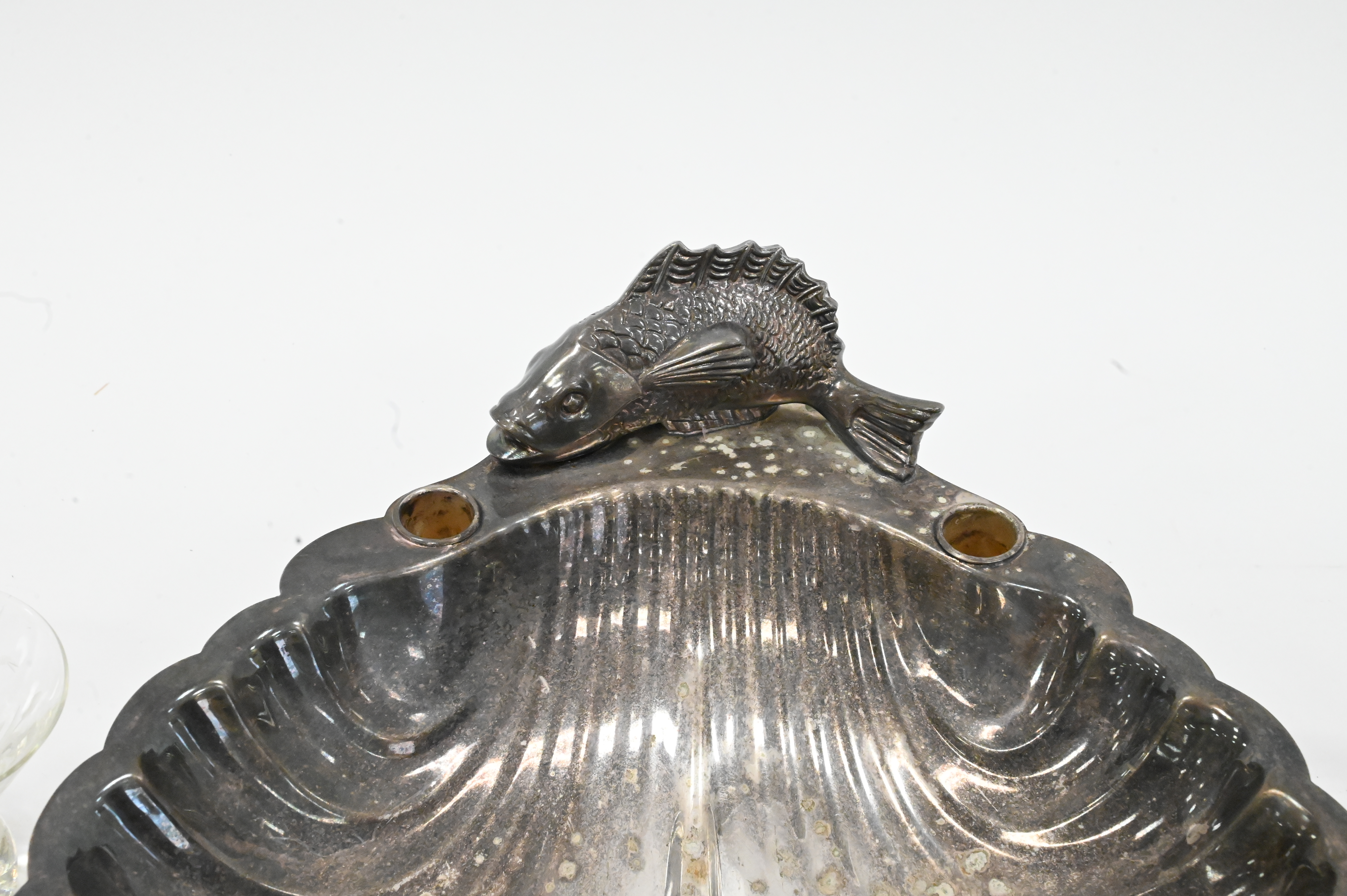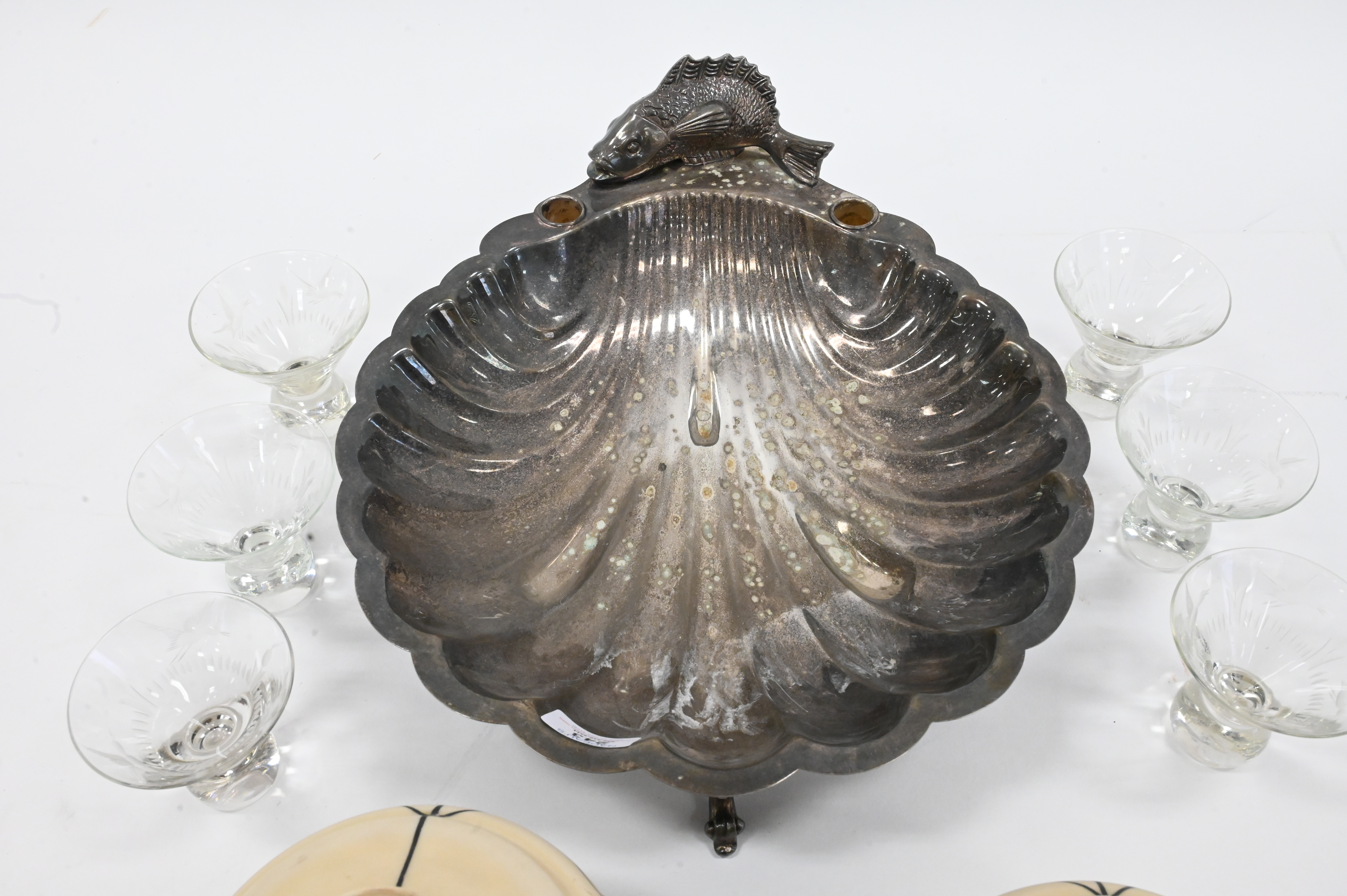 Nine Piece Assorted Grouping, to include a pair of calcite lampshades (chipped) having painted floral and egg design, six glasses, along with a silver painted shell tray; shade height 6 inches.