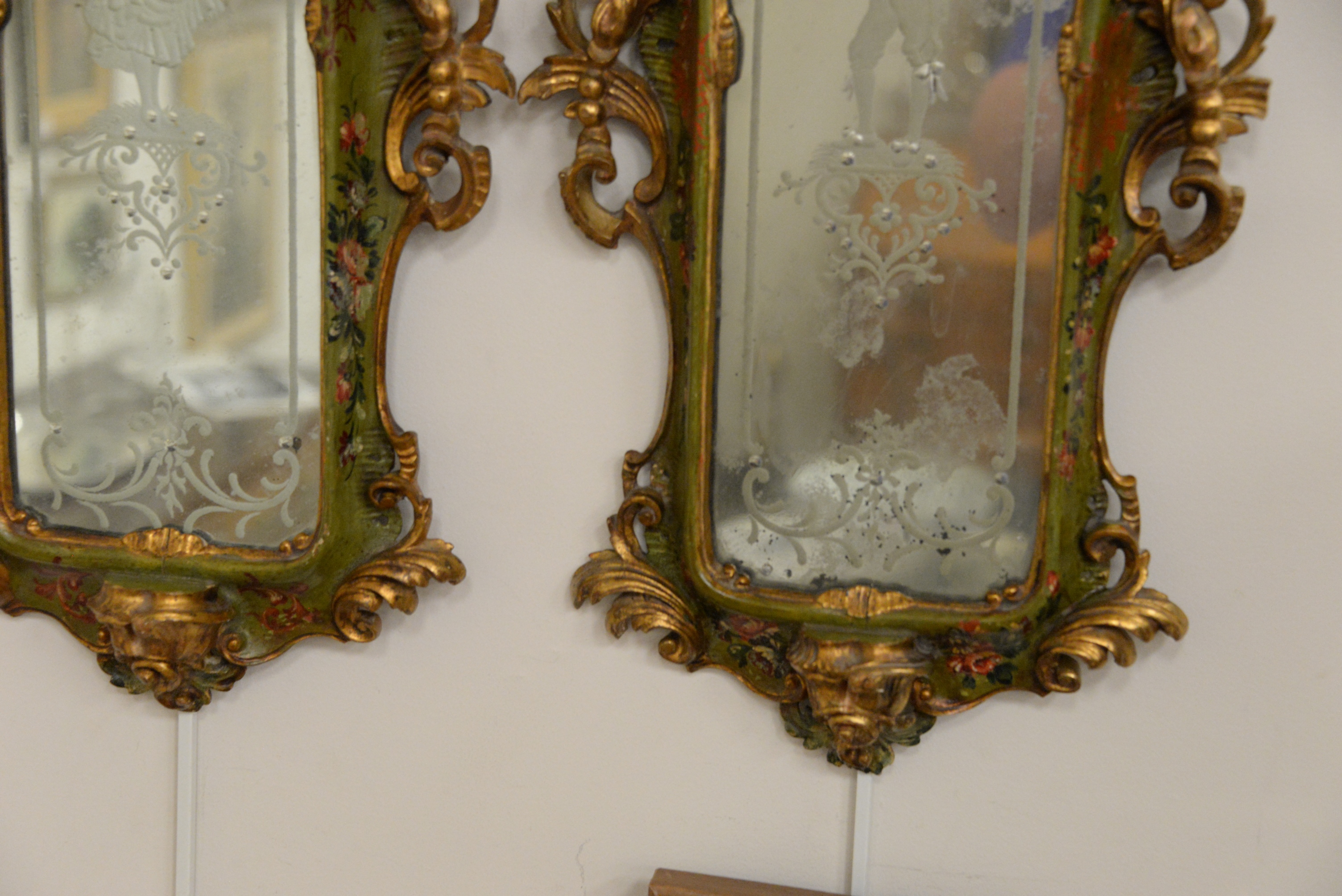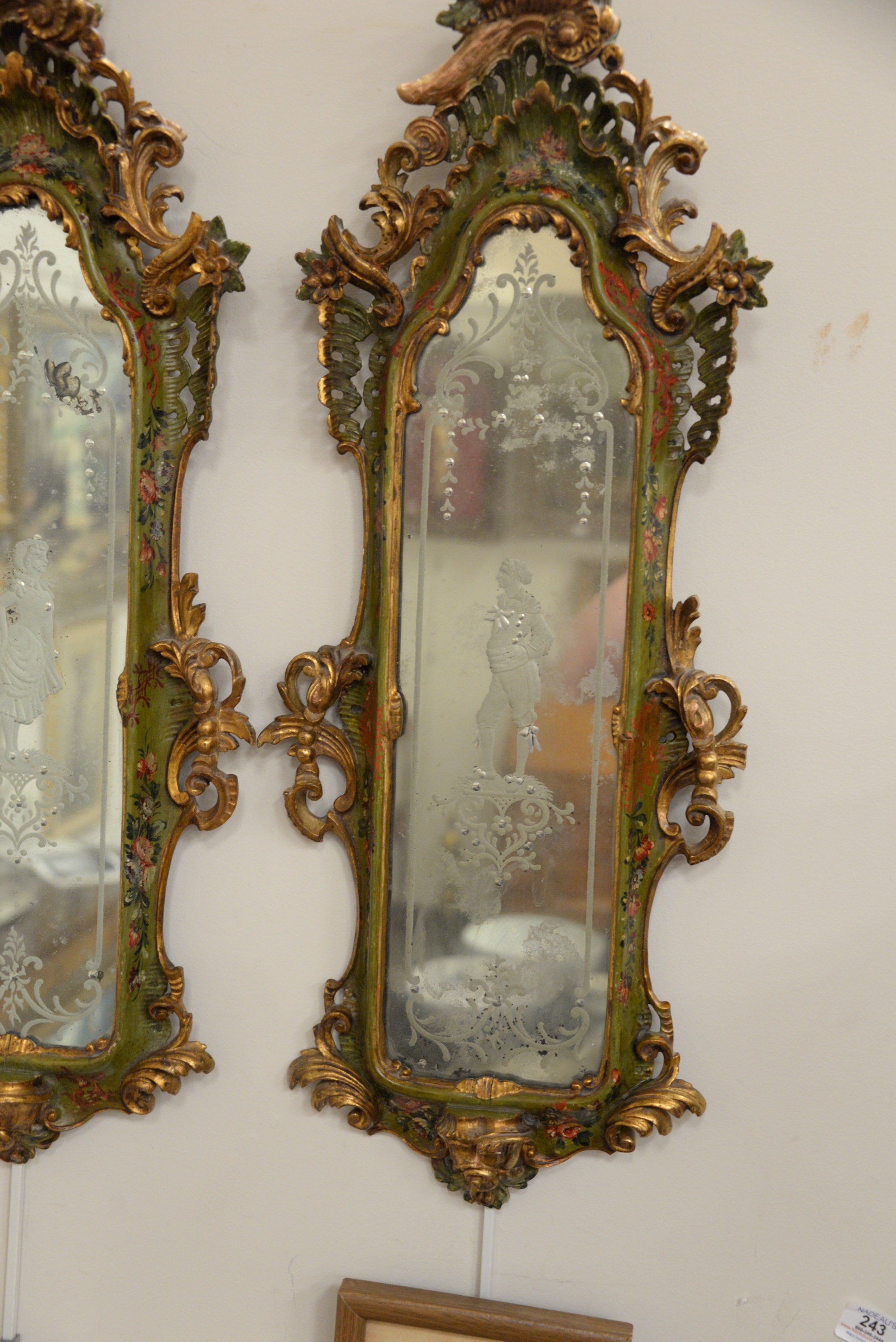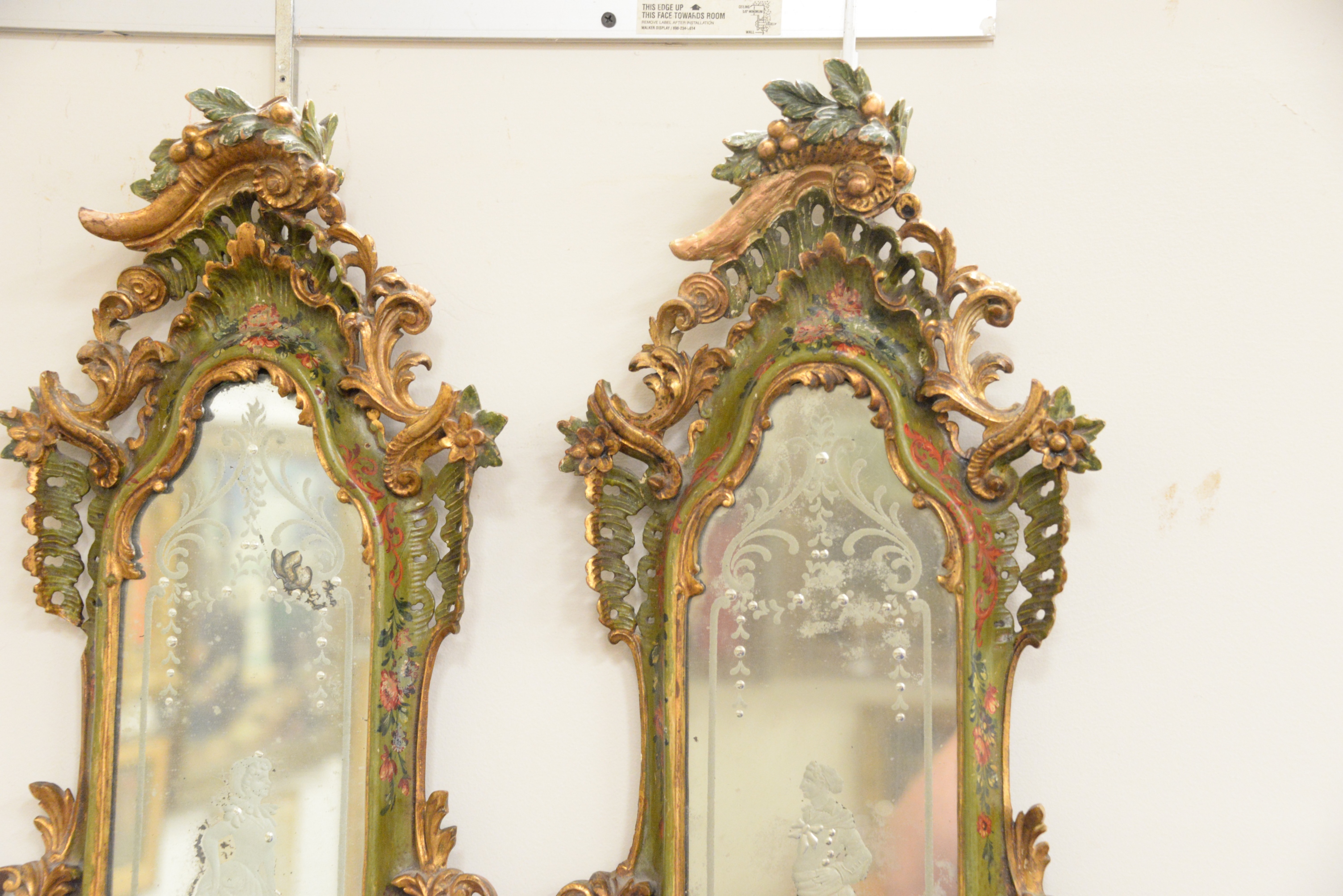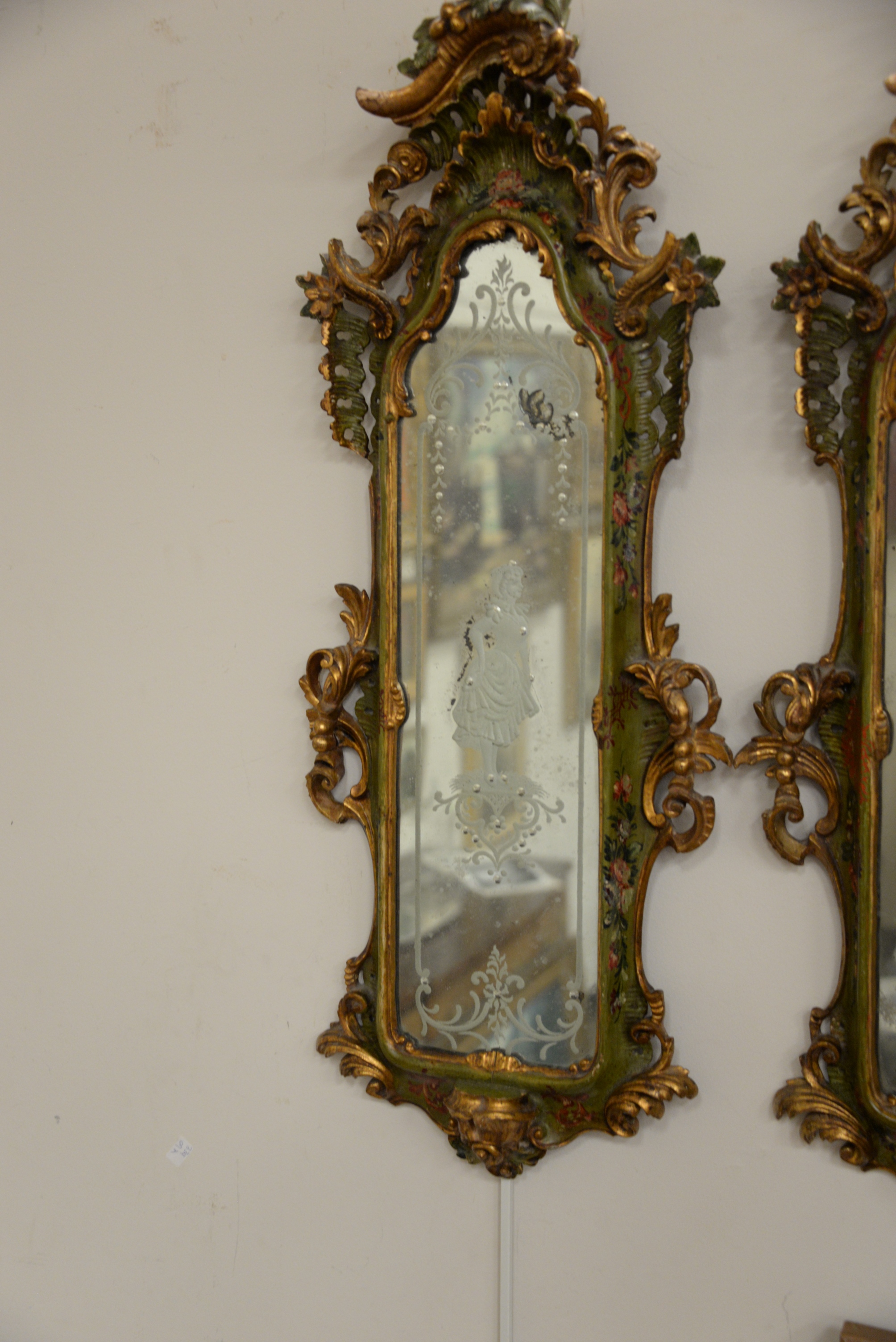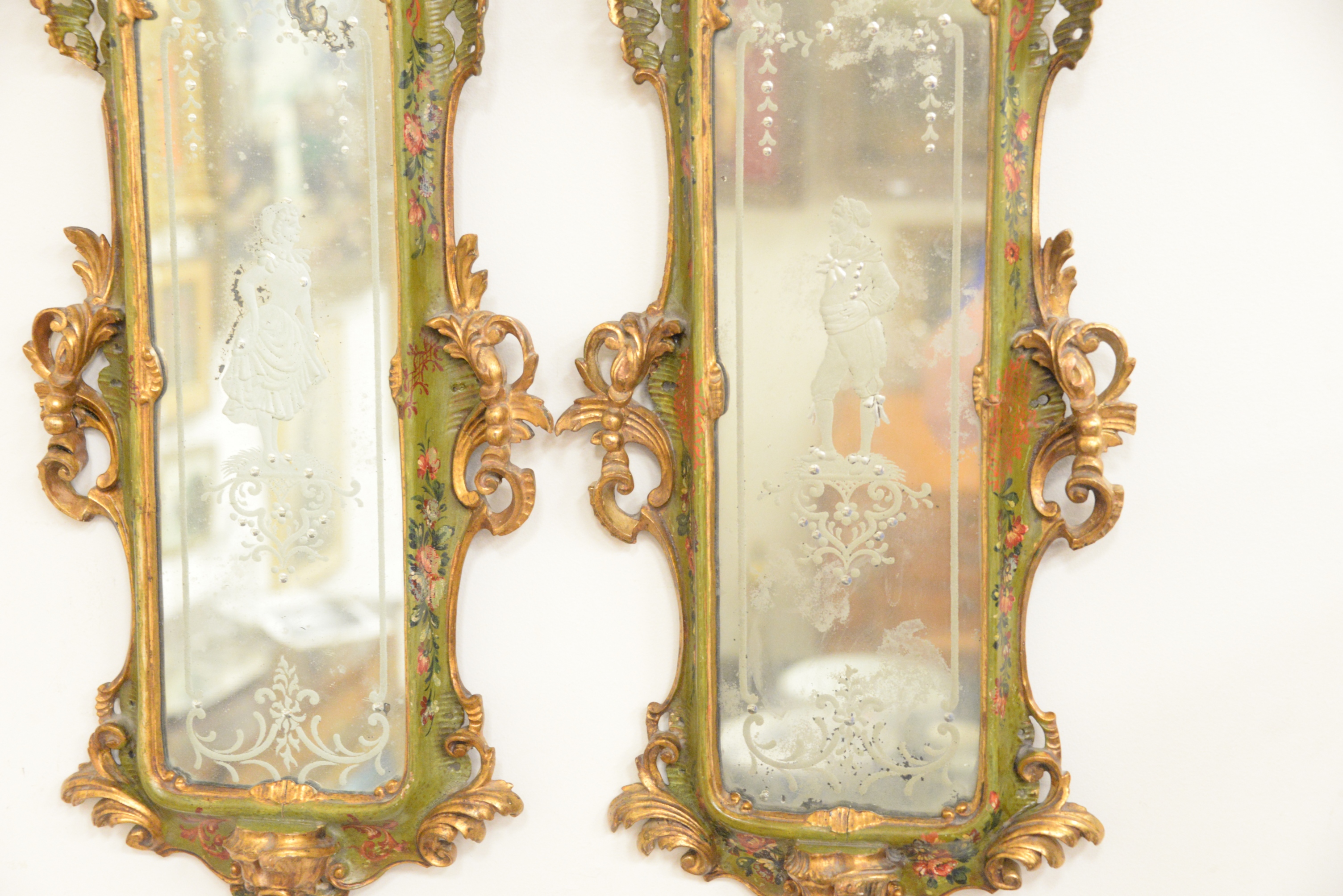 Pair of Venetian Style Carved Mirrors, each having etched figures man and woman, height 30 inches, width 12 inches.