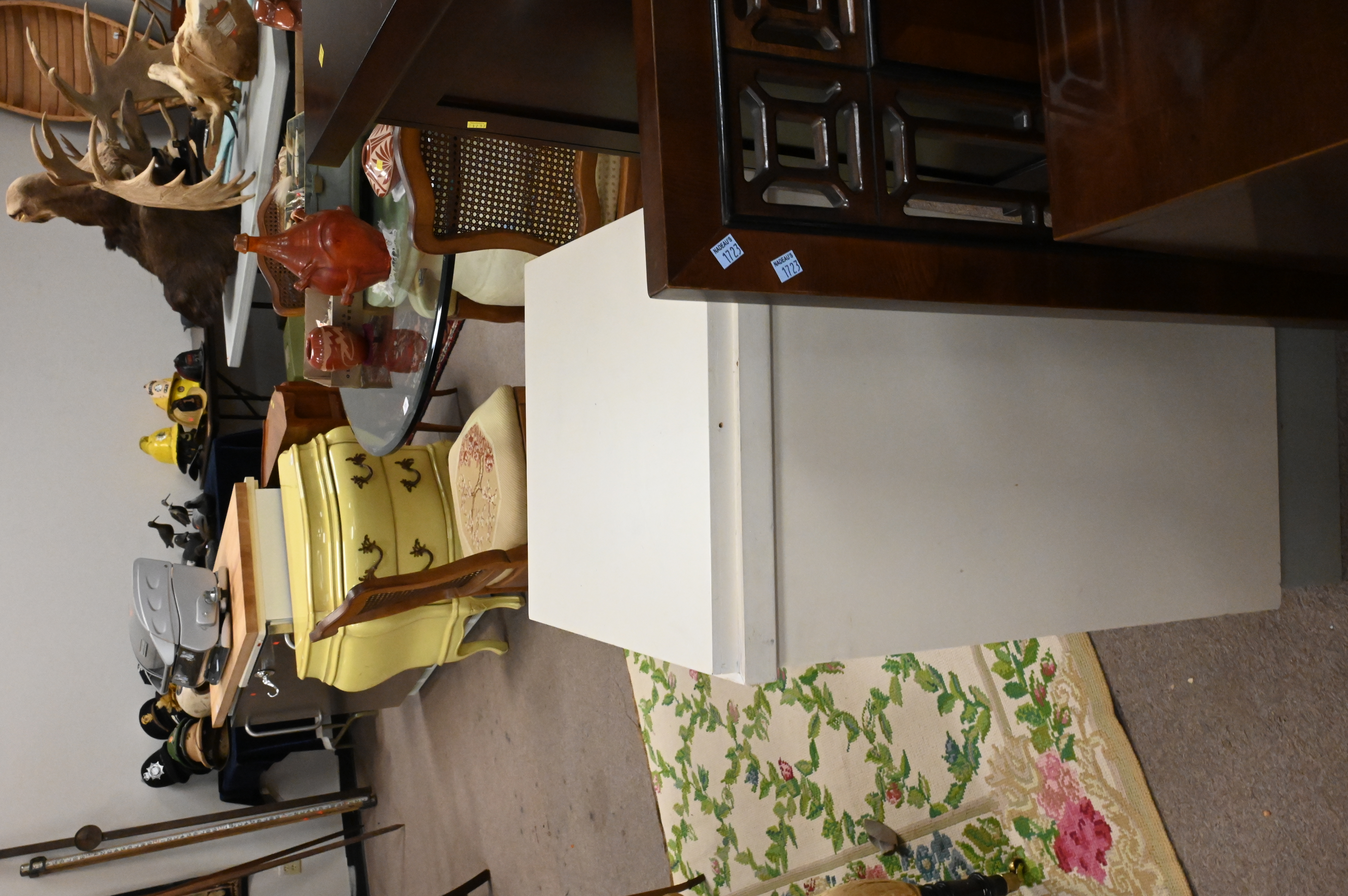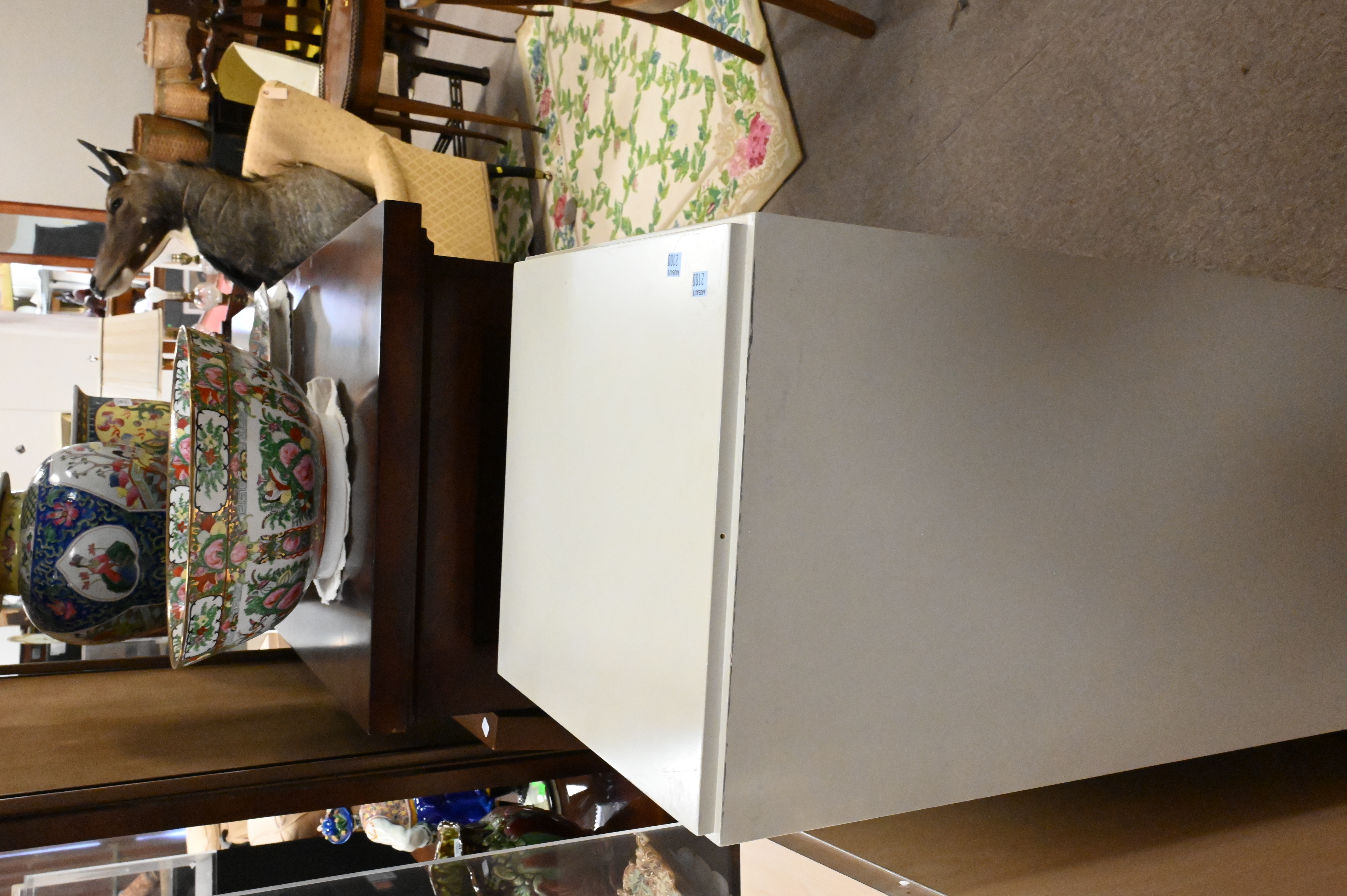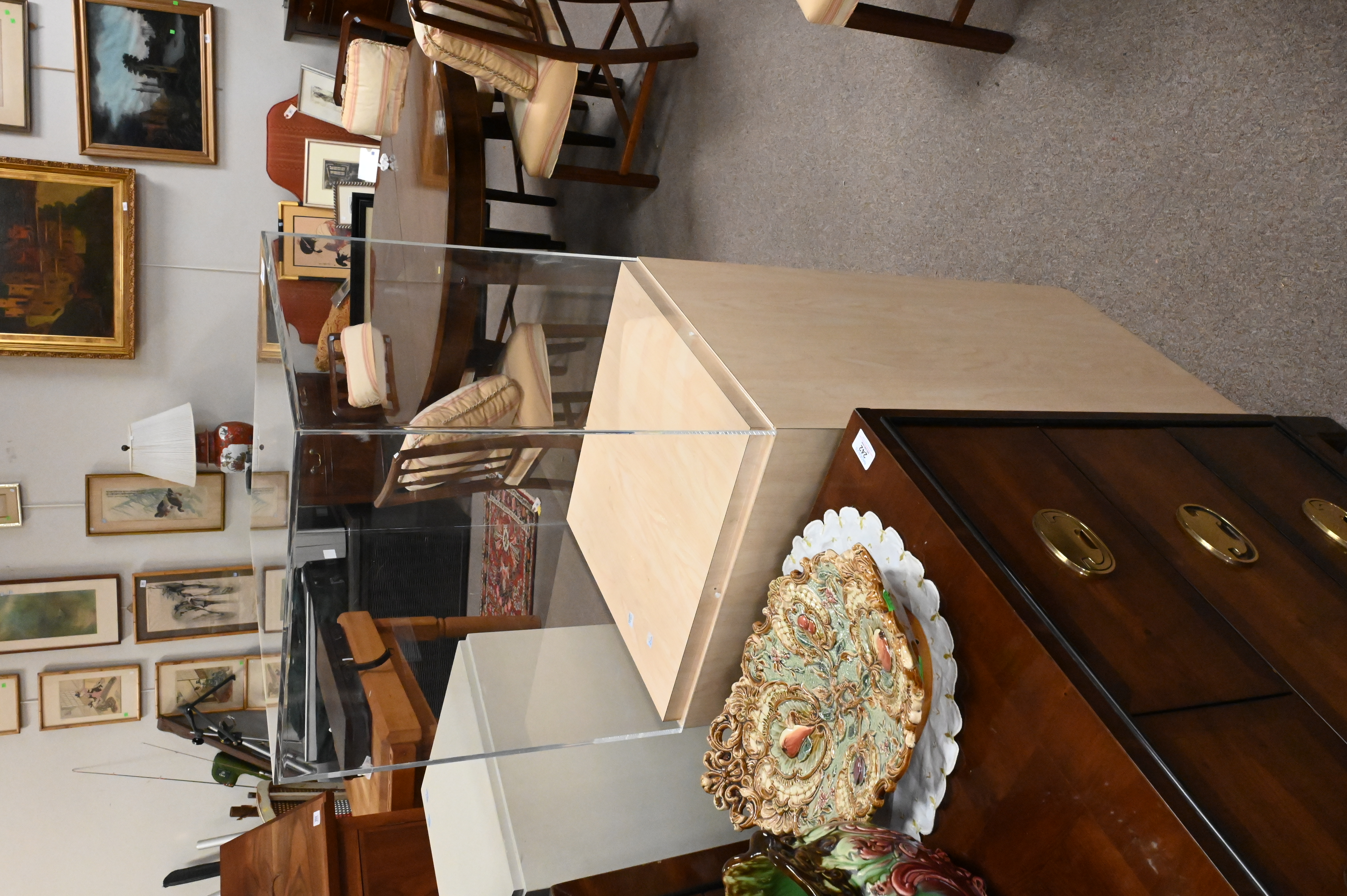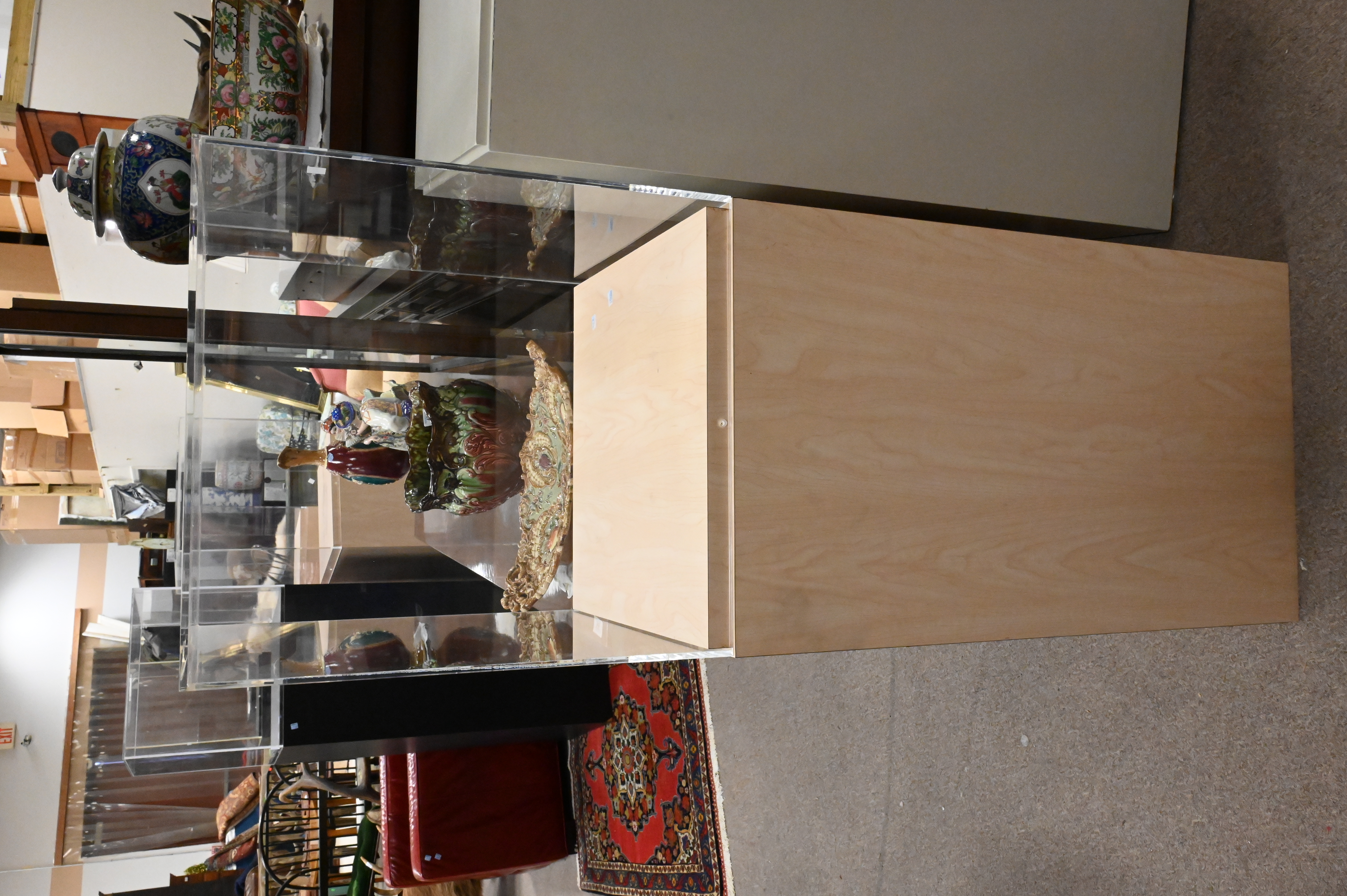 Three Display Pedestals, to include a pair along with one having clear Lucite/plastic top, dimensions of each are, height 41 inches, top 16″ x 16″, height 52 inches, top 18 1/2″ x 18 1/2″, heights 36 inches, top 16″ x 16″