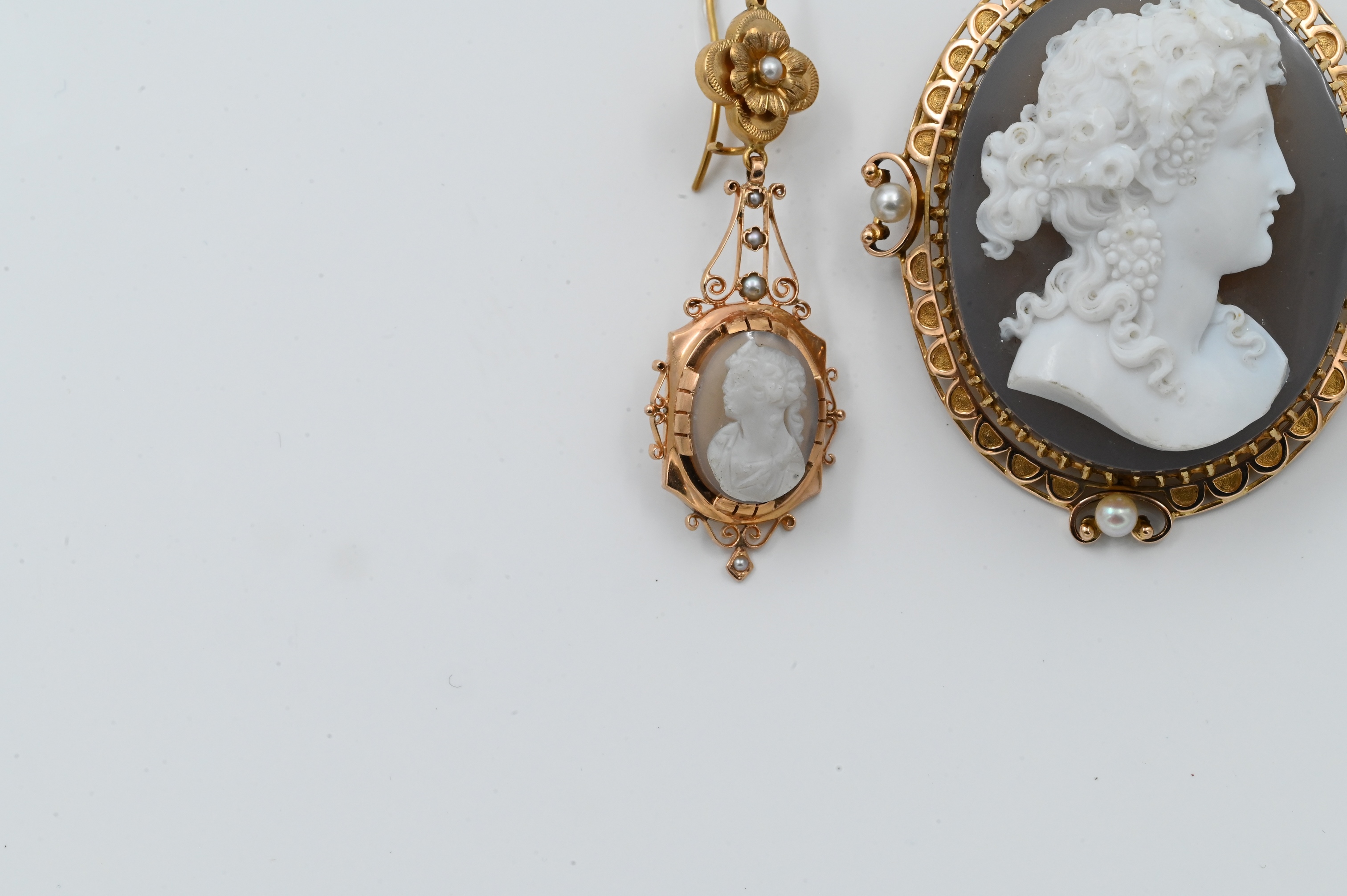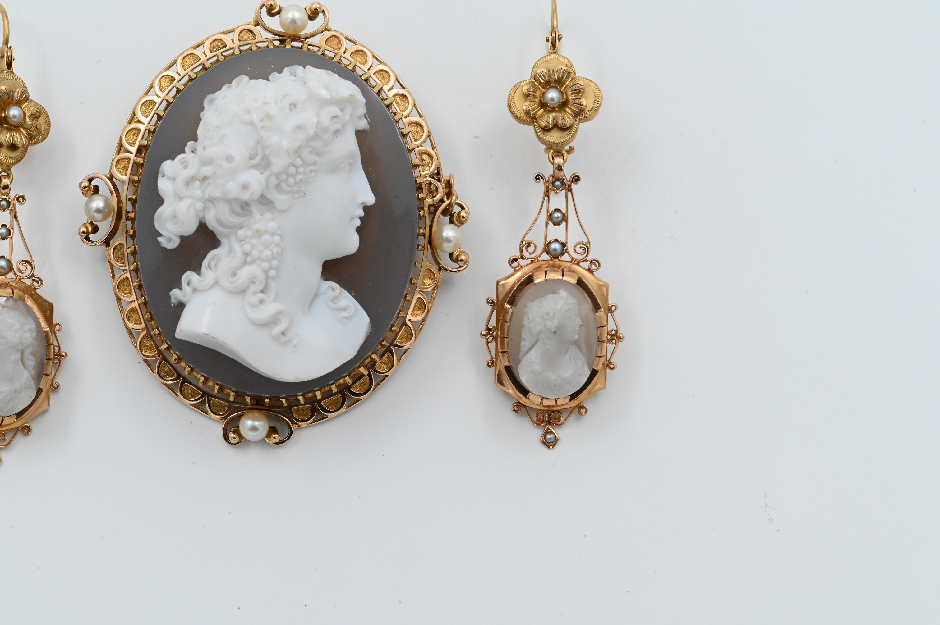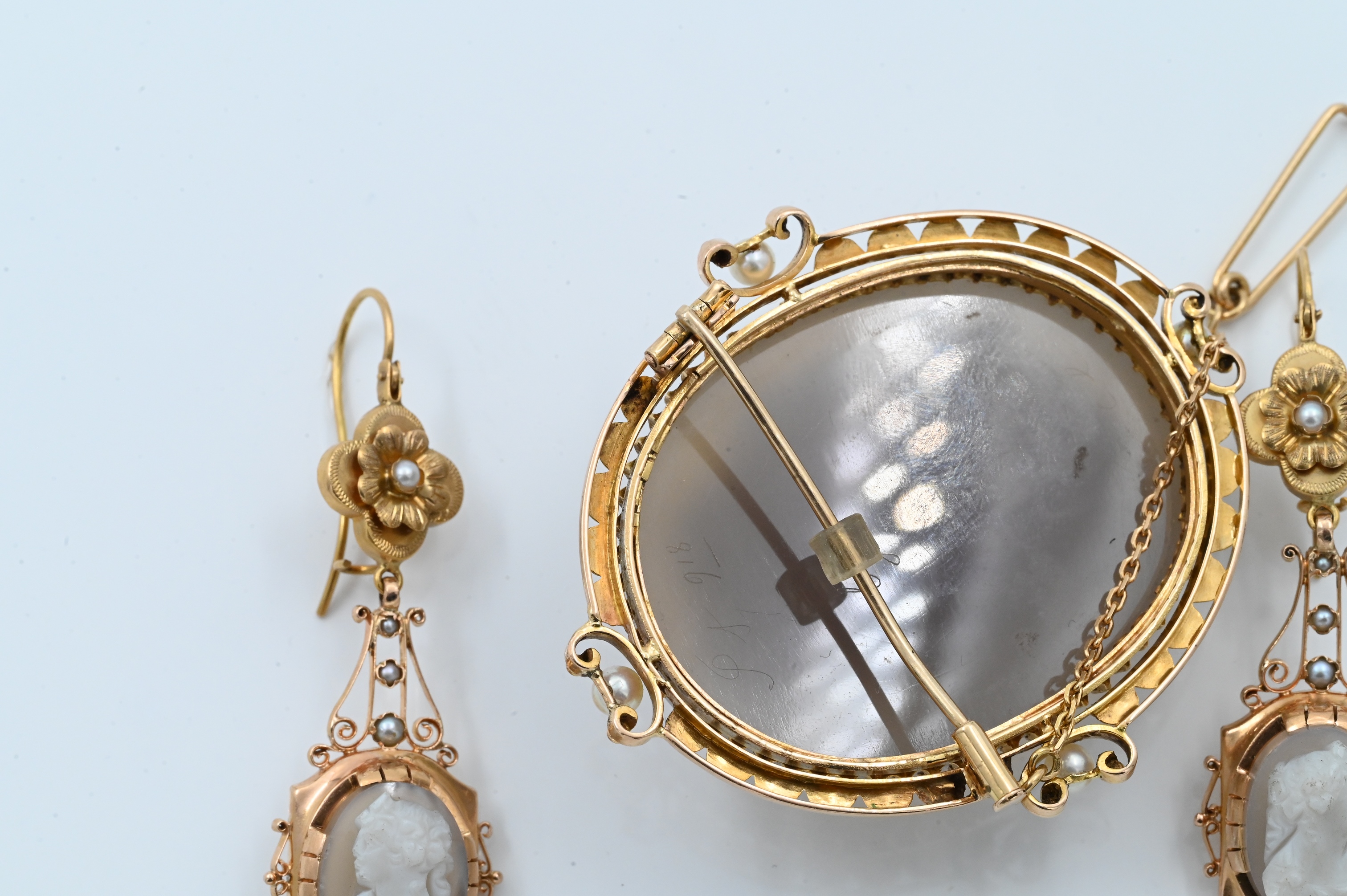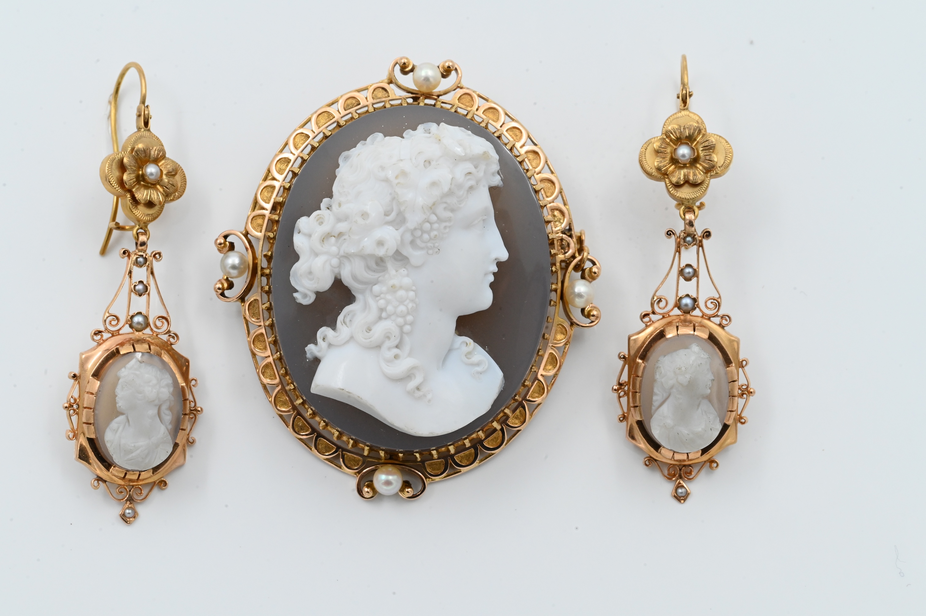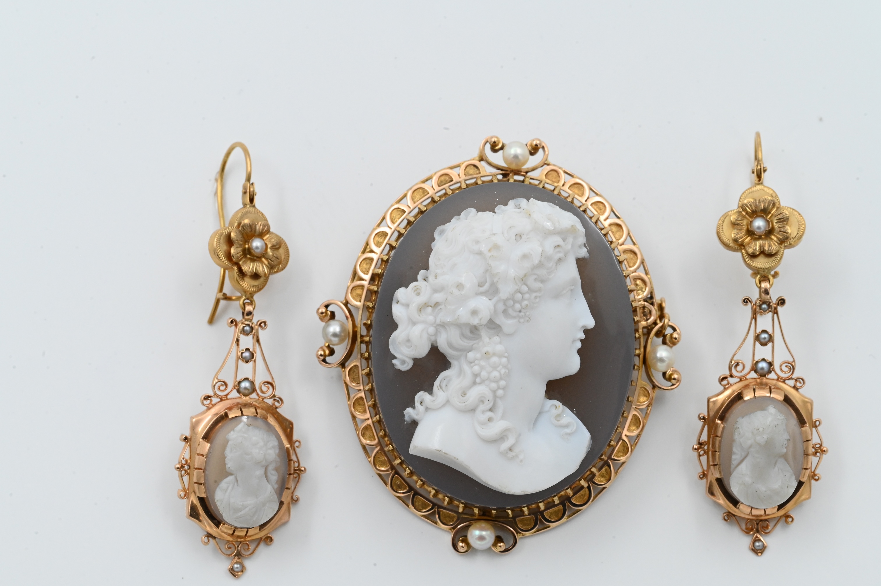 Lot 243: Three Piece 15K Yellow Gold and Stone Cameo Brooch and Pierced Earrings
