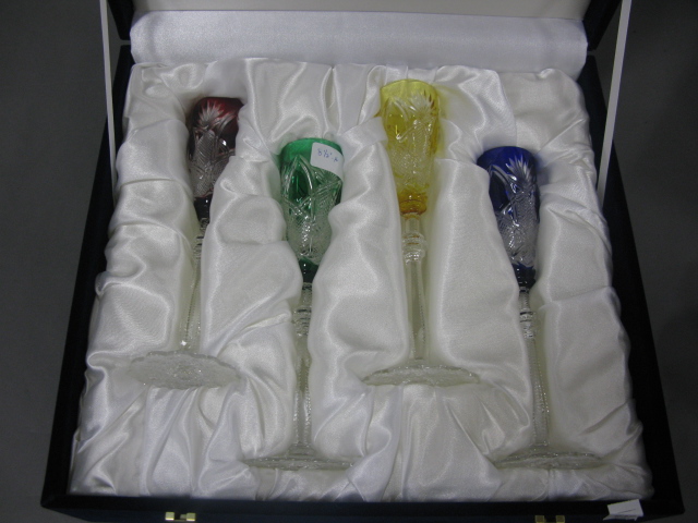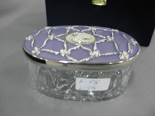 Two boxes of Faberge four colored to clear stems and a round crystal box with an enameled cover