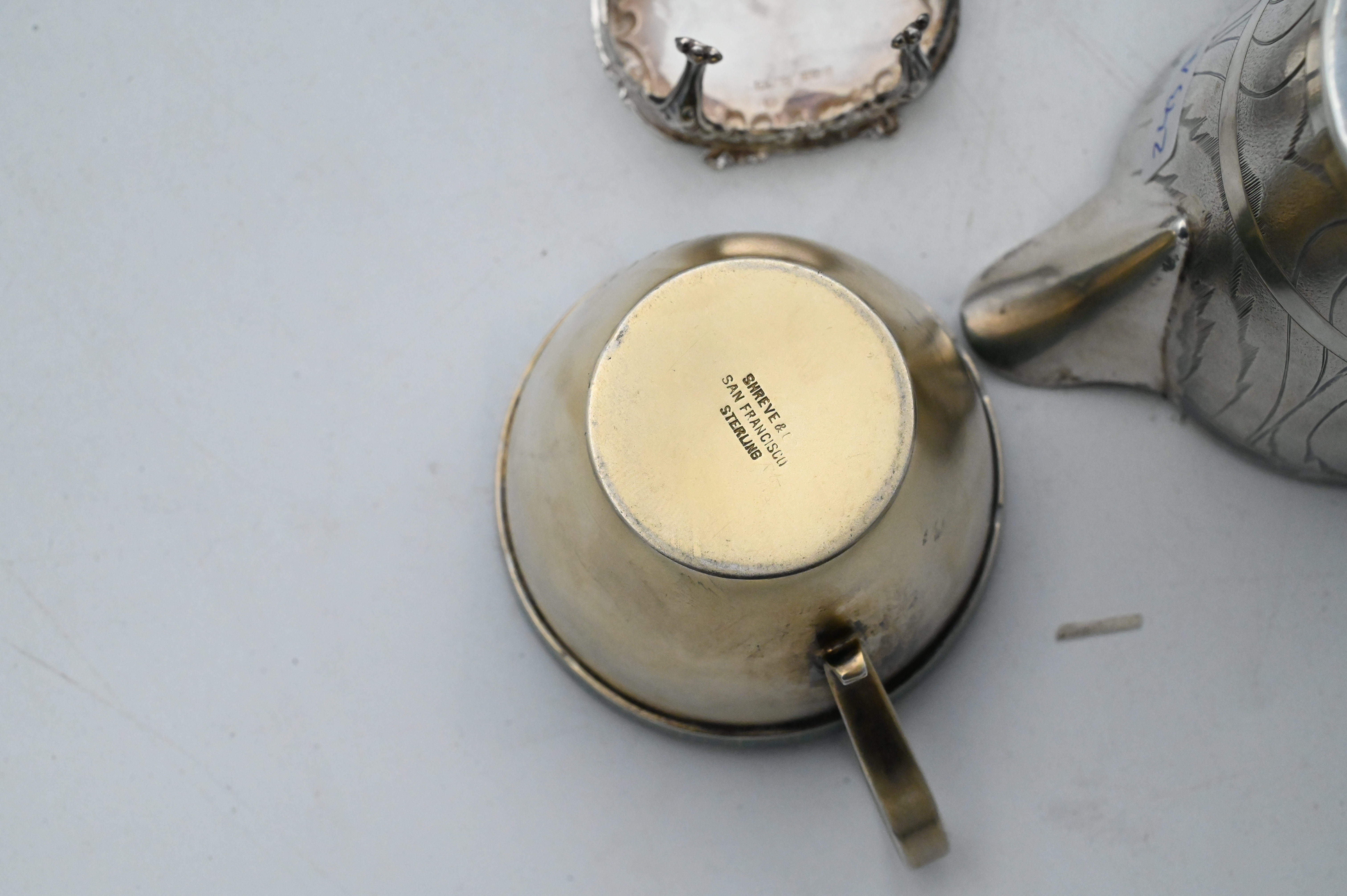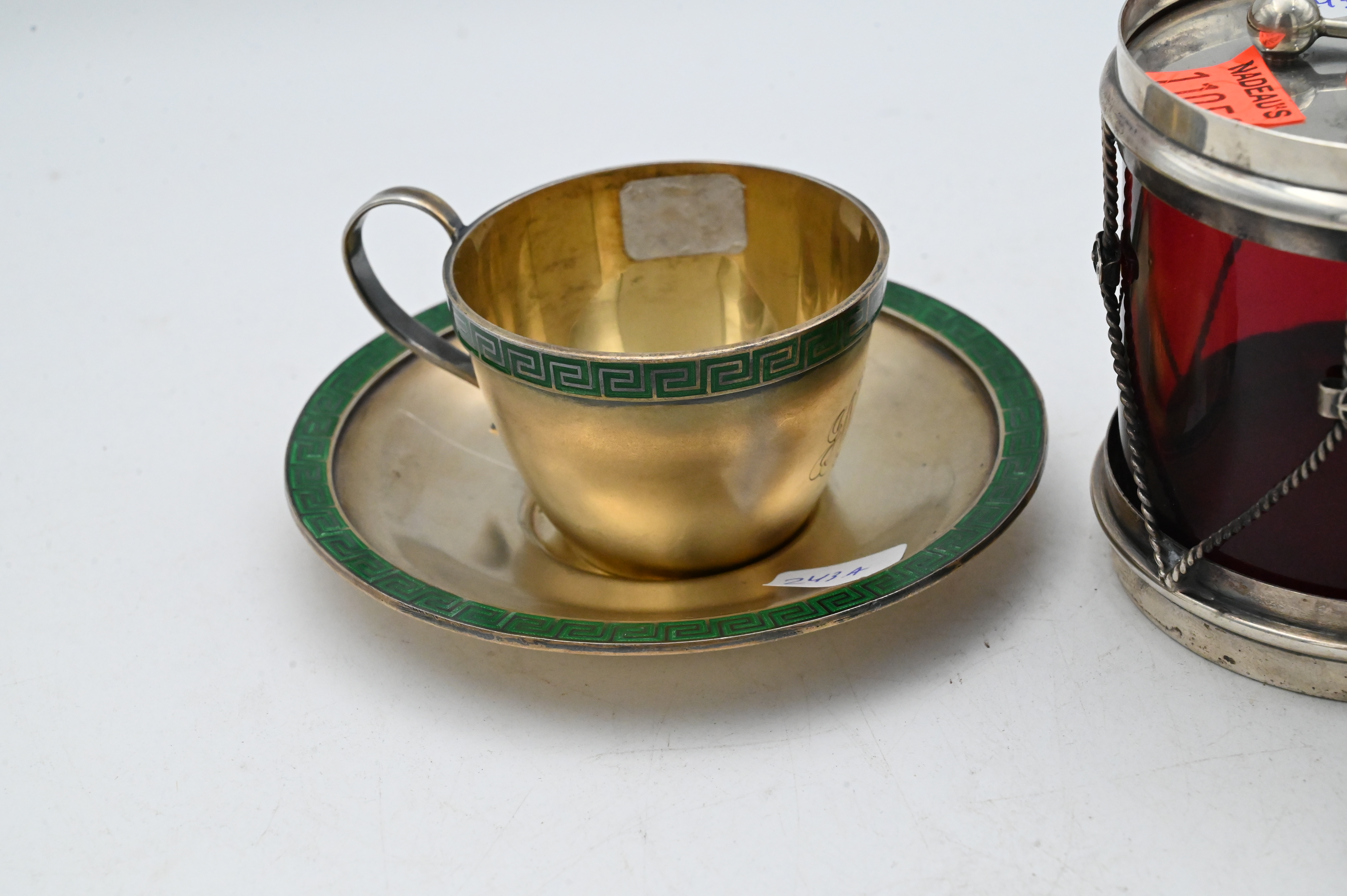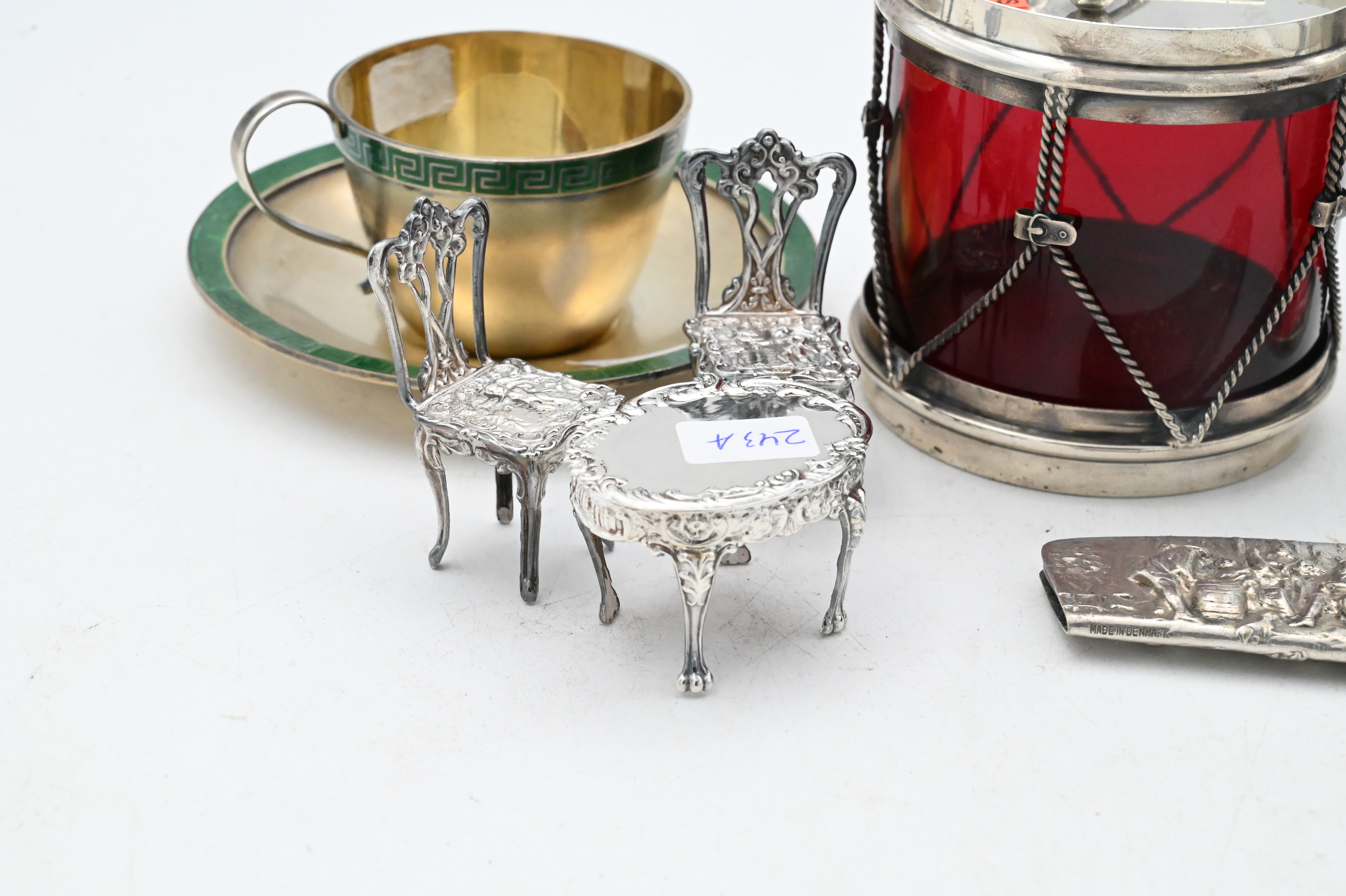 to include pair of small chairs and table, enamel tea cup and saucer by Shreve & Co., glass lined drum box, English pitcher, and continental comb