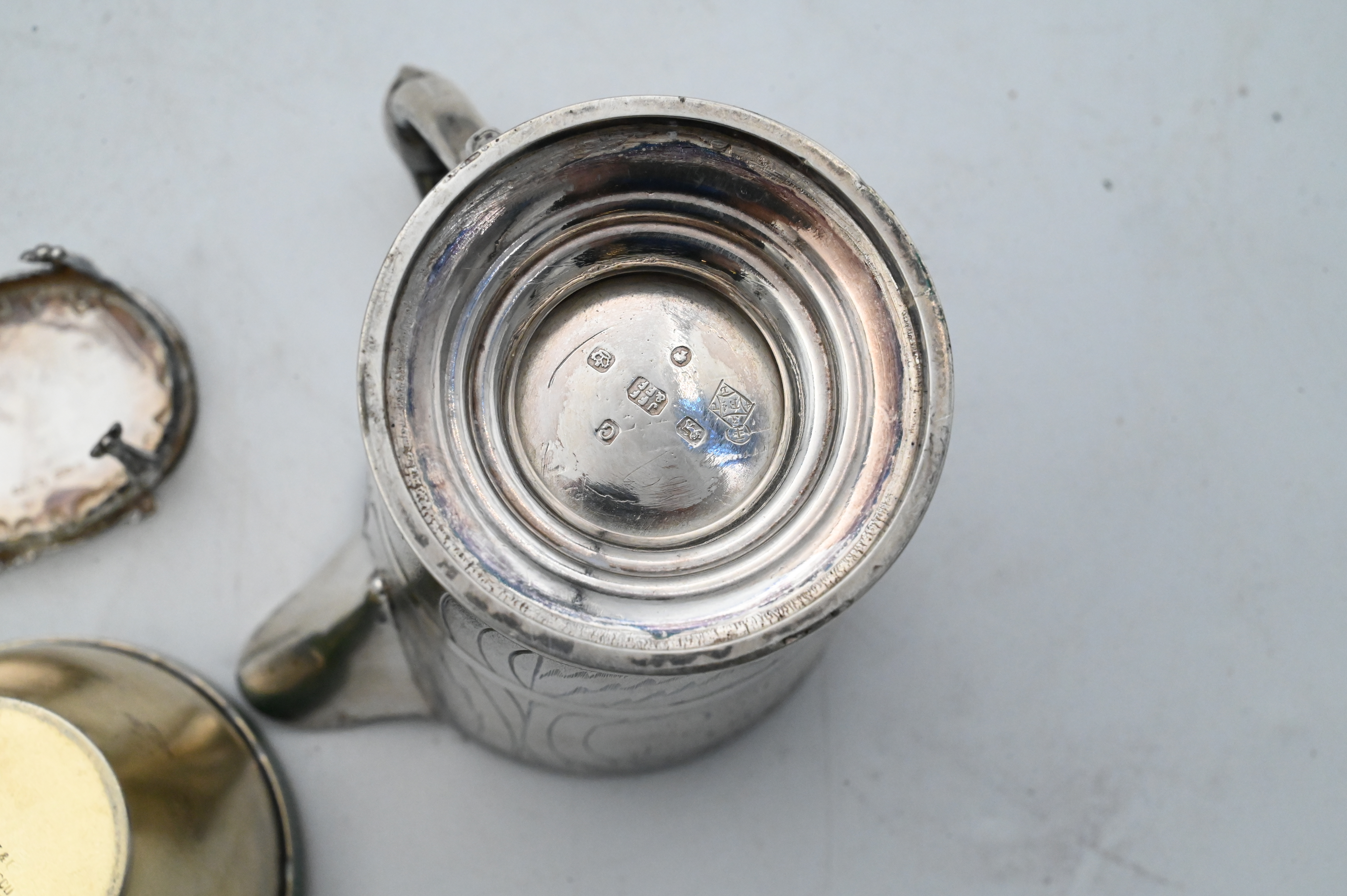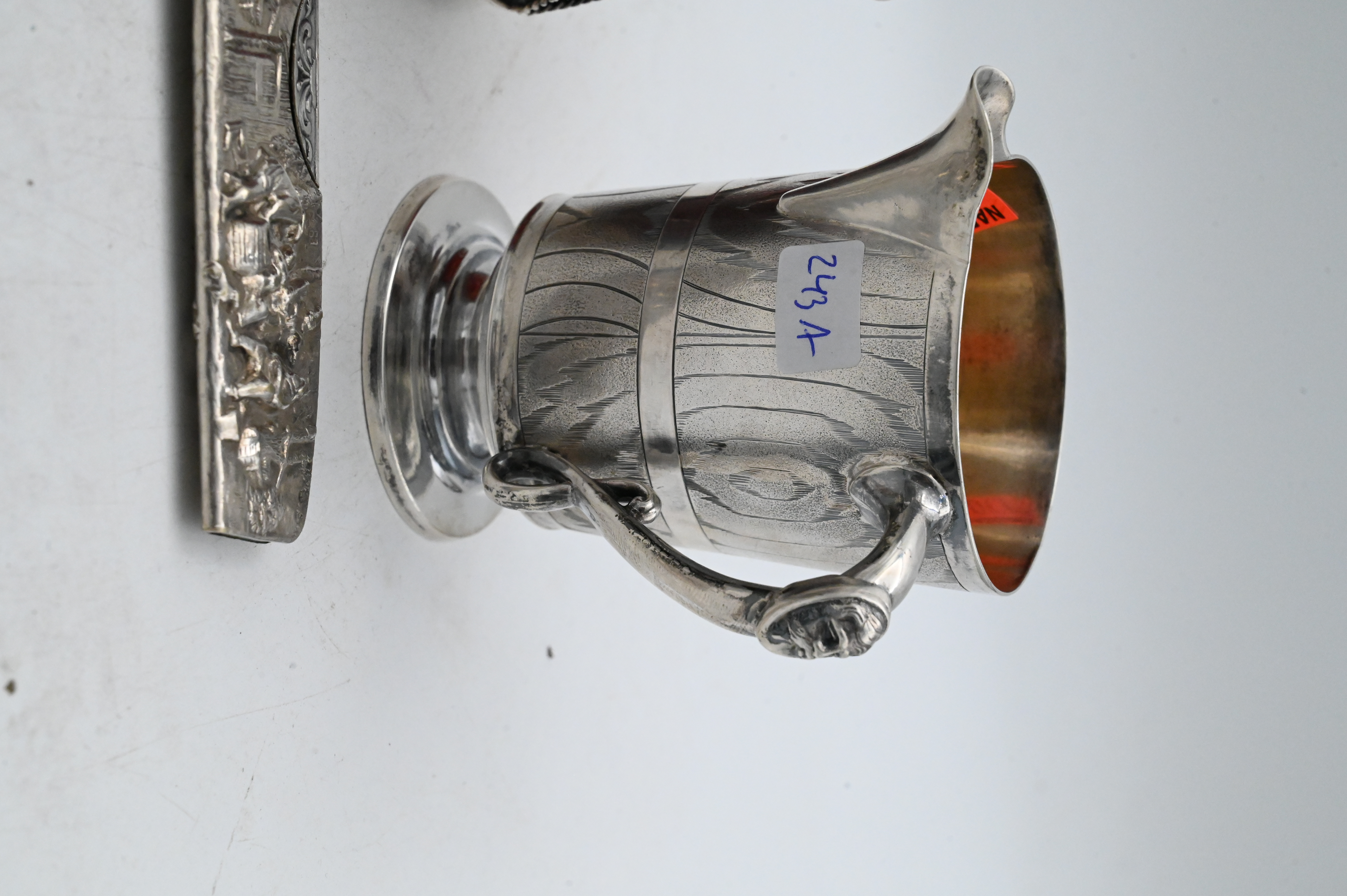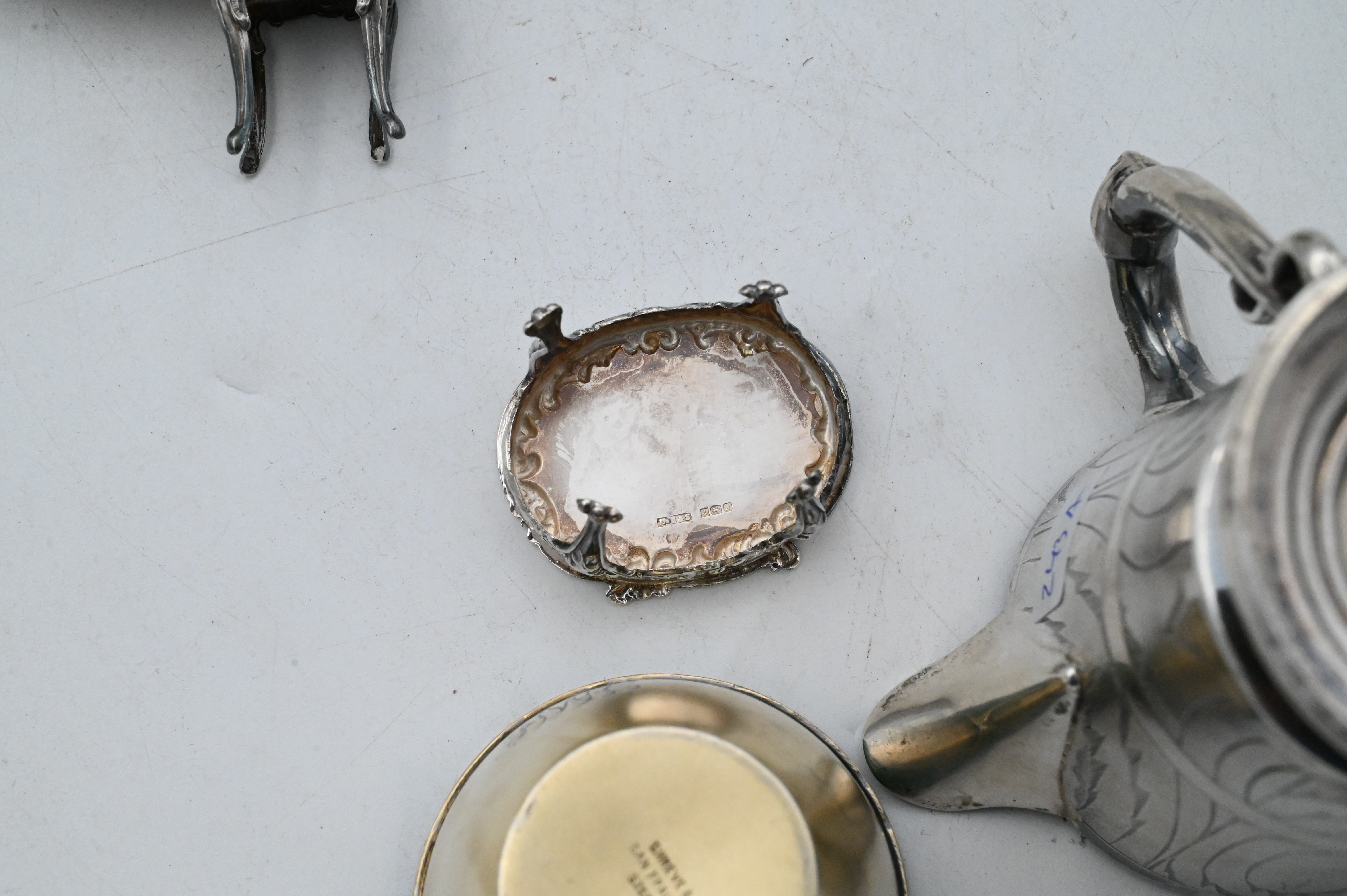to include pair of small chairs and table, enamel tea cup and saucer by Shreve & Co., glass lined drum box, English pitcher, and continental comb
