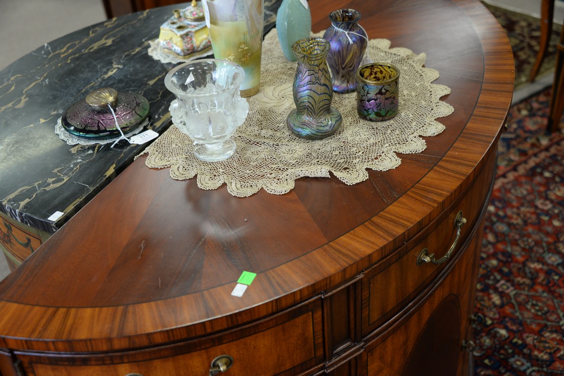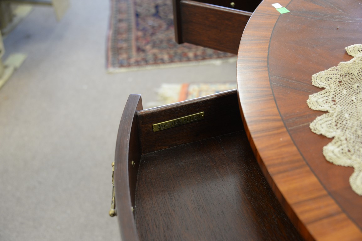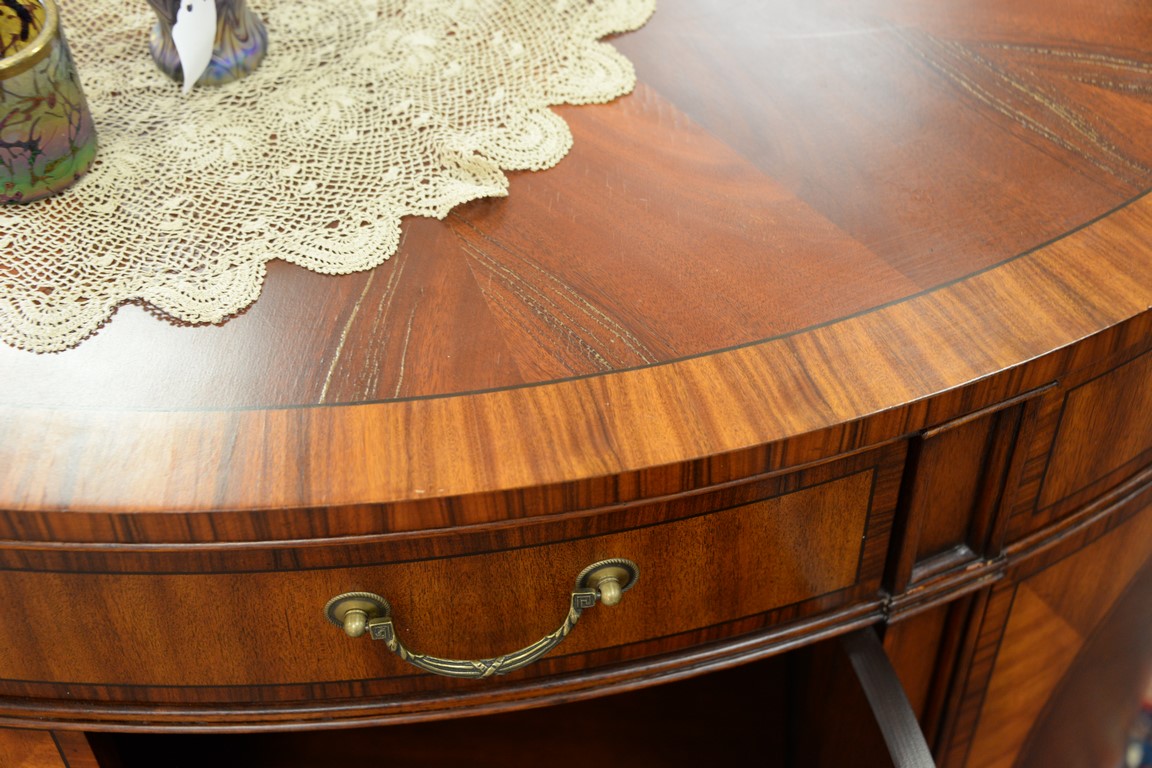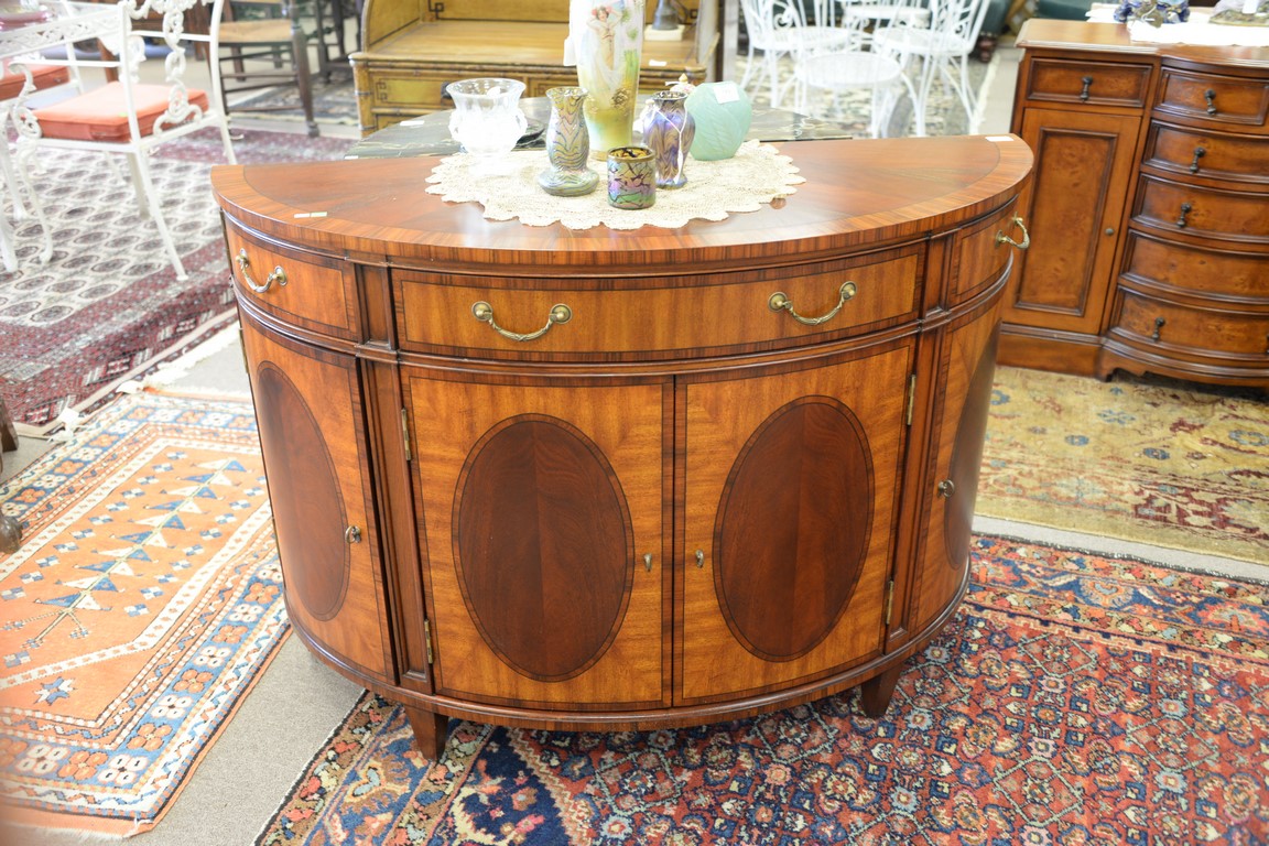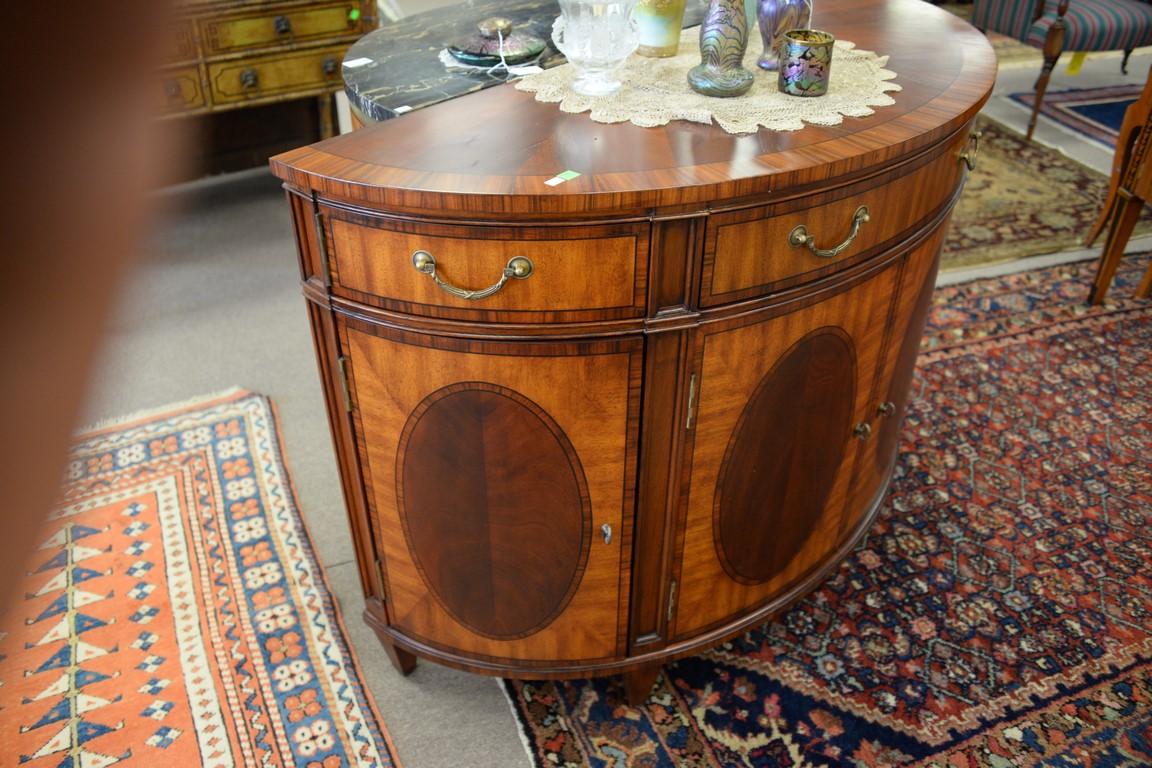 Lot 244: Ethan Allen inlaid mahogany demilune server with drawers and doors. ht. 36in., wd. 50in., dp. 19in.
