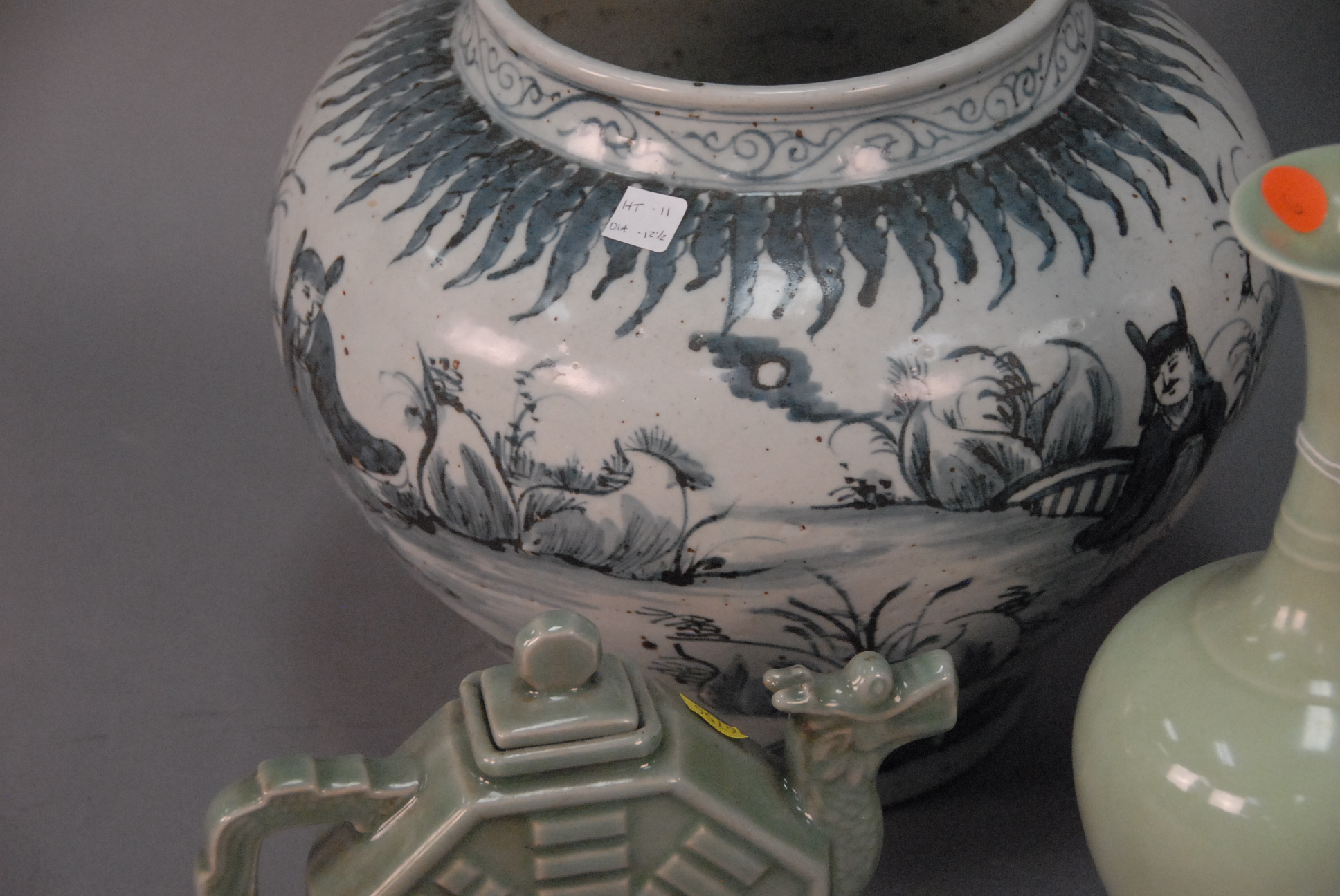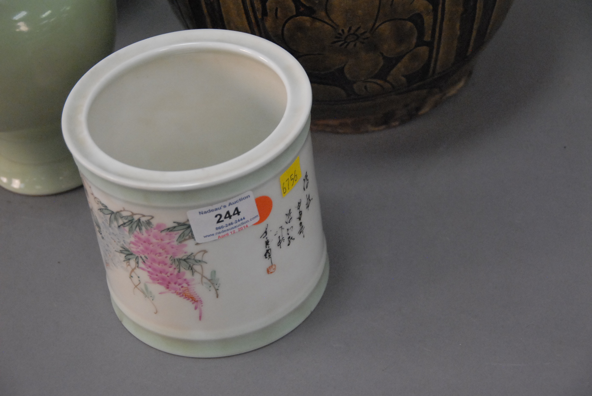 Five piece Chinese lot to include three vases, brush pot, and teapot.