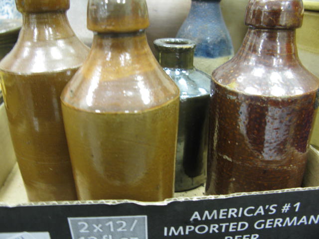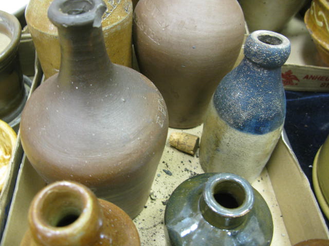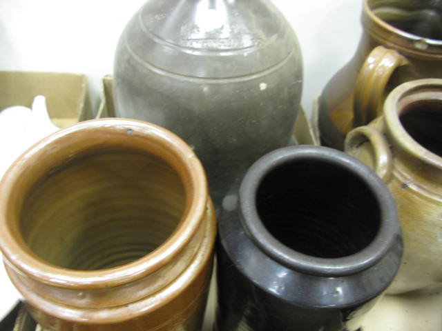Five small stoneware bottles, three medium sized stoneware bottles, two jars and large Bennington piece