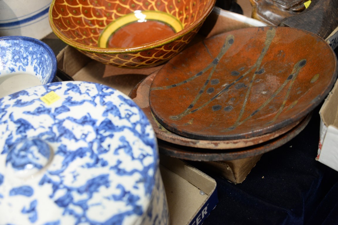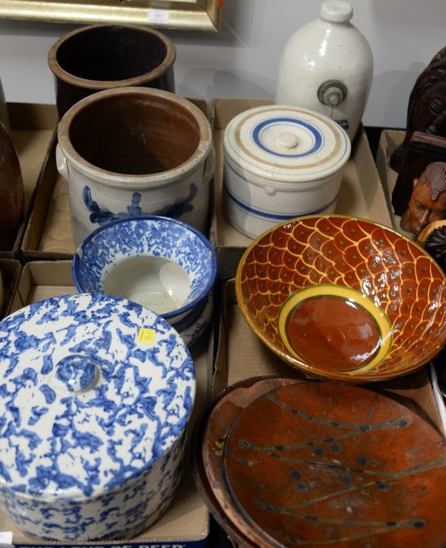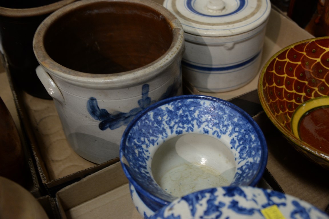 Four box lots including stoneware, sponge decorated two pieces, and slip decorated redware. Provenance: Estate of Arthur C. Pinto, MD