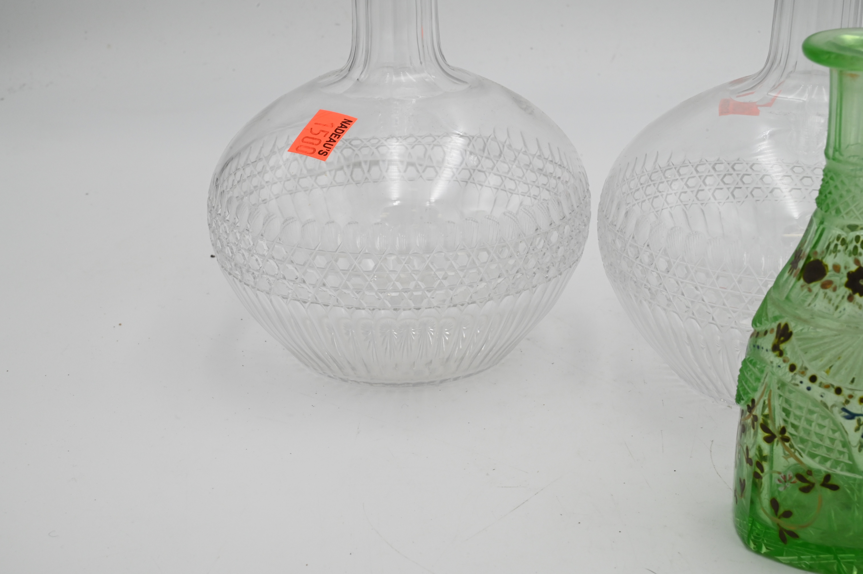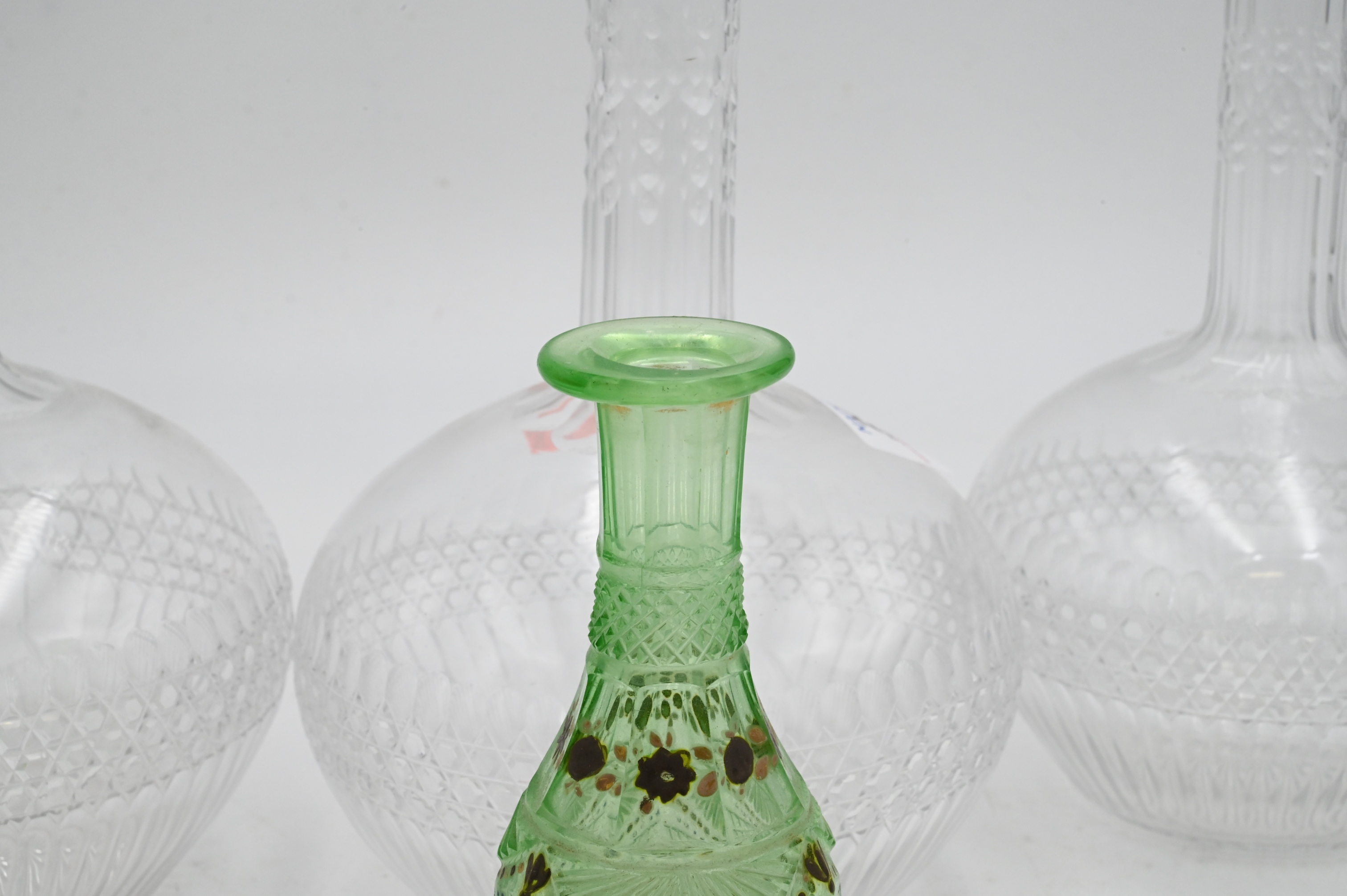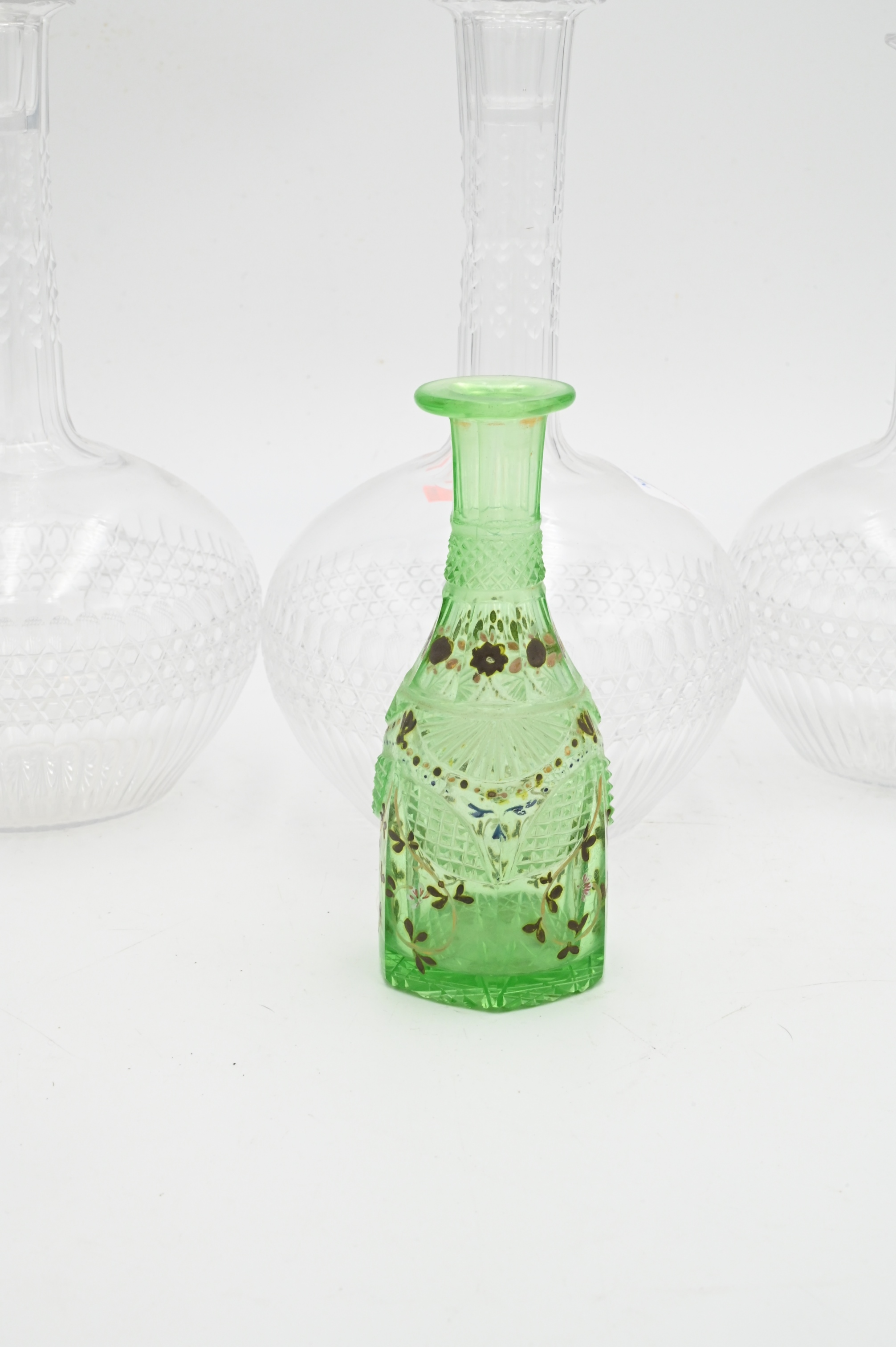 Four Glass Bottles, to include a set of three cut crystal bottles having long necks and stoppers, along with a small green bottle, heights 5 1/2 – 11 1/2 inches.