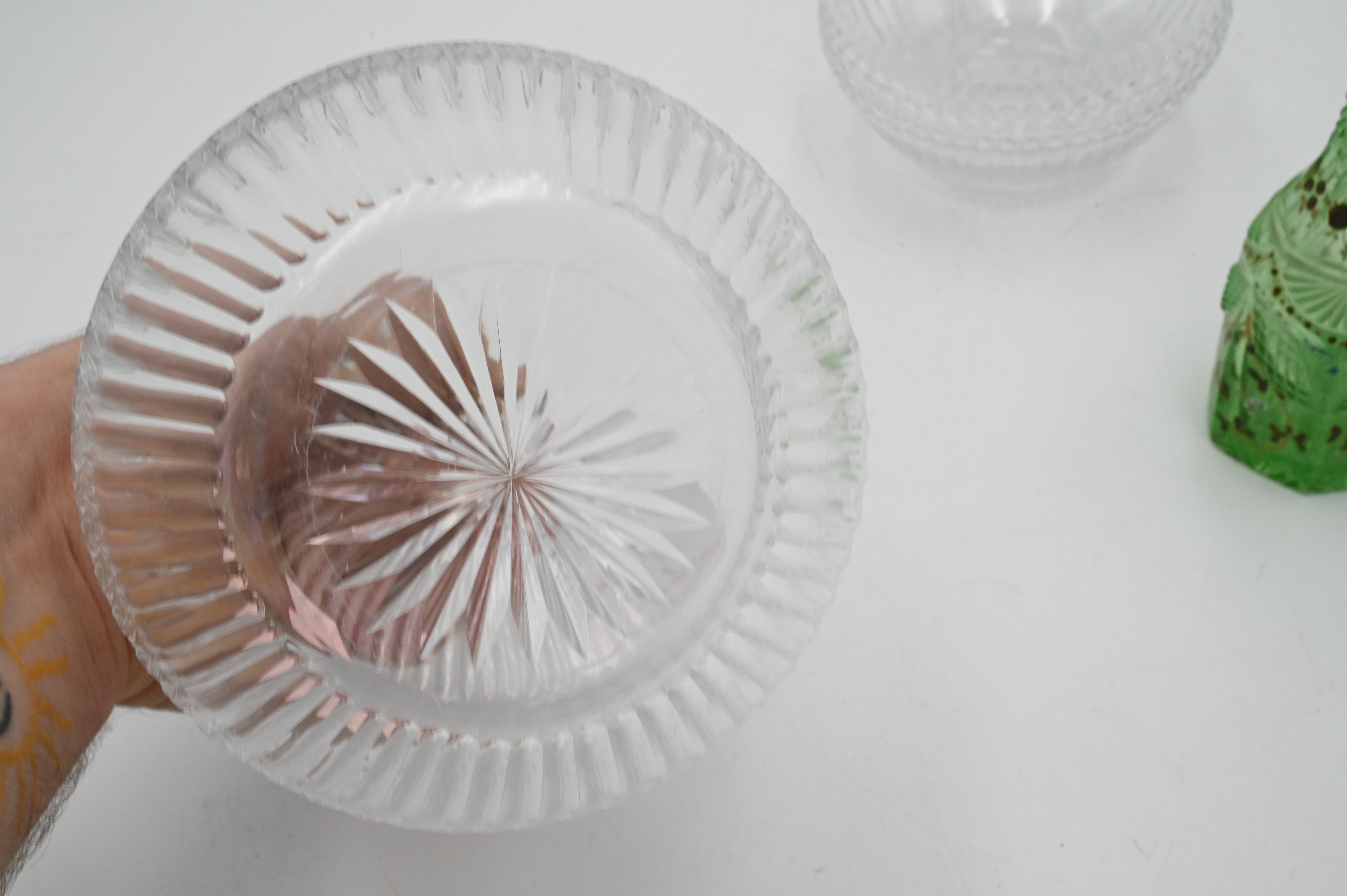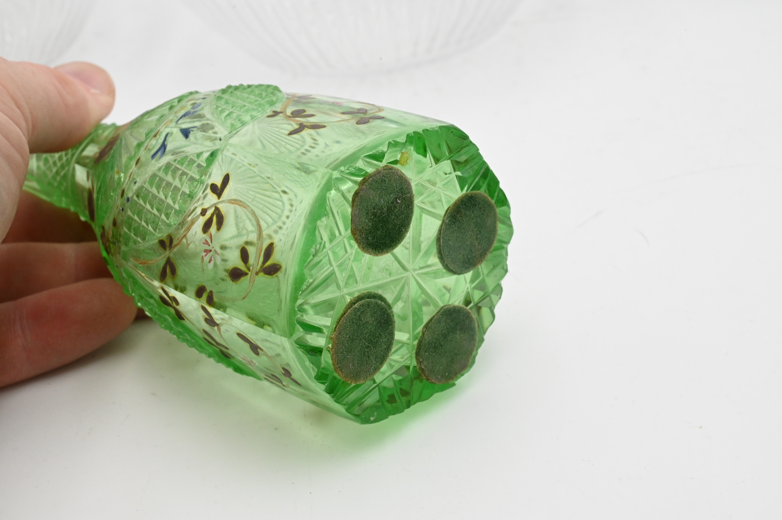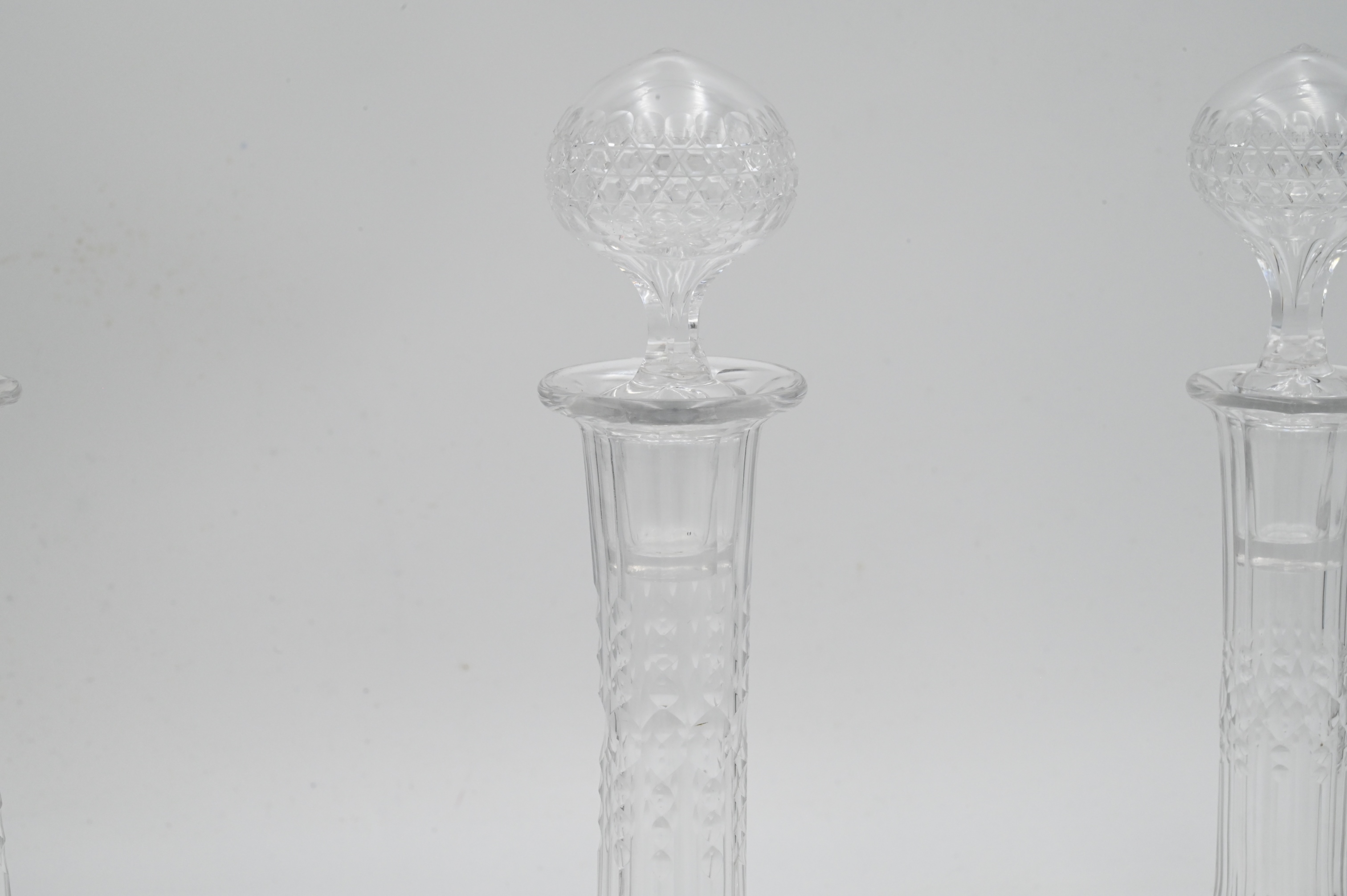 Four Glass Bottles, to include a set of three cut crystal bottles having long necks and stoppers, along with a small green bottle, heights 5 1/2 – 11 1/2 inches.