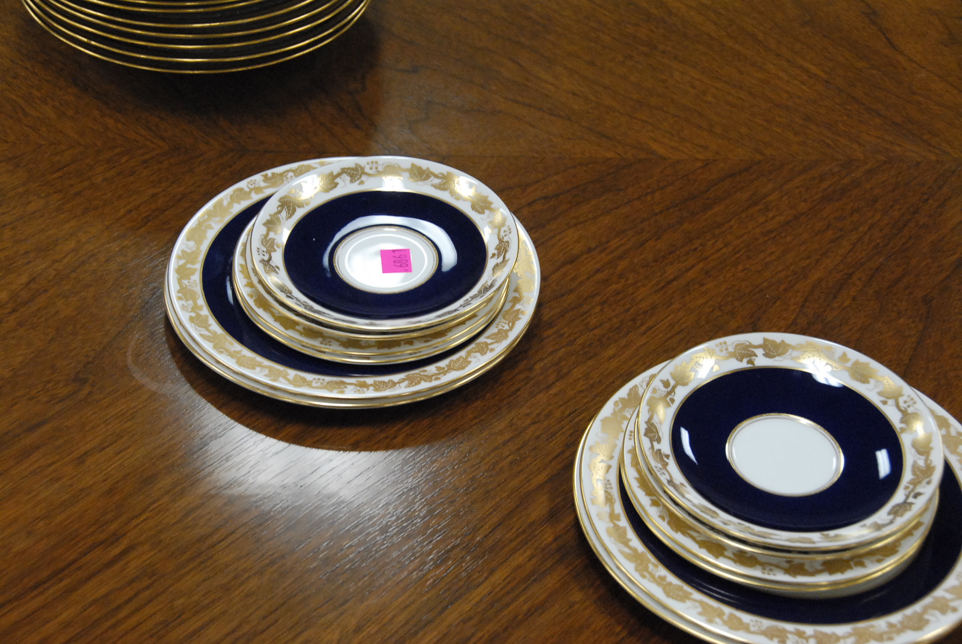 Lot 244: Group lot of china to include Minton plate with cobalt border and Wedgwood bone china dessert set for 12 including tray, cups, sauce…