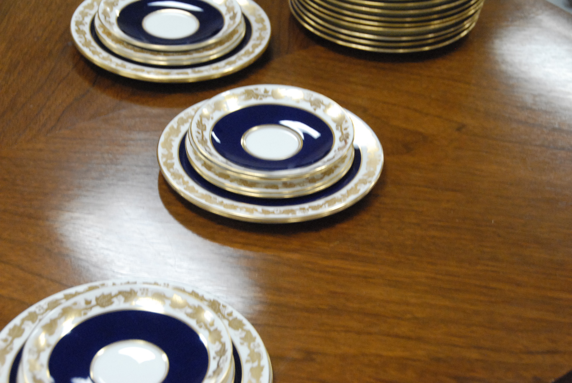 Group lot of china to include Minton plate with cobalt border and Wedgwood bone china dessert set for 12 including tray, cups, saucers, bread plates, and dessert plates.
