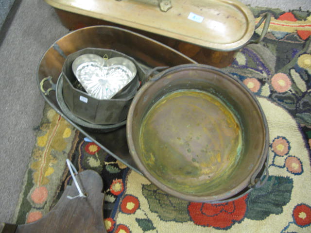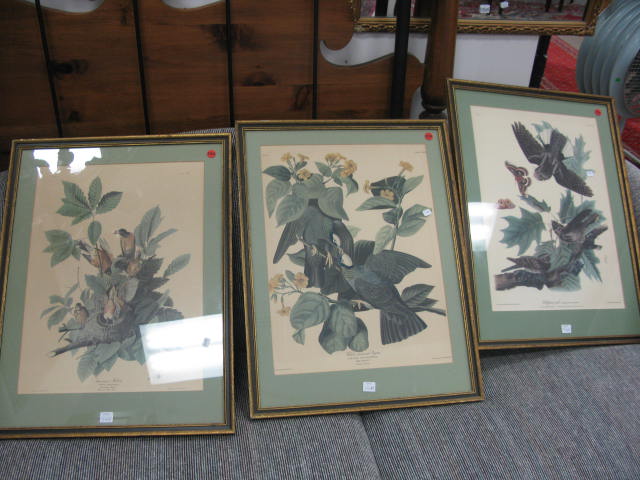 Group lot to include three bird prints, hanging cabinet and several pieces of copper