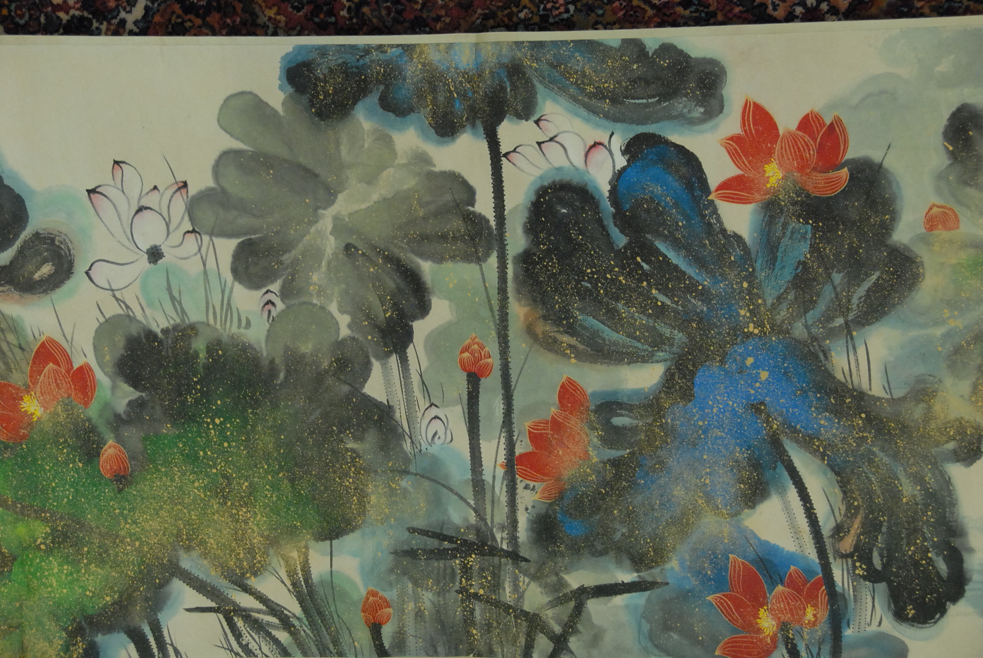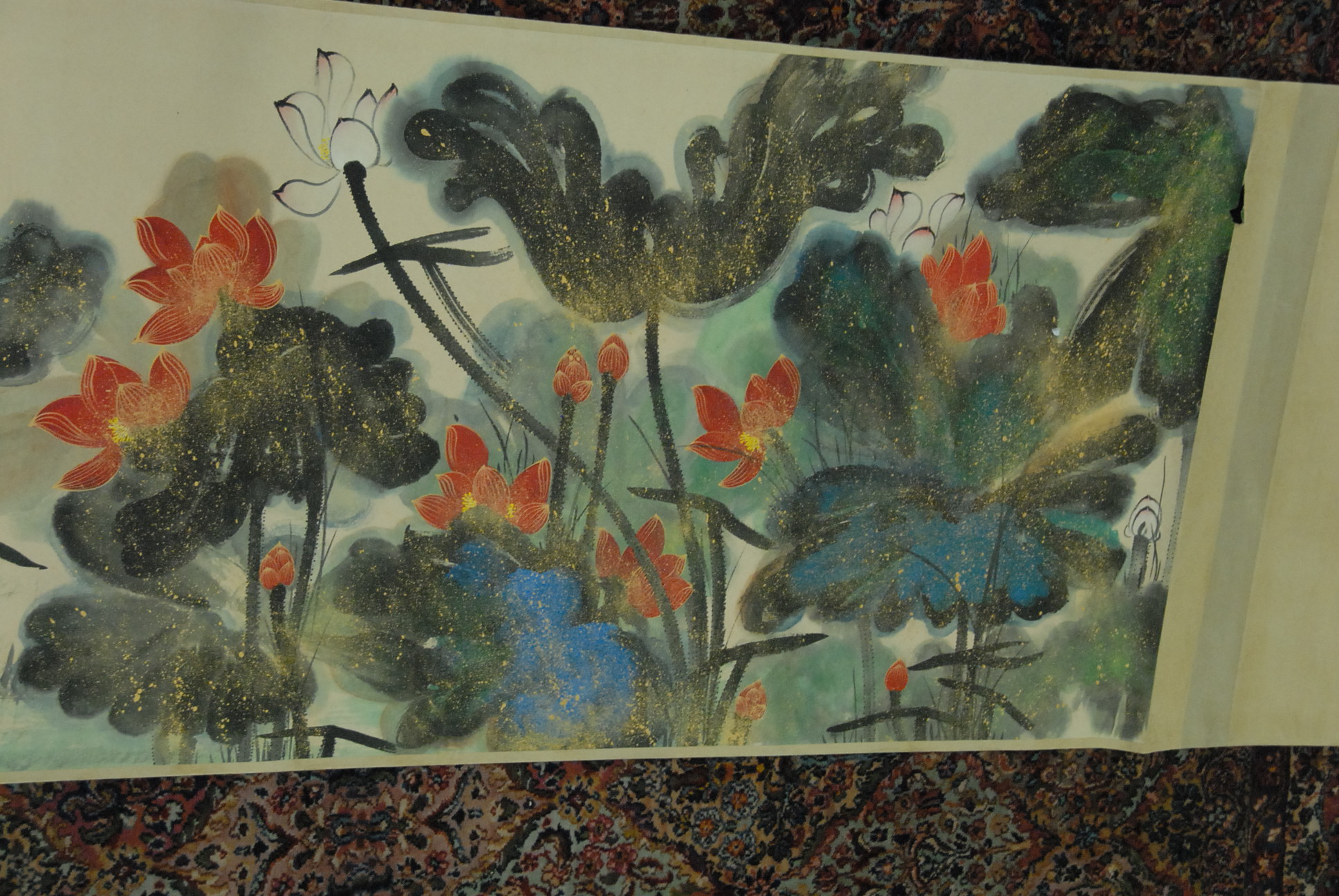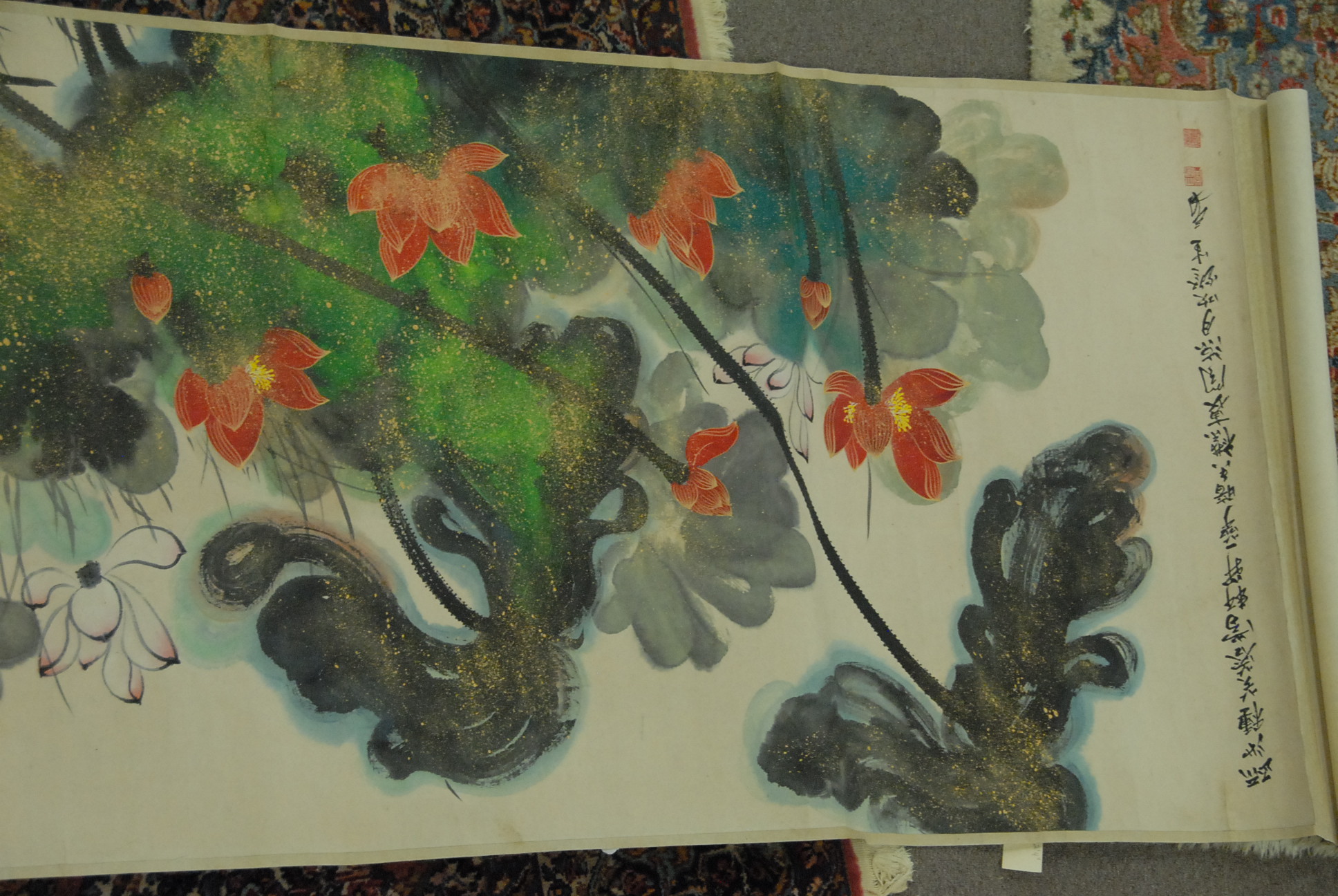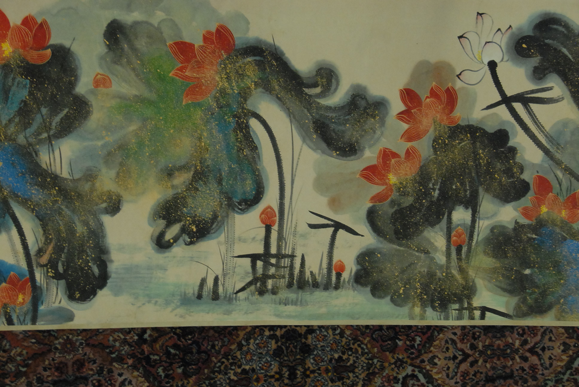 Large Oriental scroll having painted lotus flower, Zhang Da Qian, 16’3 x 37.