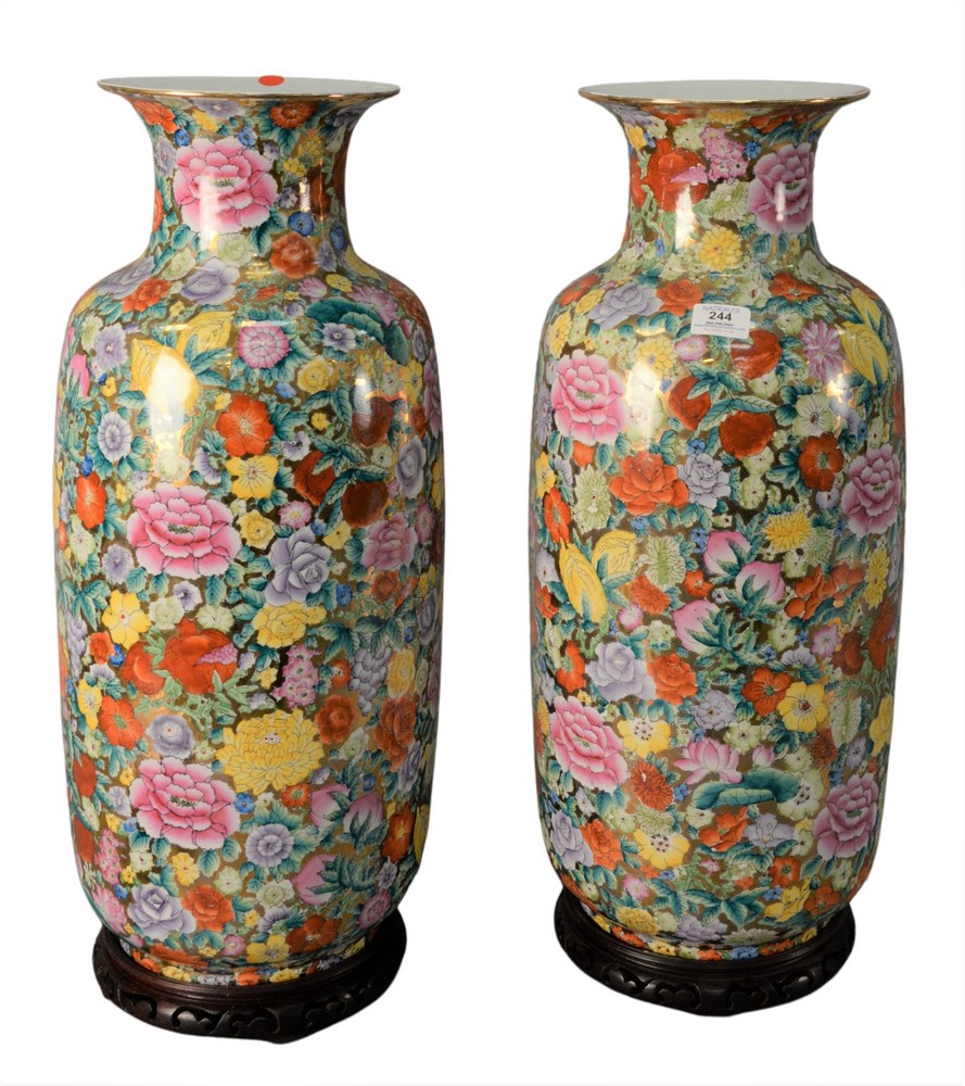 Lot 244: Pair of Tall Chinese Porcelain Vases, having paint and gilt floral decoration, not marked, height 24 1/4 inches.