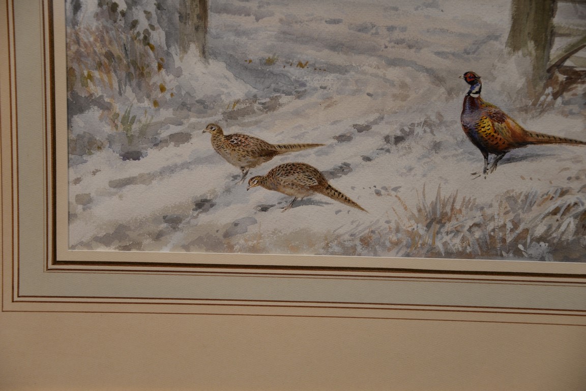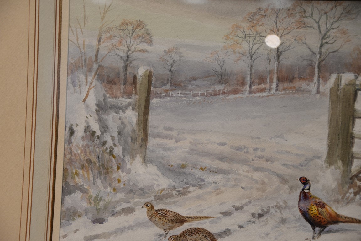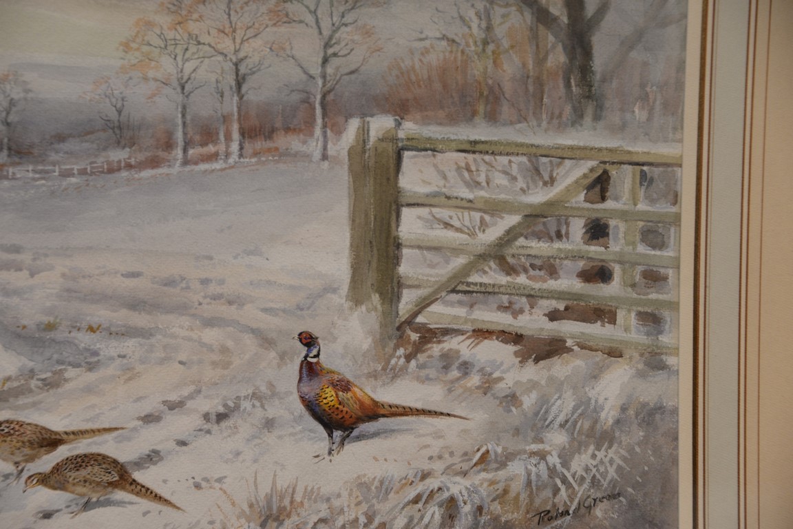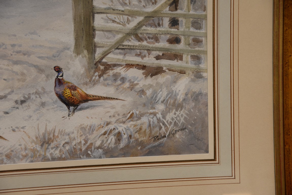 Lot 244: Roland Green 1896-1972 watercolor Pheasant & Hens in the Snow signed lower right: Roland Green sight size 11 3/4 x 17…