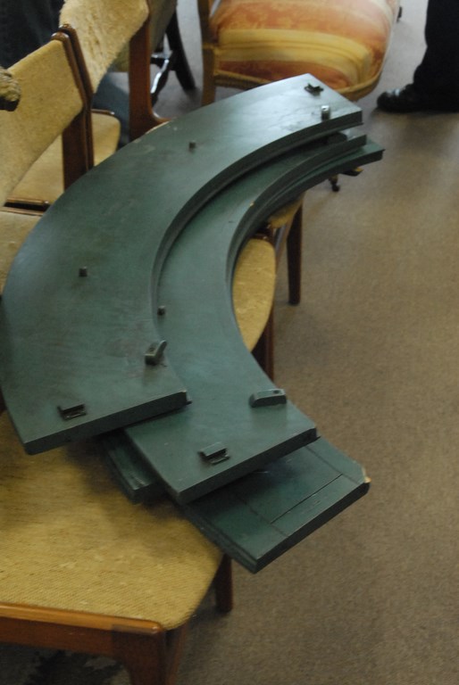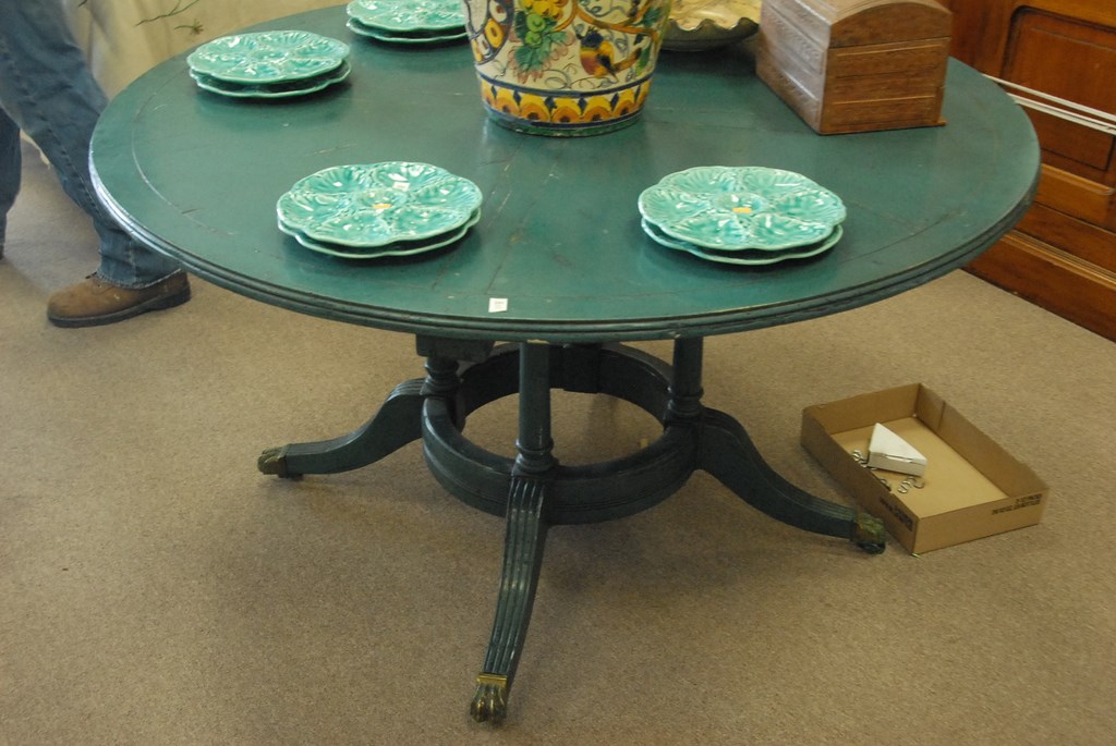 Lot 244: Round center pedestal dining table with four extensions, painted blue green, ht. 30in. dia. 54in. opens to 72in.
