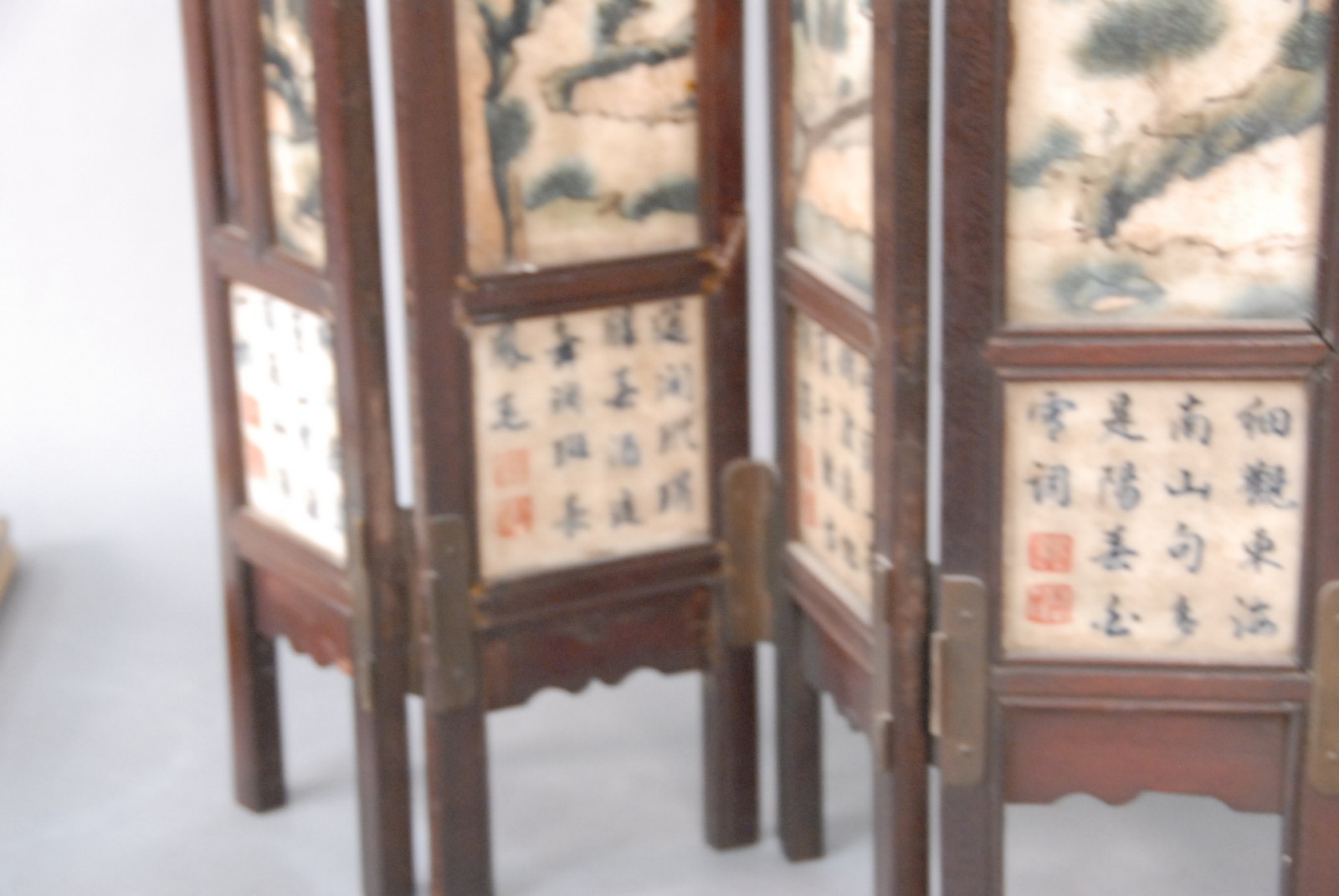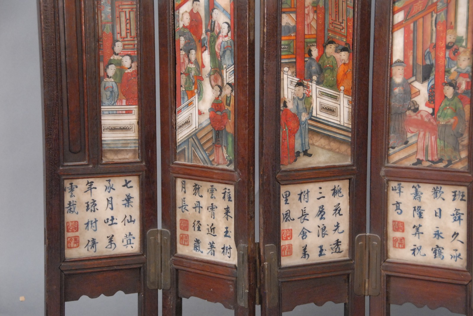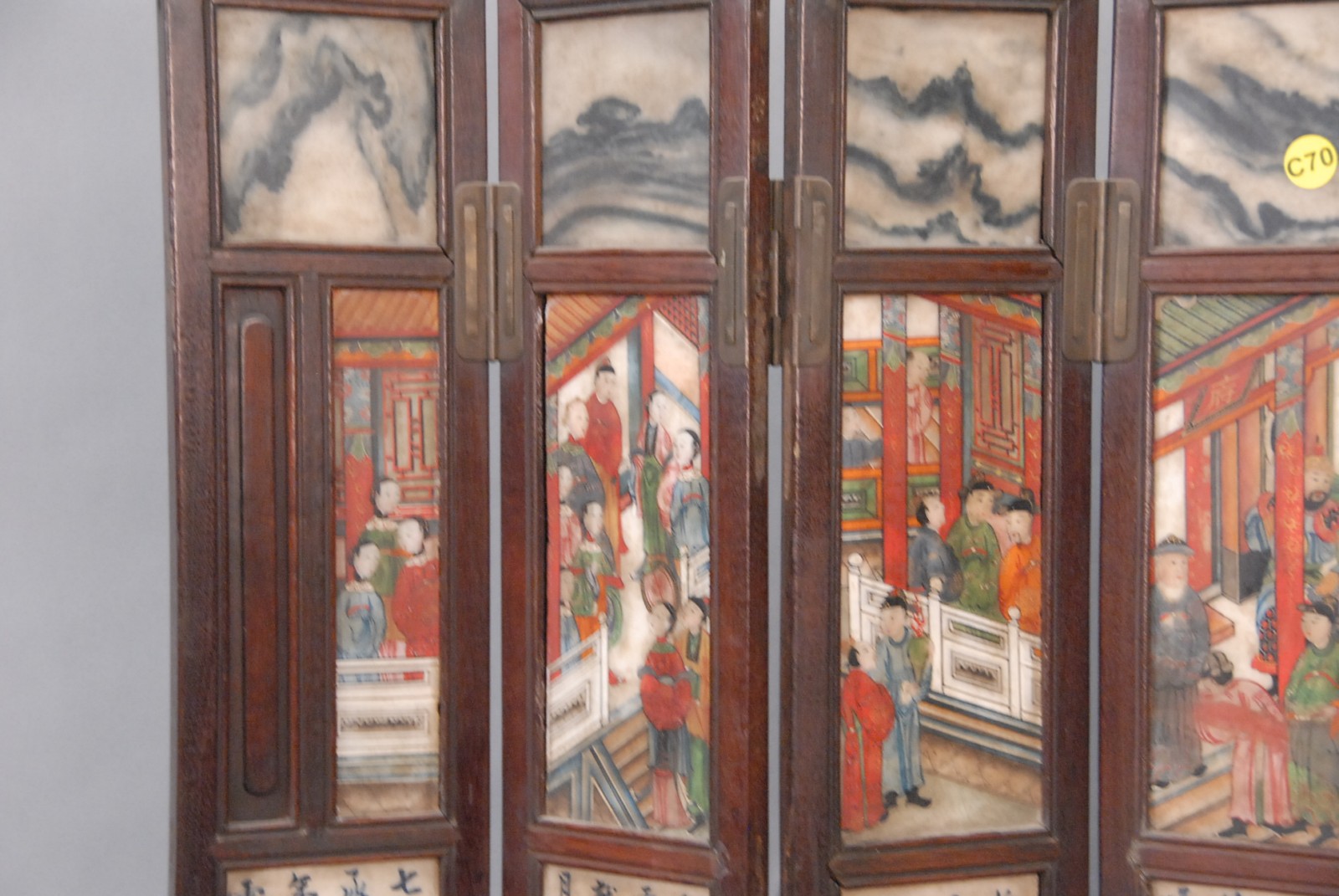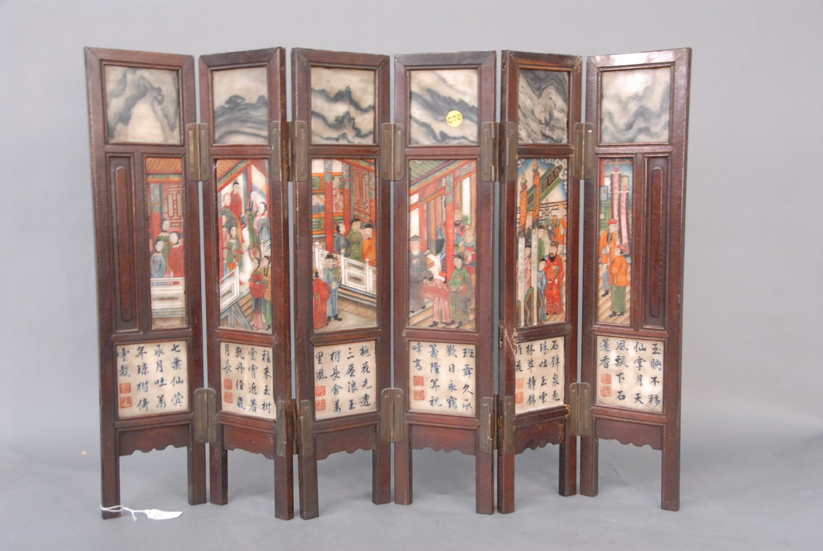 Six panel Chinese table stand with natural and painted stone panels of courtiers and calligraphy, Qing.