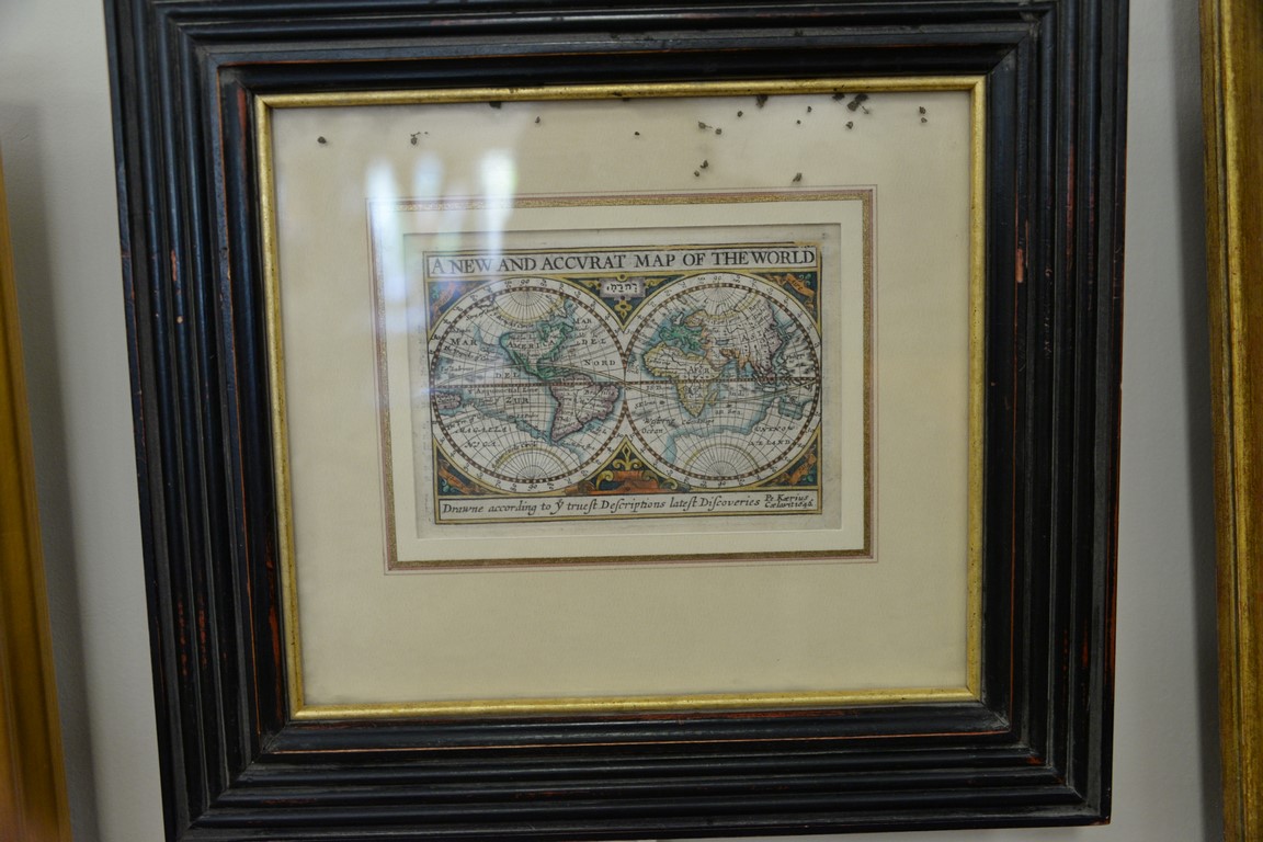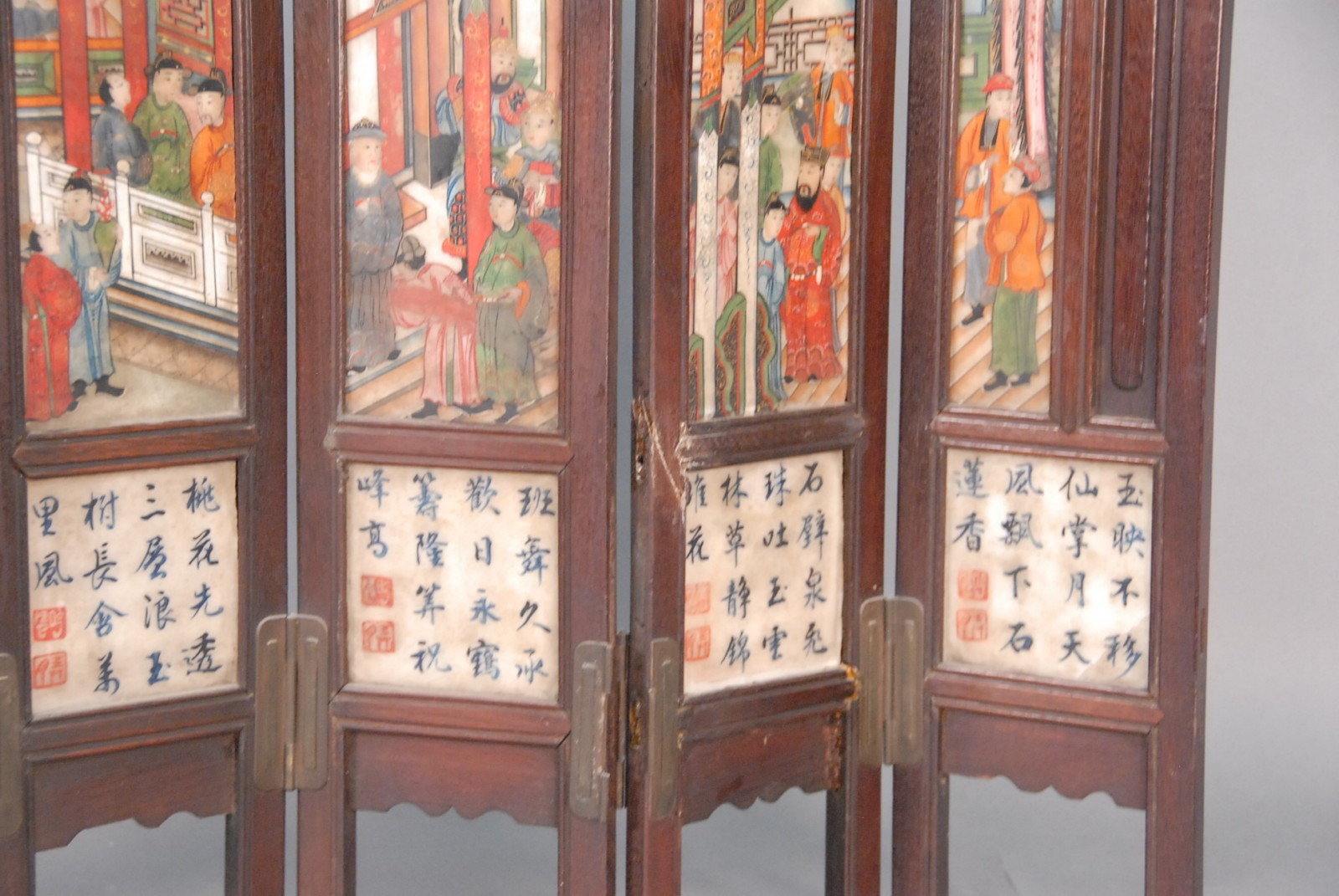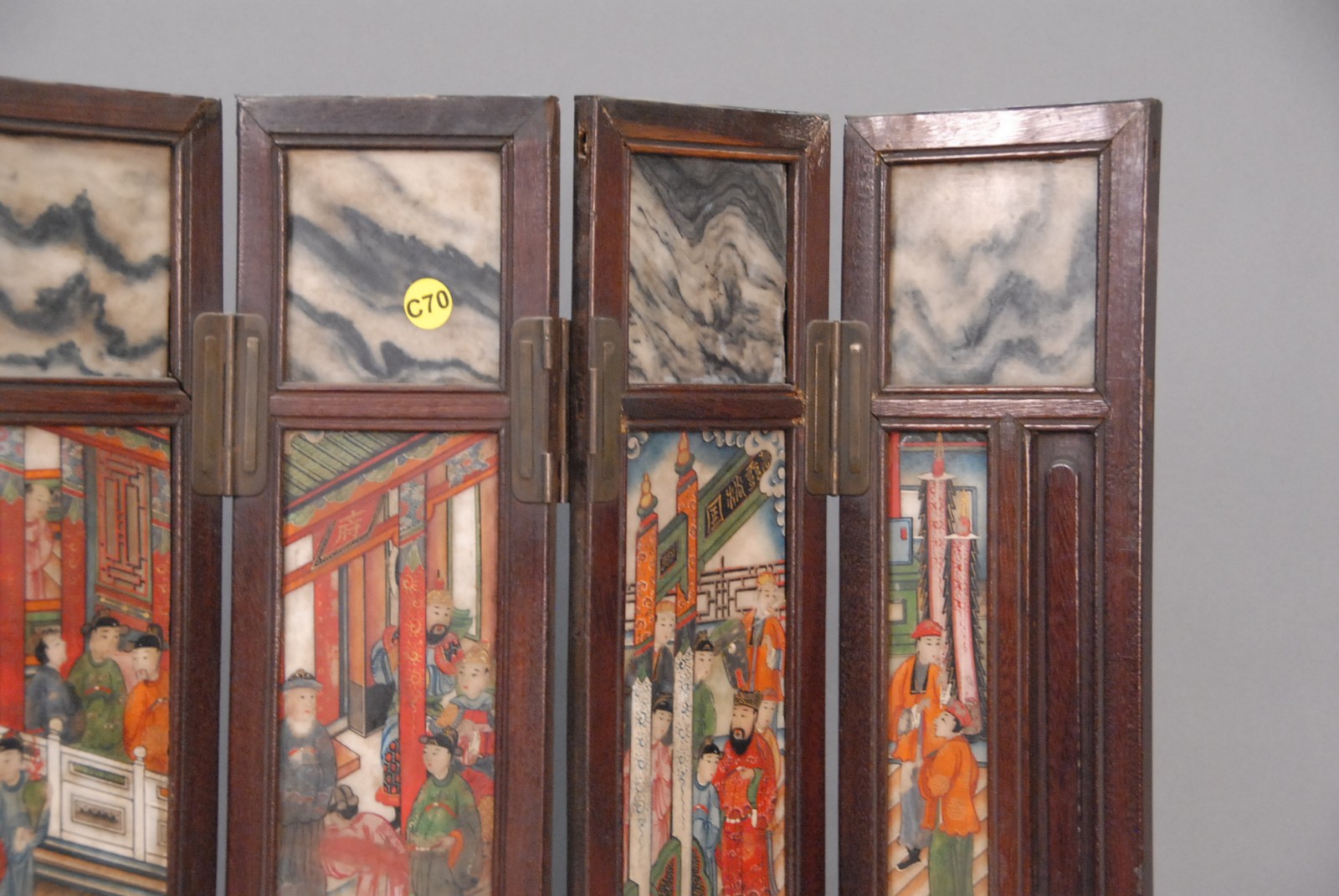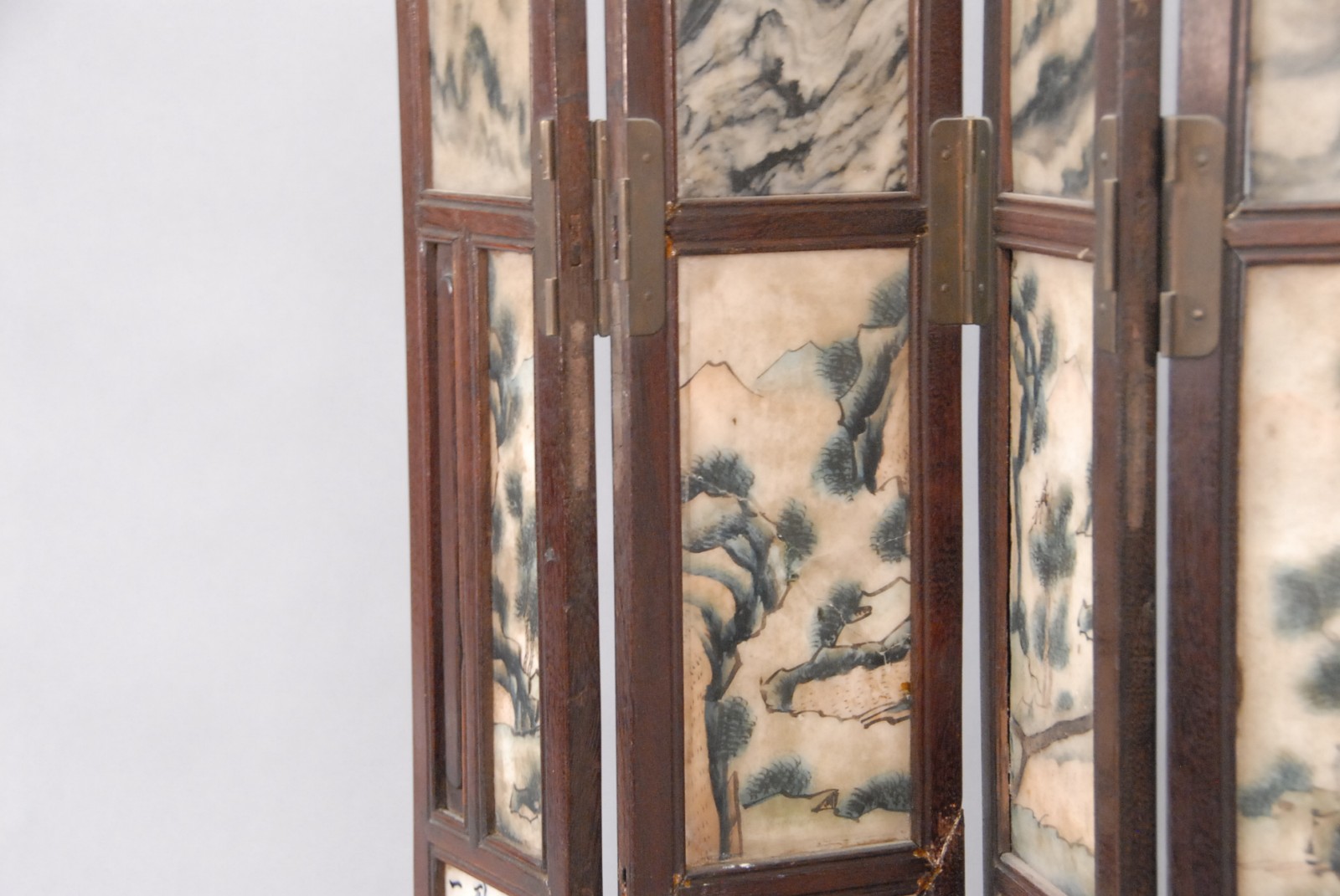 Six panel Chinese table stand with natural and painted stone panels of courtiers and calligraphy, Qing.