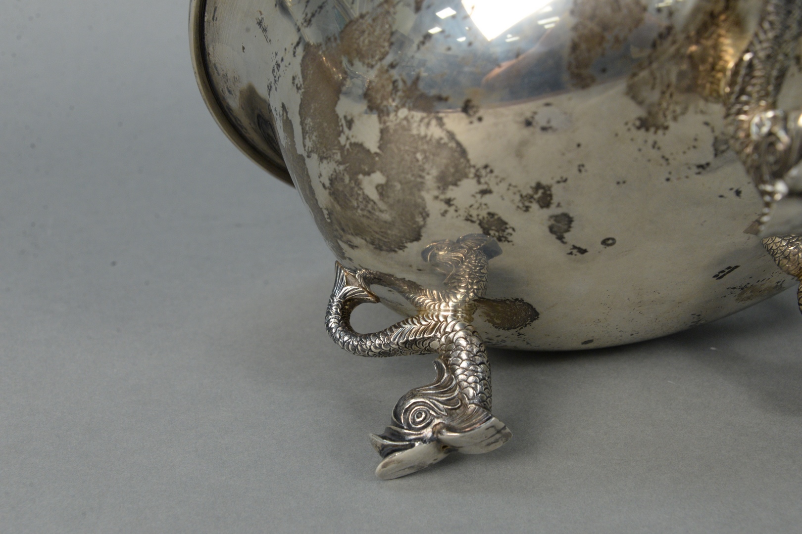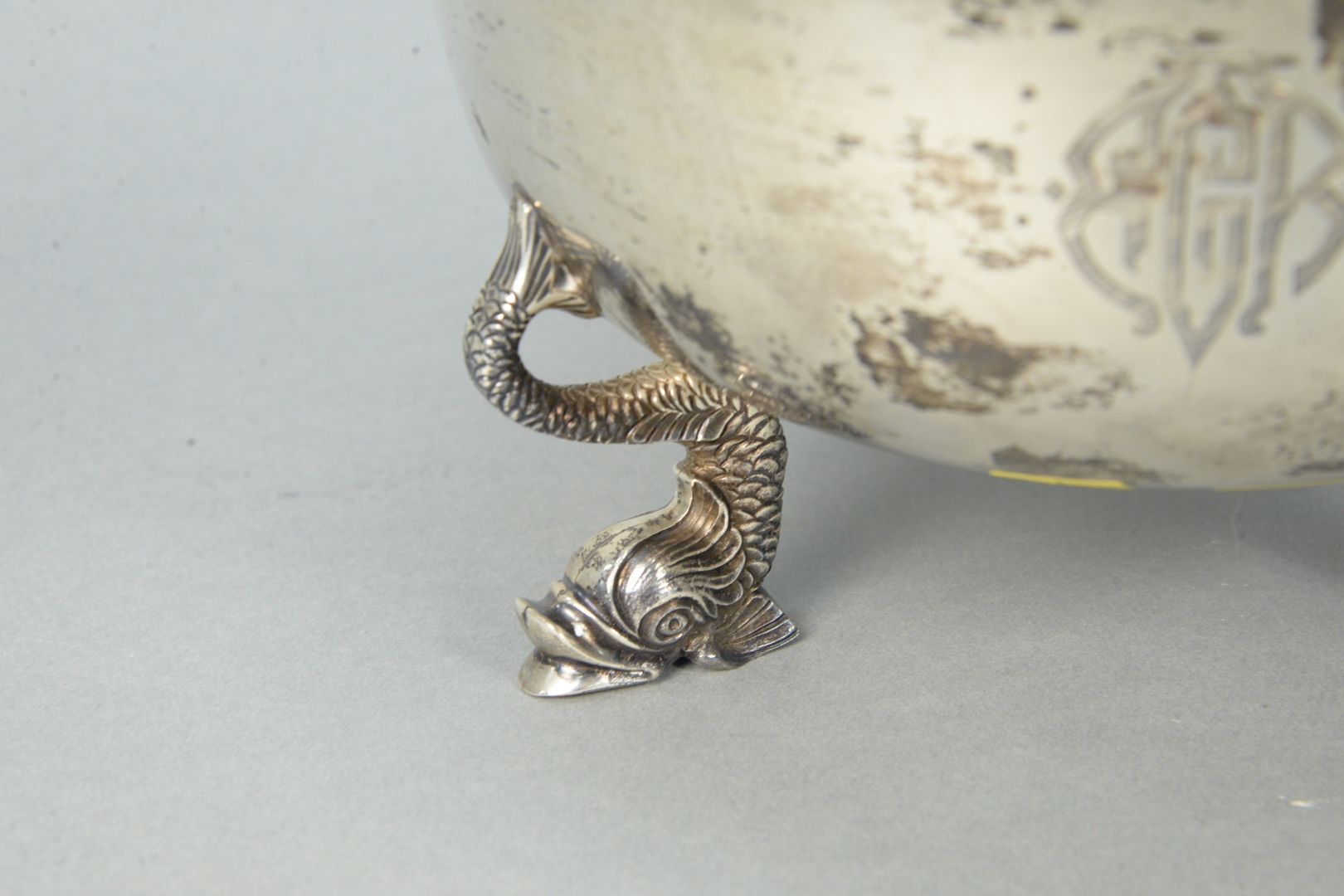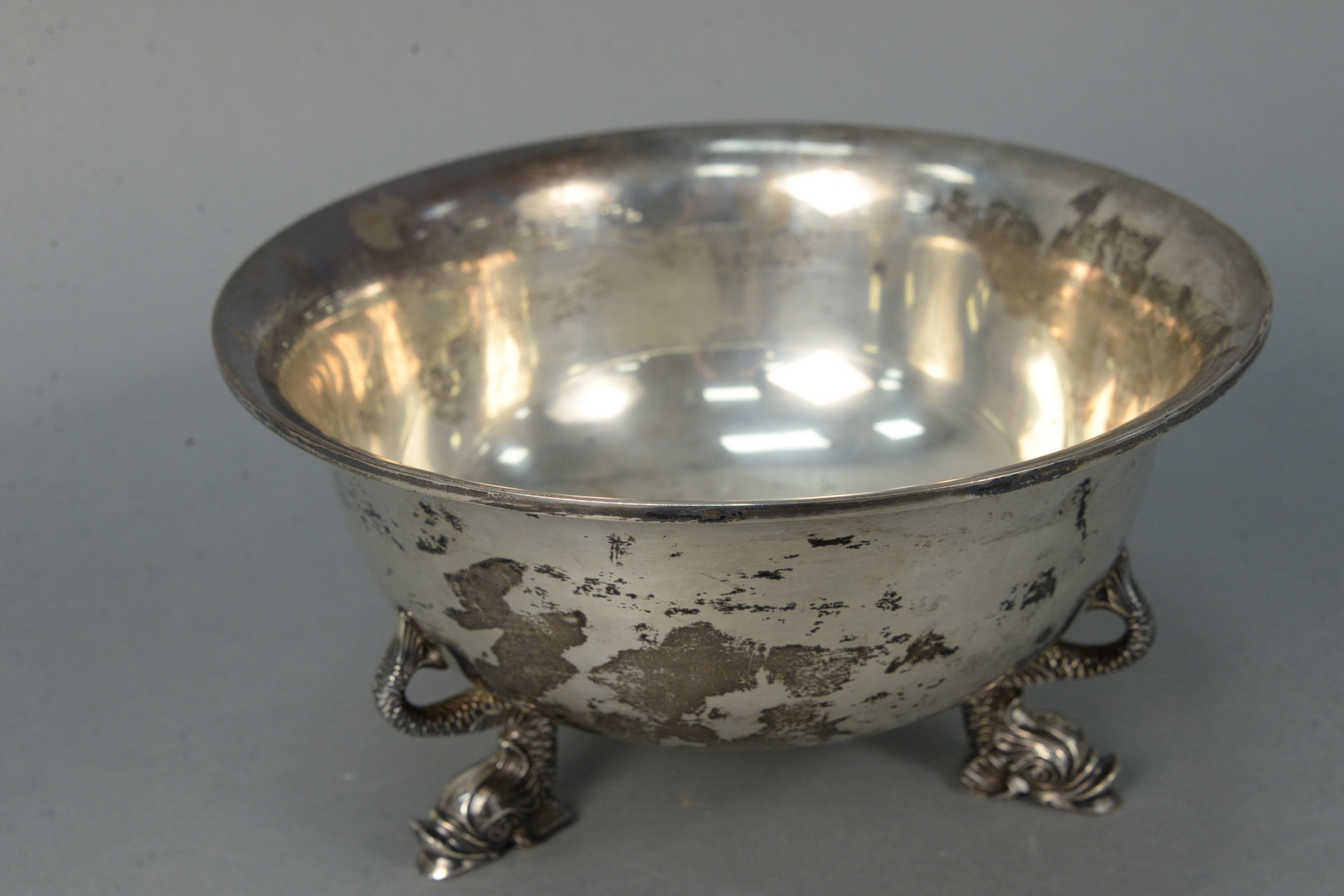Lot 244: Sterling Silver Revere Style Bowl on dolphin feet monogrammed on side marked Sterling 286, hallmark of a tree height 5 1/4 inches, d…