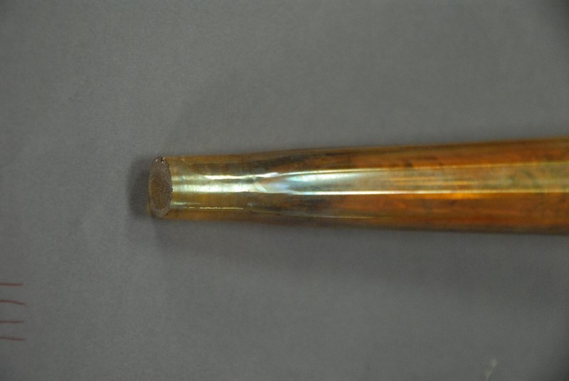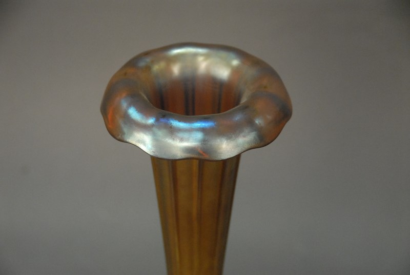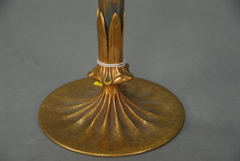 Lot 244: Tiffany gold iridescent vase in bronze base with rolled top edge, signed on base Louis C. Tiffany Furnaces Inc. 158. ht. 16 1/4in.