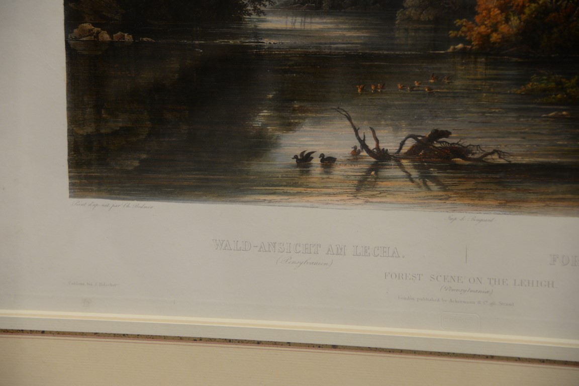 After Charles Karl Bodmer 1809-1893 hand colored aquatint and engraving by Freiderich Salathe Forest Scene on the Lehigh Pennsylvania published by Ackermann sight size 16 x 21