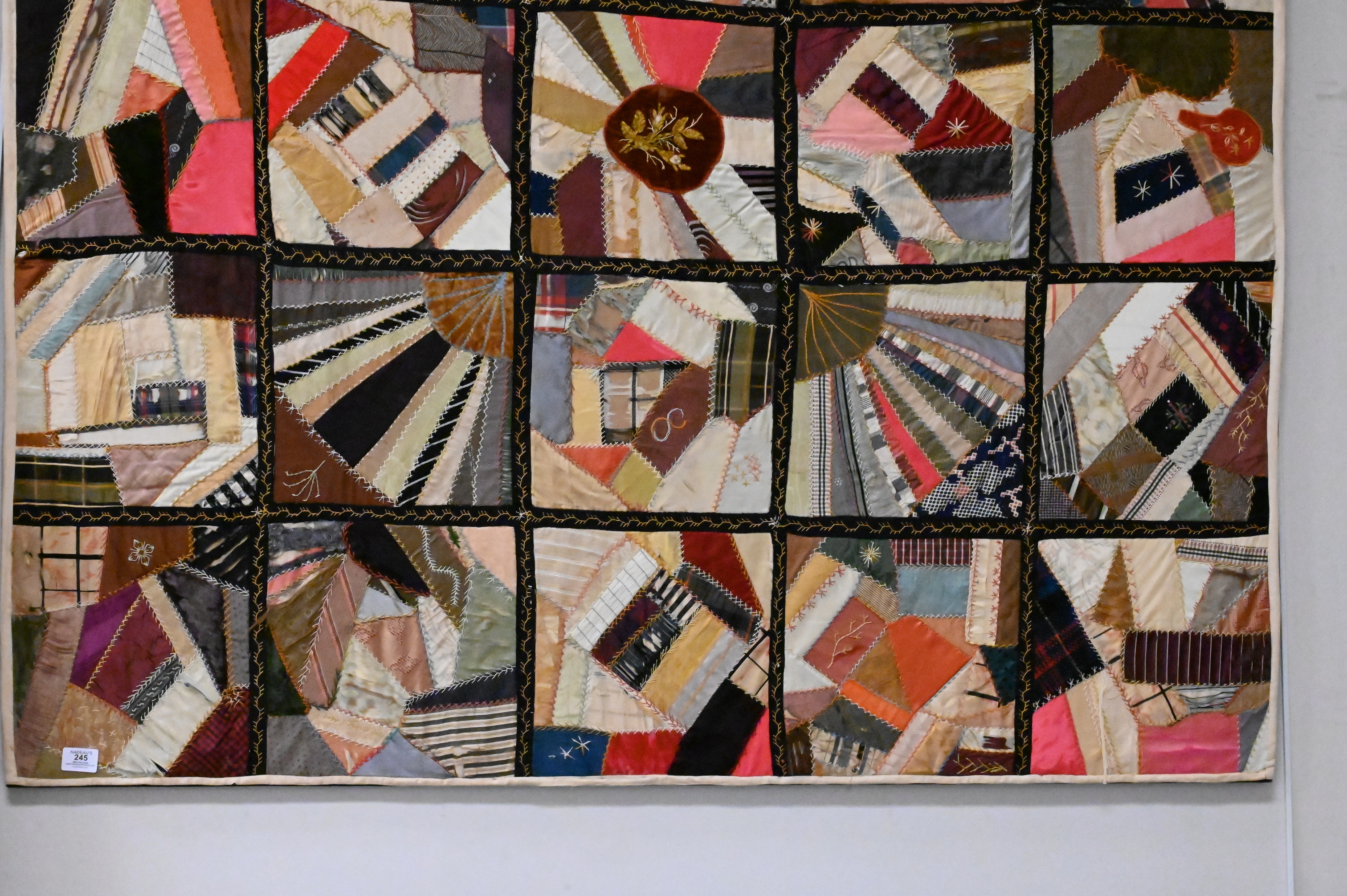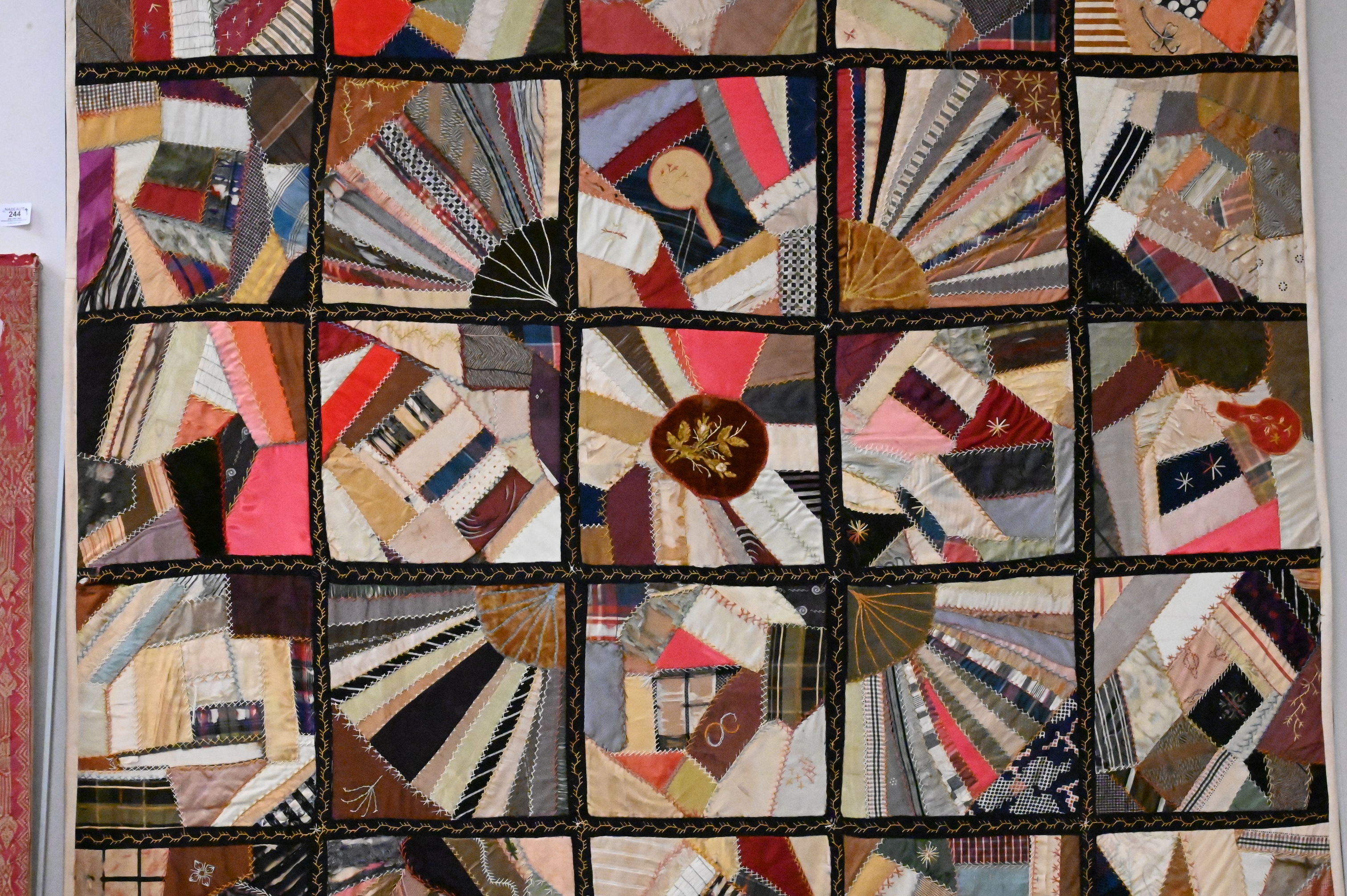 patchwork embroidered textile, now mounted on linen, Pennsylvania 19th / 20th century
