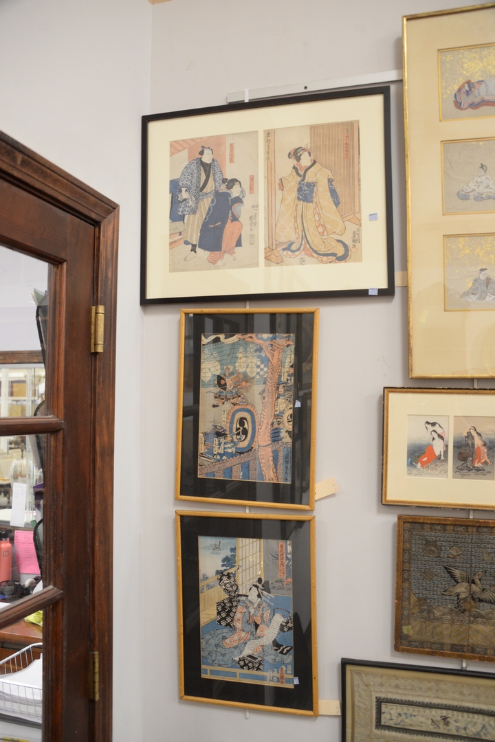 Group of Eight Framed Asian Items to include an embroidered crane badge with silver and gold threads, a silk embroidered sleeve with fish, a Japanese diptych, two triptychs, two woodblock prints, along with a watercolor on paper, largest frame size 33 x 12 1/2. Provenance: The Estate of Alan Gans, Mulberry Point, Guilford.