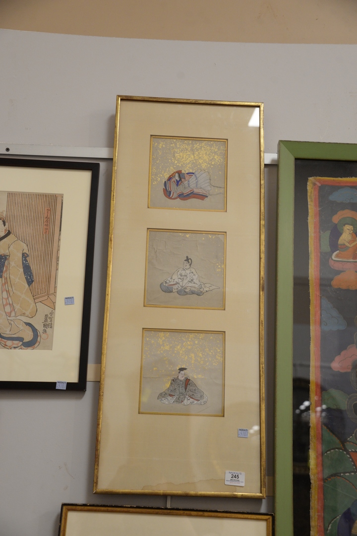 Lot 245: Group of Eight Framed Asian Items to include an embroidered crane badge with silver and gold threads, a silk embroidered sleeve with fish, a Japanese diptych, two triptychs, two woodblock prints, along with a watercolor on paper, largest frame size 3