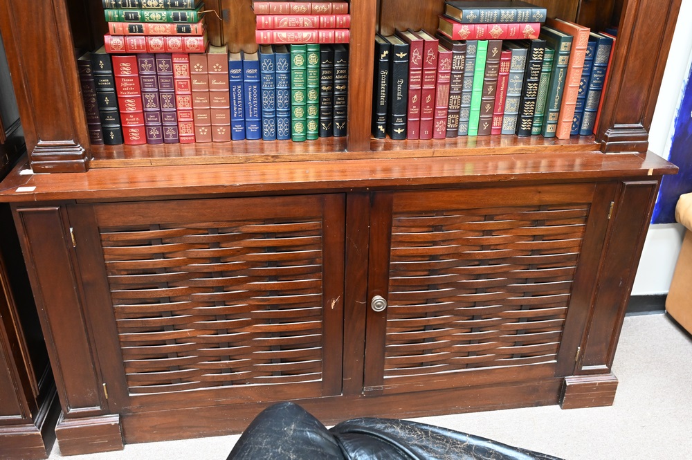 Large Mahogany Classical Bookcase, having two door bottom with shelf top, height 103 inches, width 68 inches, depth 17 inches.