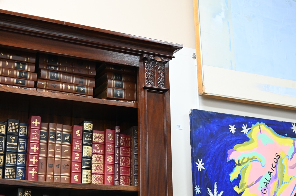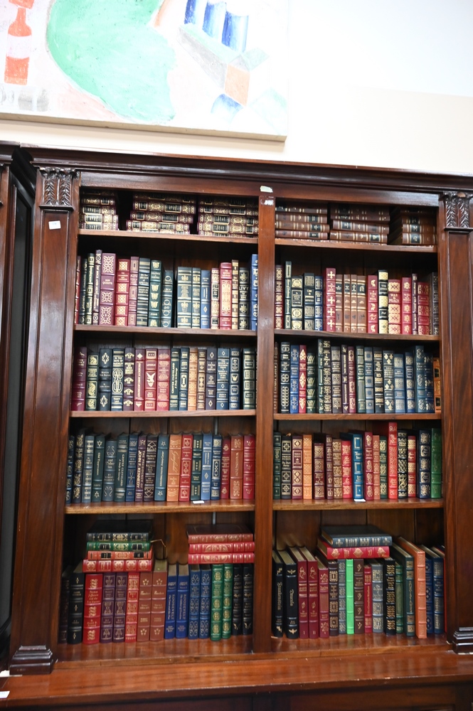 Lot 245: Large Mahogany Classical Bookcase, having two door bottom with shelf top, height 103 inches, width 68 inches, depth 17 inches.