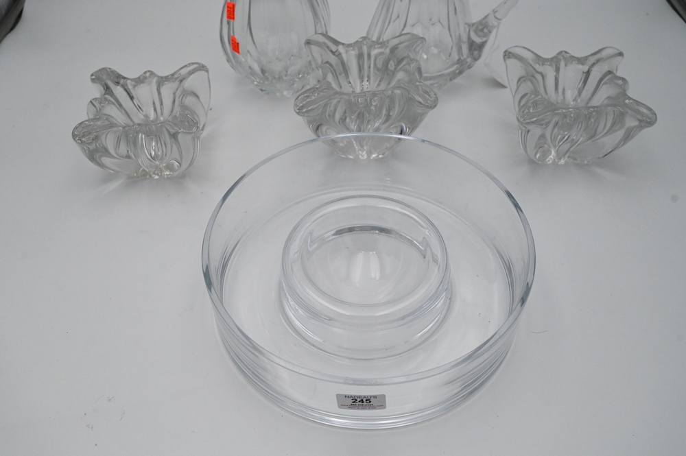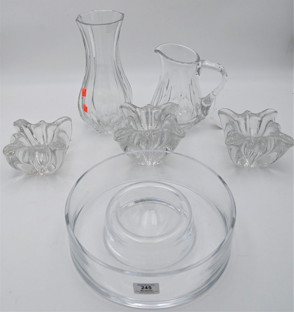 Lot 245: Six Piece Baccarat Lot, to include three freeform bowls, tallest 4 1/4 inches; a crystal vase; crystal caviar dish; along with a pit…