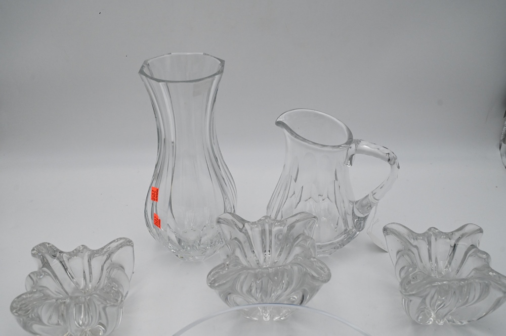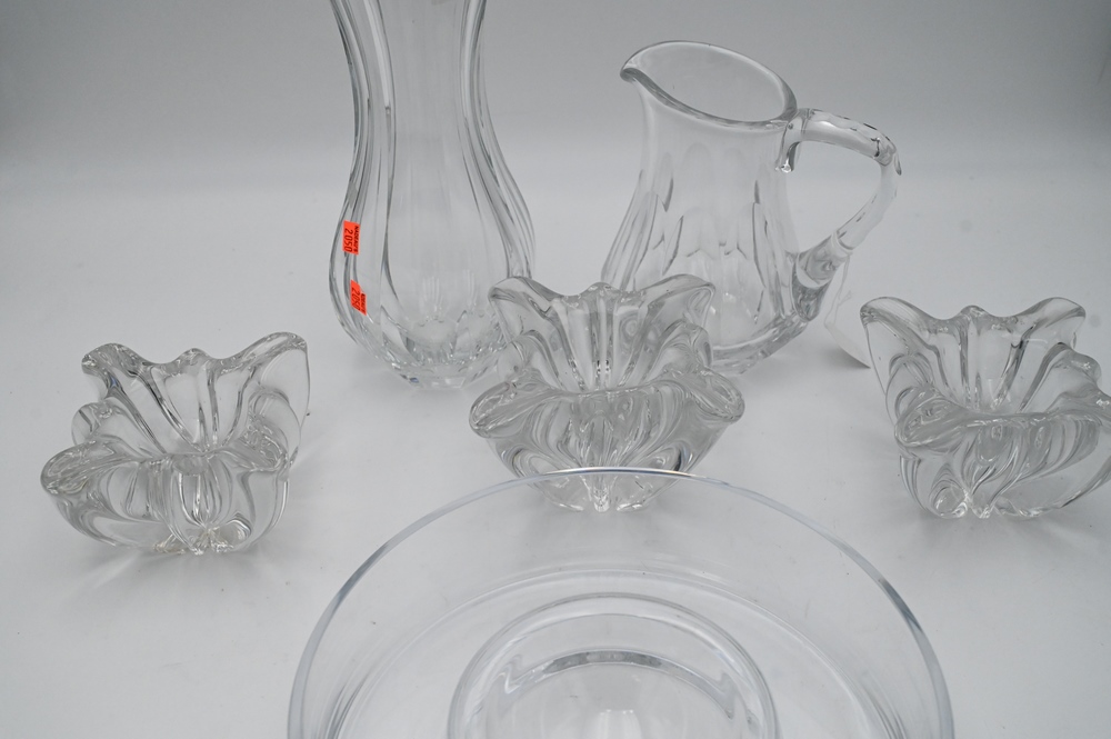 Six Piece Baccarat Lot, to include three freeform bowls, tallest 4 1/4 inches; a crystal vase; crystal caviar dish; along with a pitcher; tallest 12 inches.