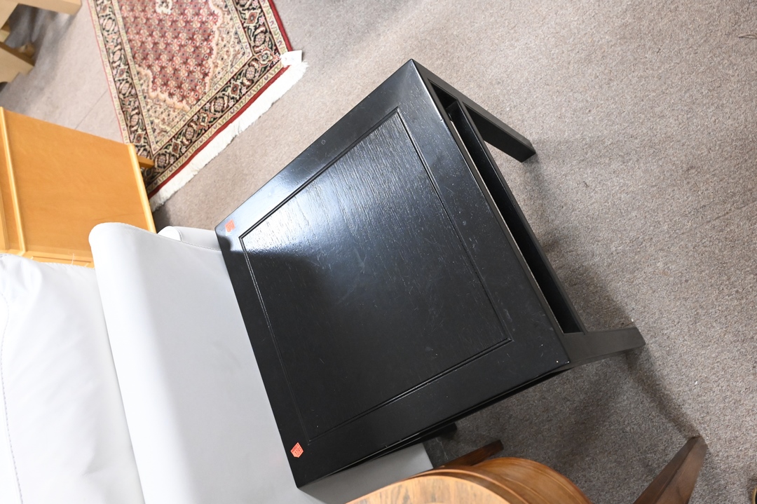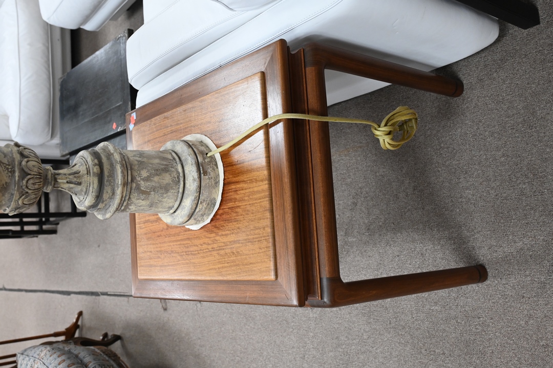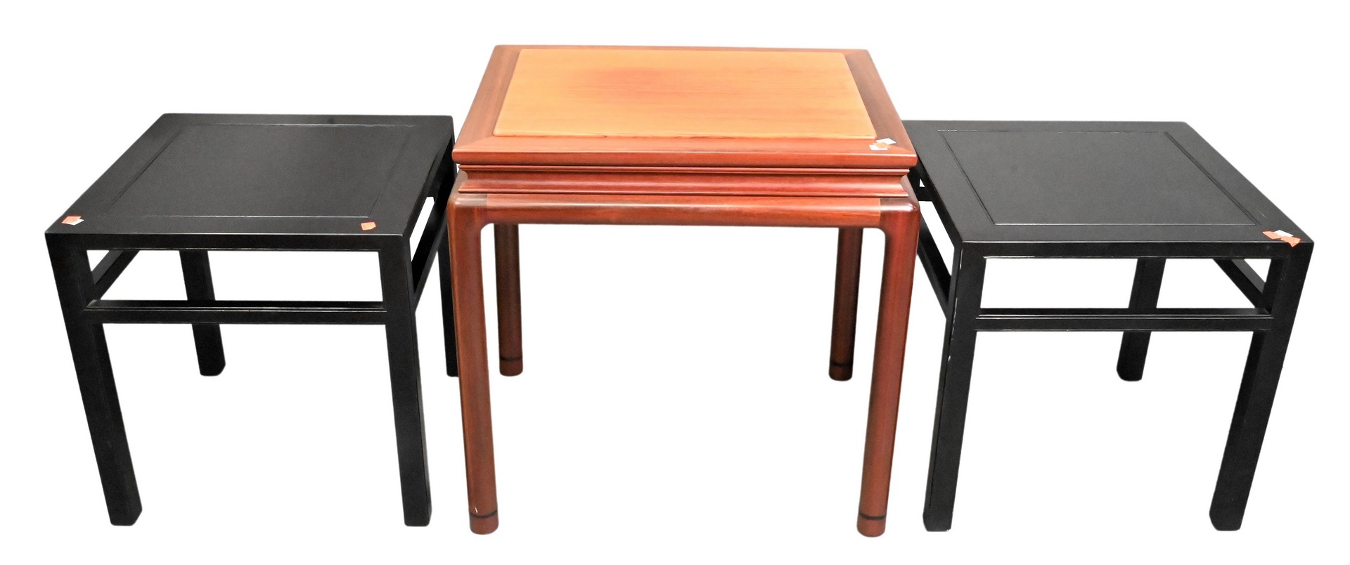 Three Side Tables in the Chinese Taste, to include a pair of low square stands, height 18 inches, top 18″ x 18″; along with a table stamped “Hedden 1985″, height 23 inches, top 17 1/2″ x 22 1/2”.