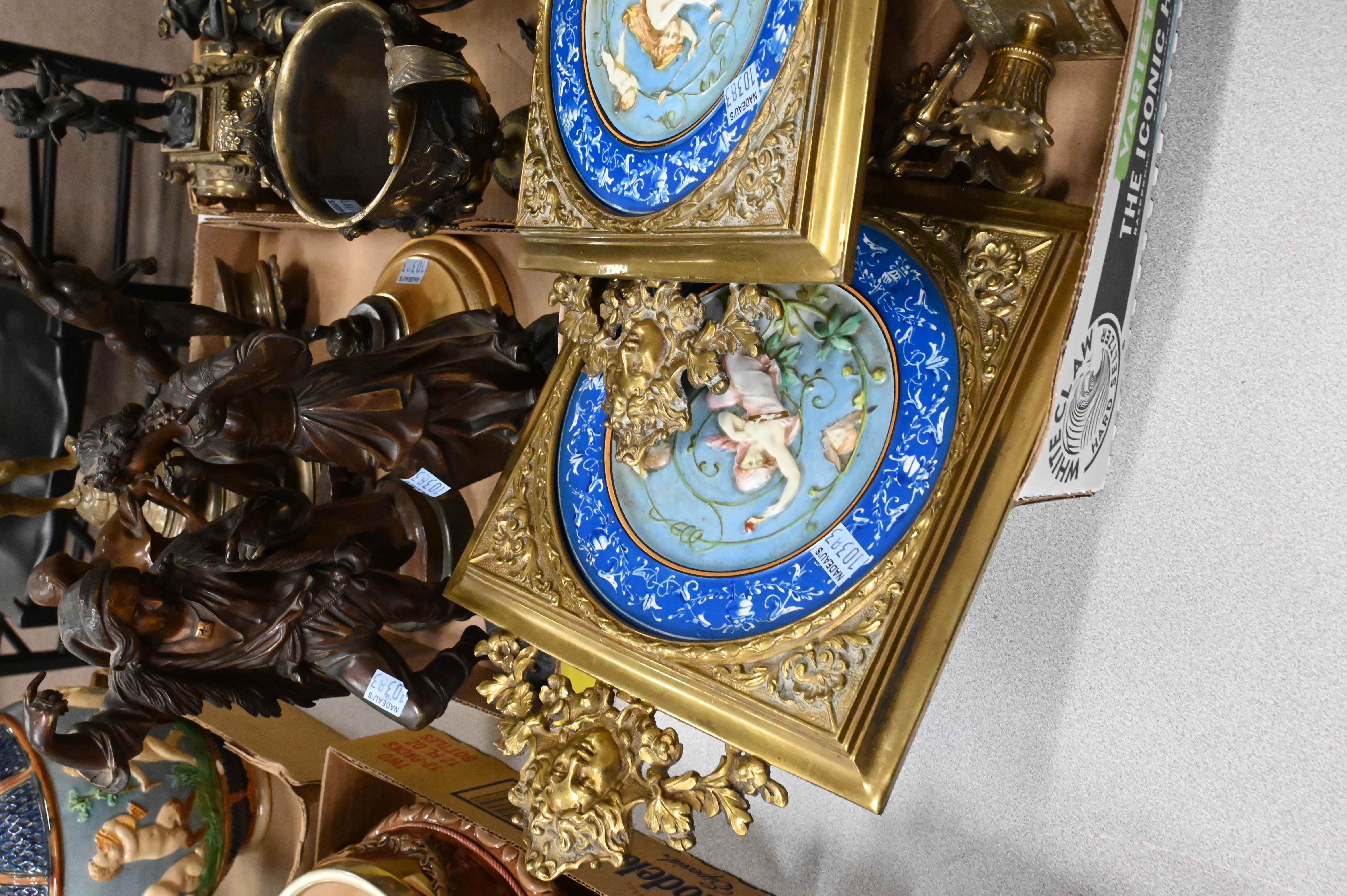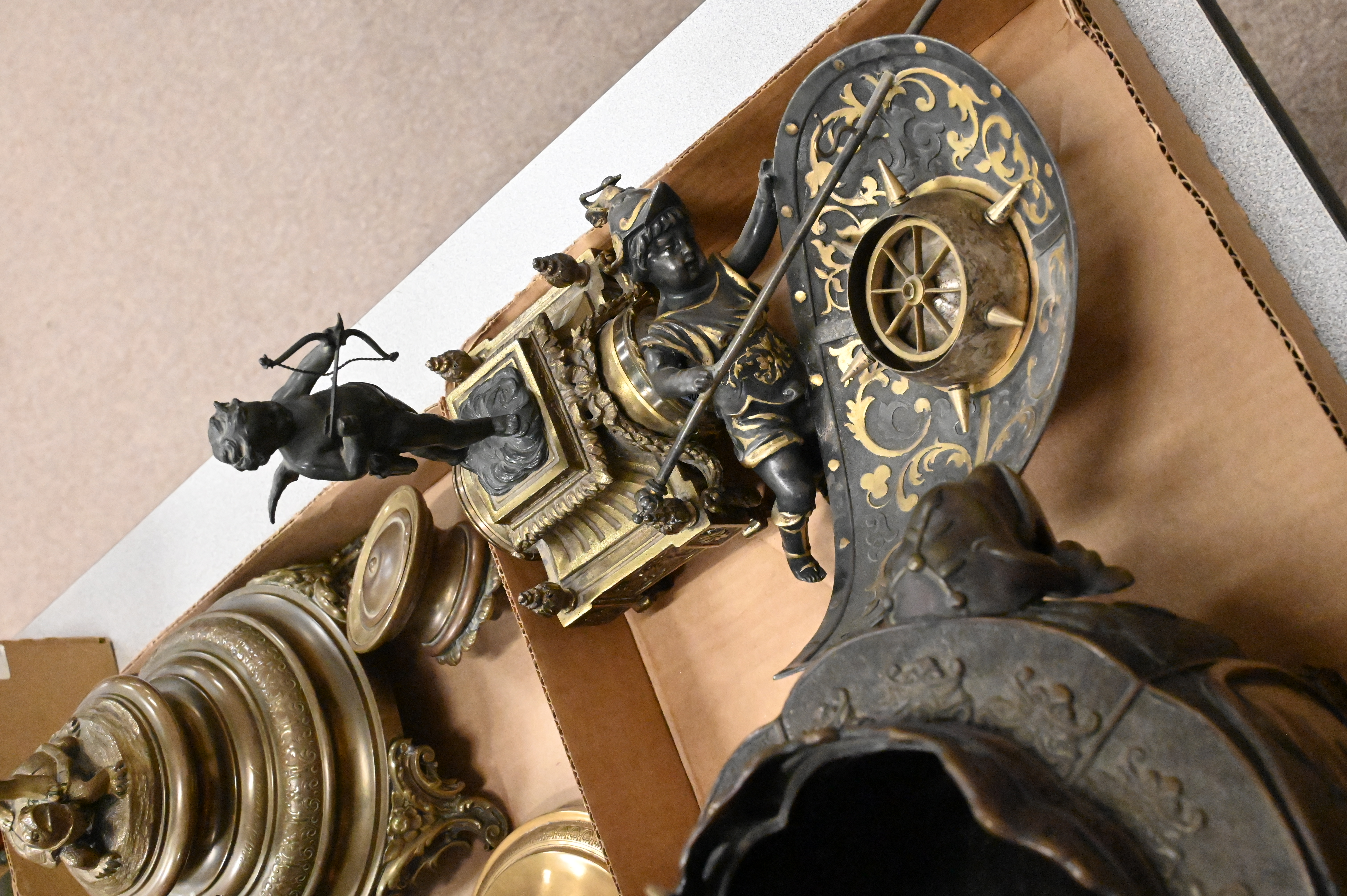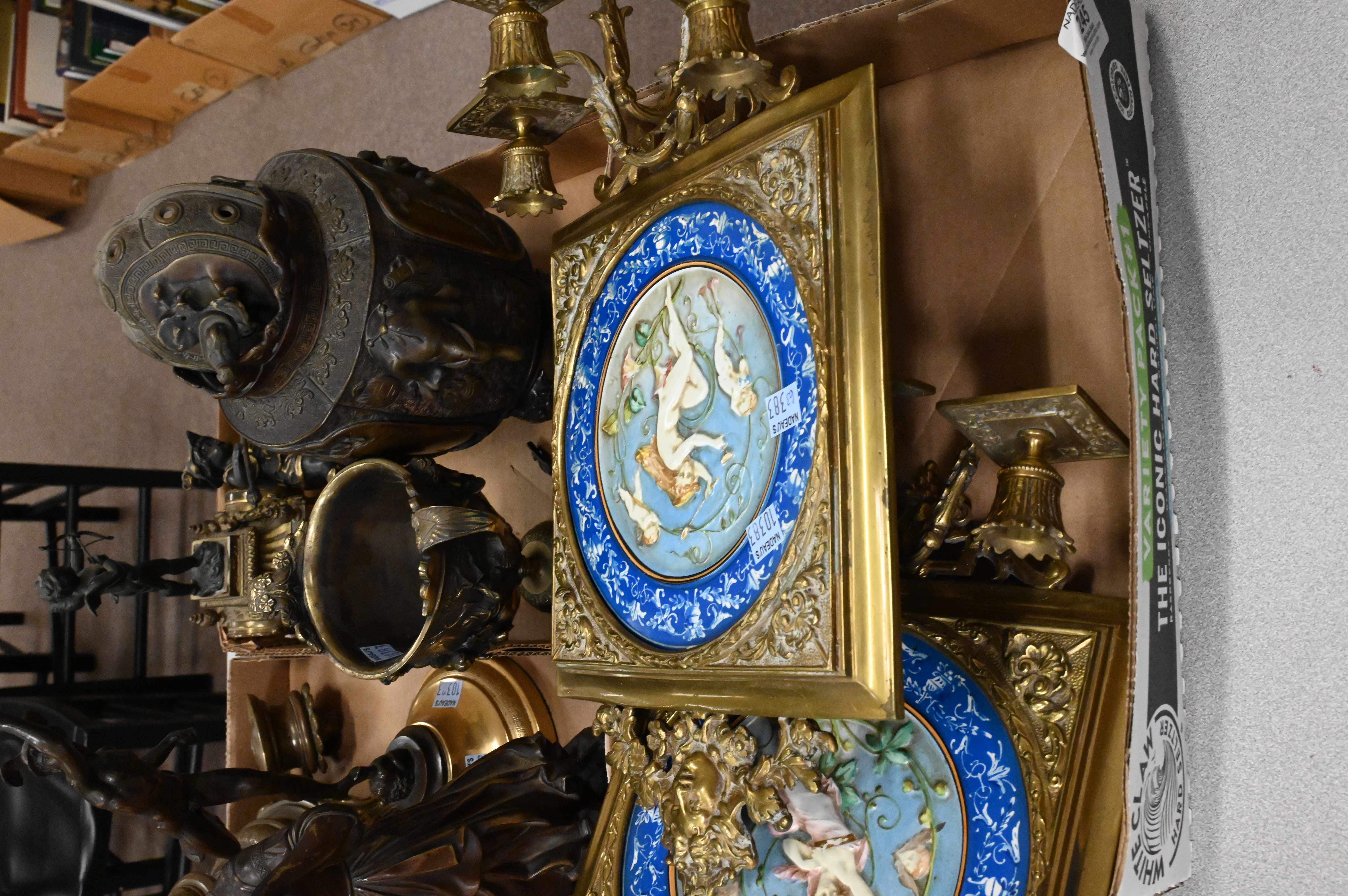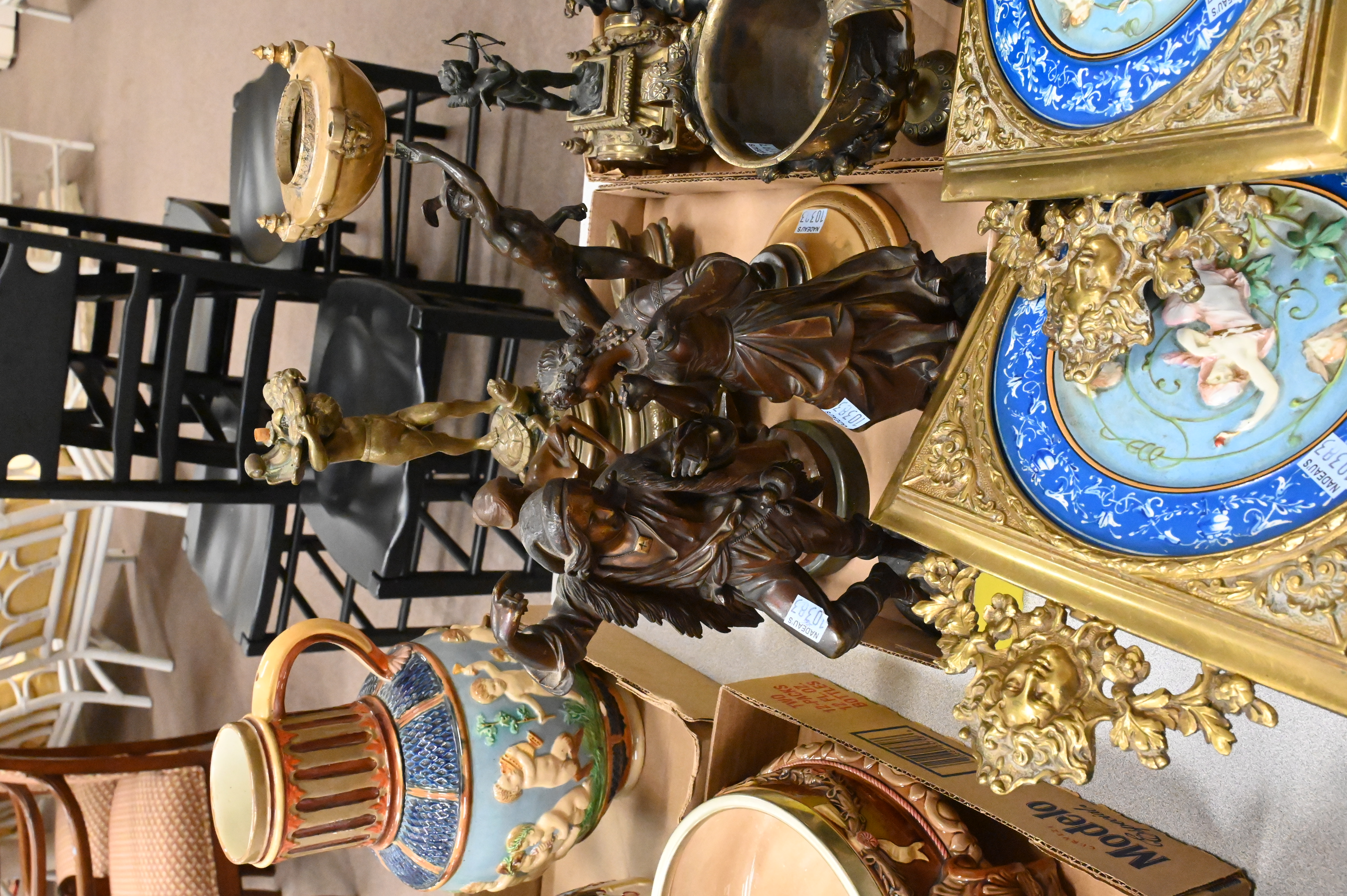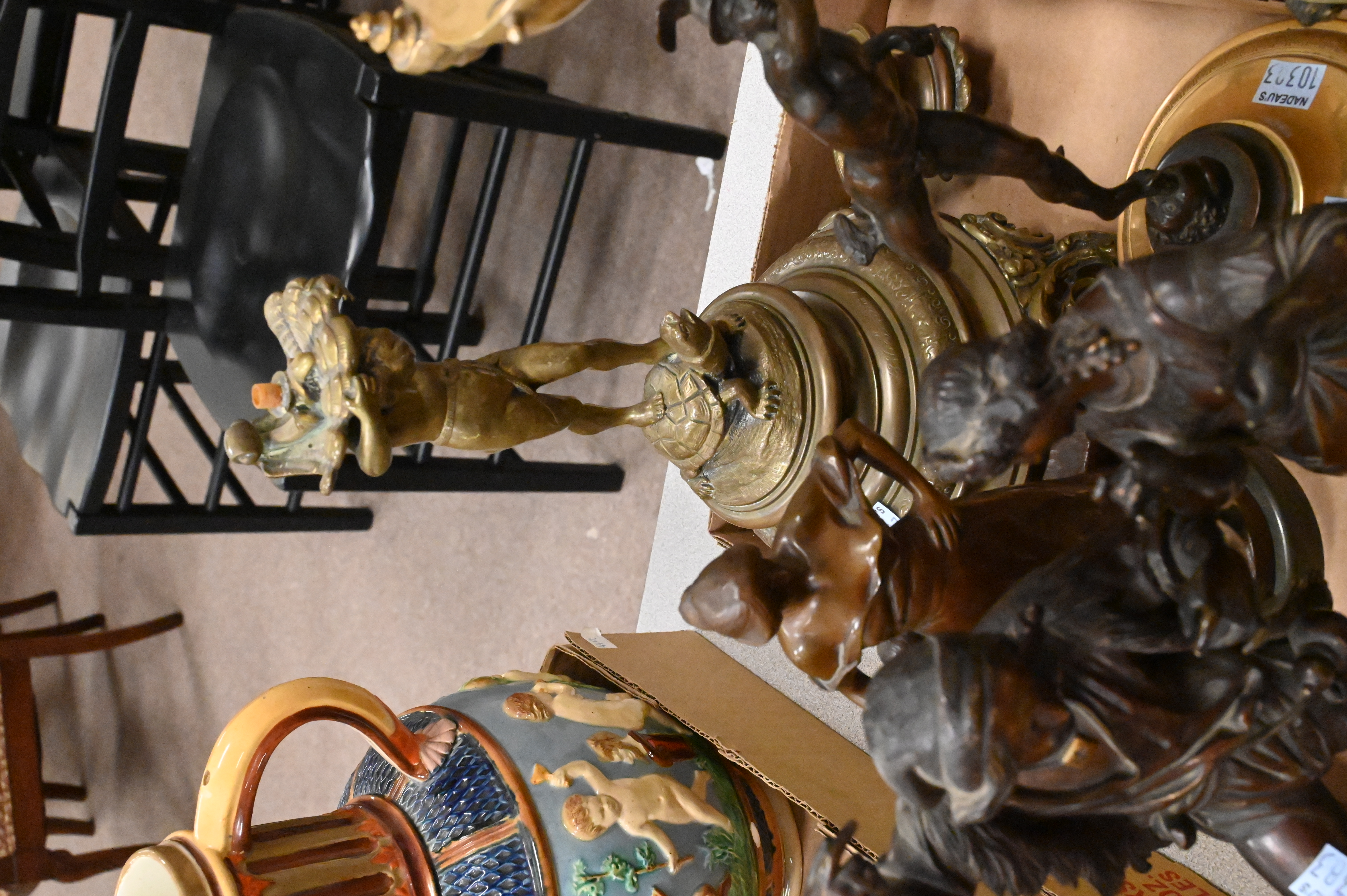 to include Hans Muller (Austrian 1873-1937) “Lady with Gear” bronze on marble, pair of bronze folk dancers, small French figural mantle clock surmounted by cupid, putti figure with spear and shield, gilt trophy cup, gilt putti and tortoise base, bronze and brass mercury lamp base, Asian elephant handle bronze censer with lid, pair of pate sur pate wall sconces