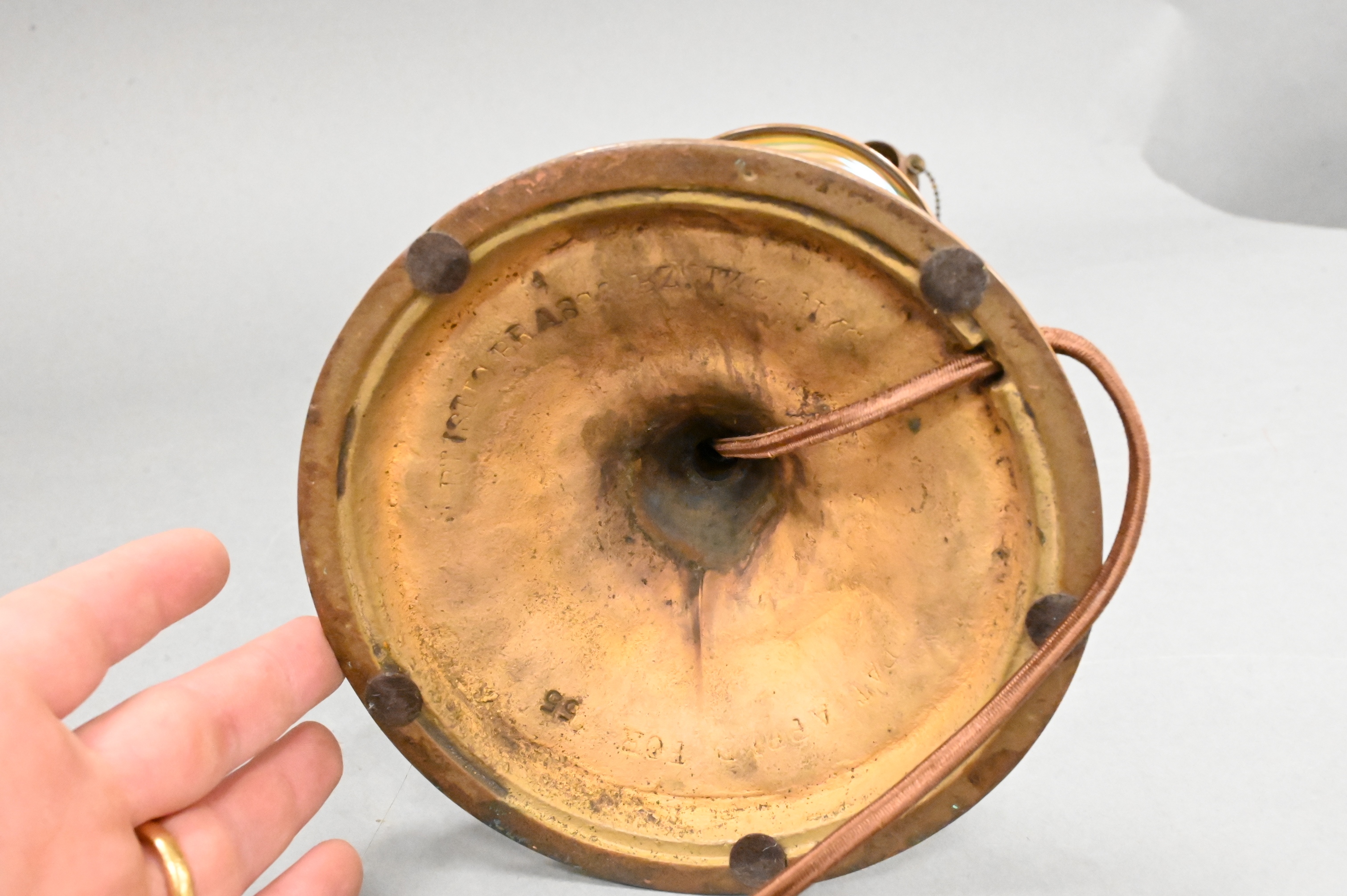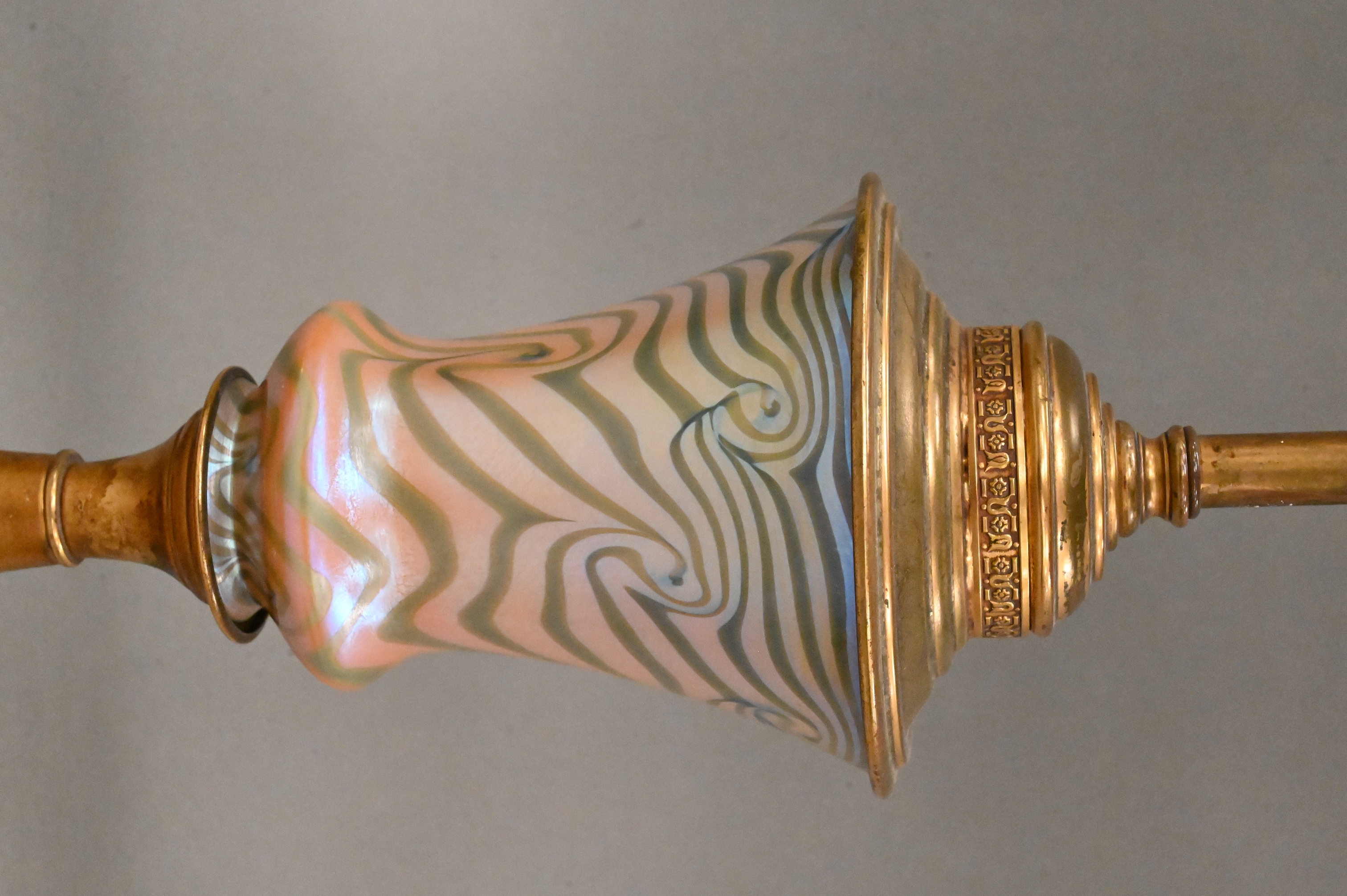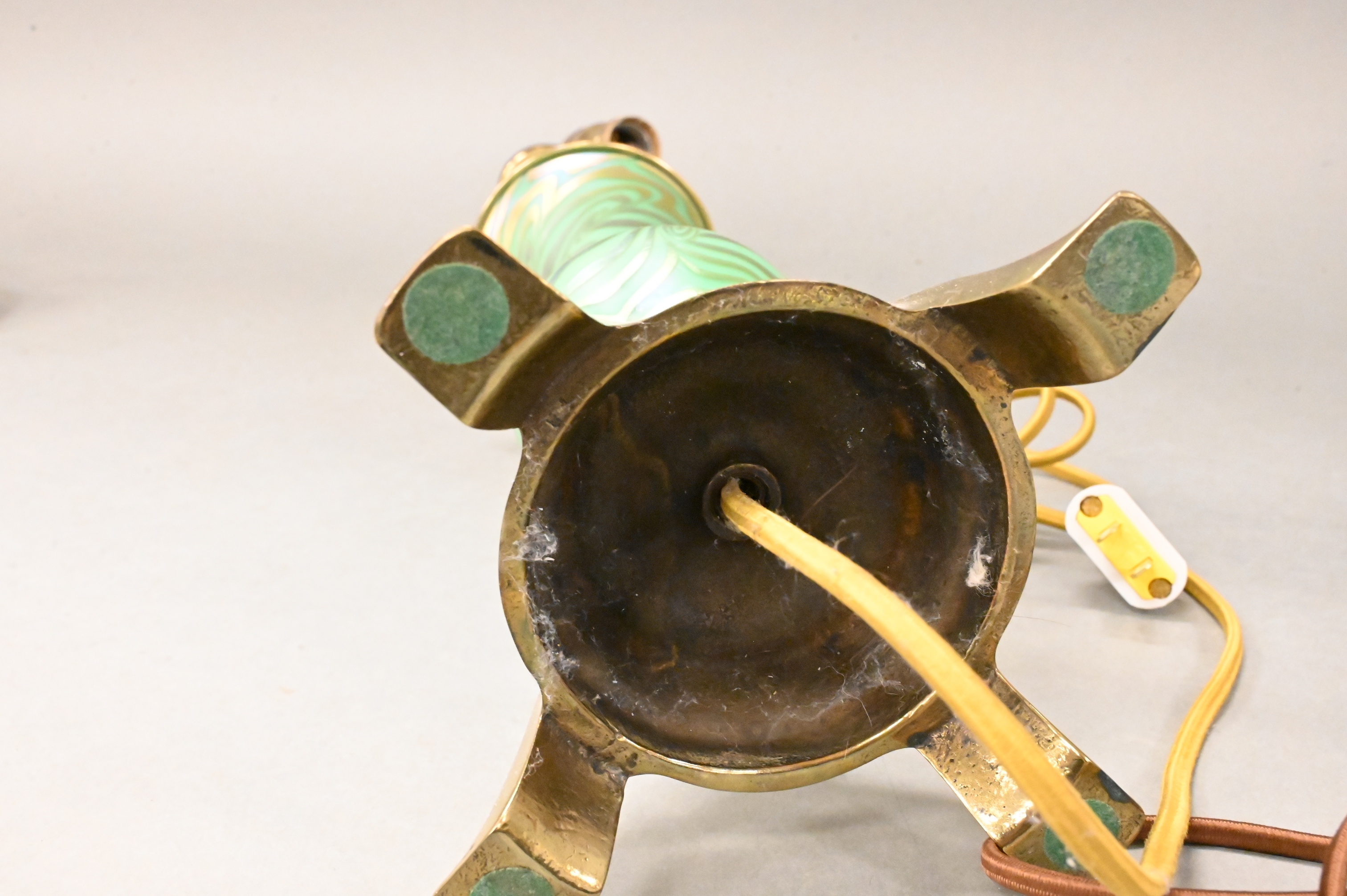 featuring iridescent art glass bodies with swirling, feathered patterns, on in shades of green, blue, the other in purple and amber, both mounted on brass base with molded and engraved detailing, supporting brass sockets with pull chains