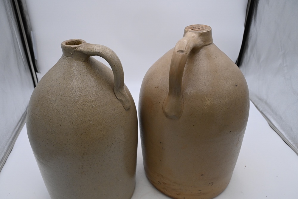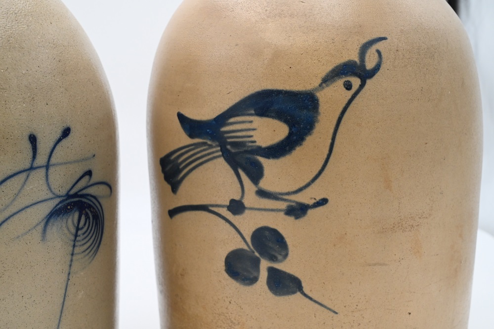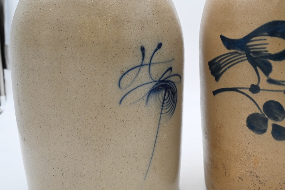 Lot 245: Two Piece Lot to include five gallon stoneware jug having blue bird on branch along with large jug having blue decoration top cut, bird jug bottom repaired height 18 inches Provenance: Estate of Bruce Sasalla, East Hartford, Connecticut.