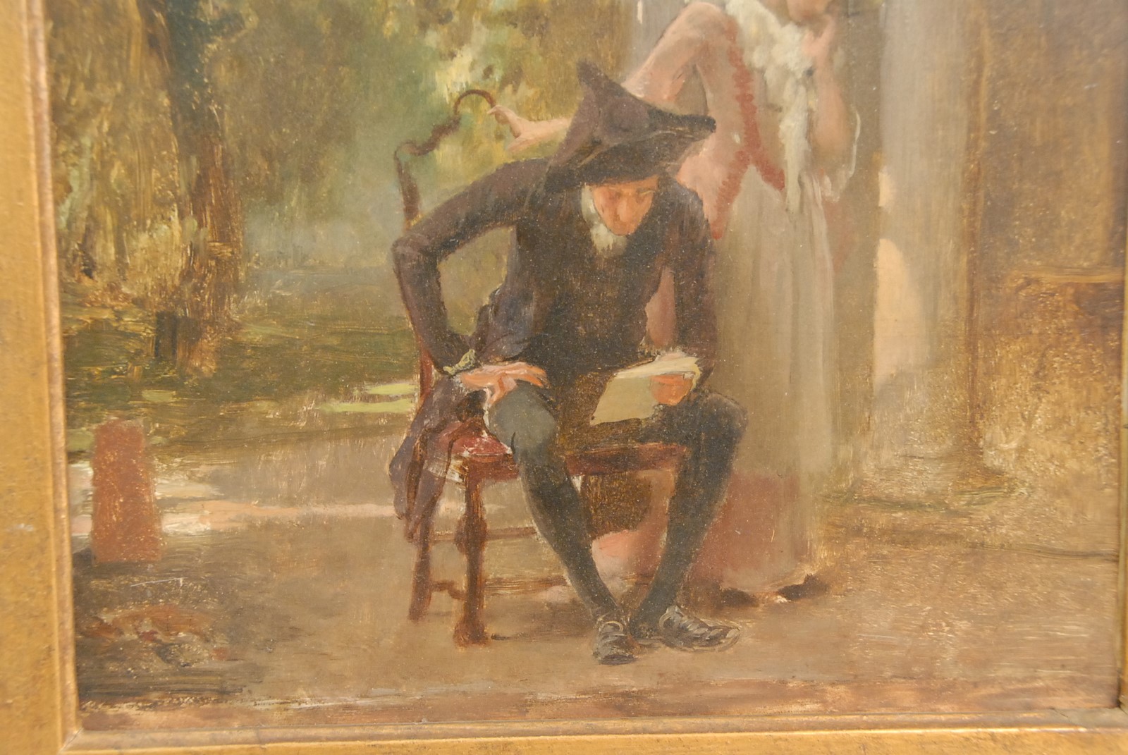 Attributed to Marcus Clayton Stone 1840-1921 THE LADS LETTER oil on panel unsigned part of old paper label stating Sketch Marcus Stone, old faint writing on verso 10 1/2 x 12 1/2