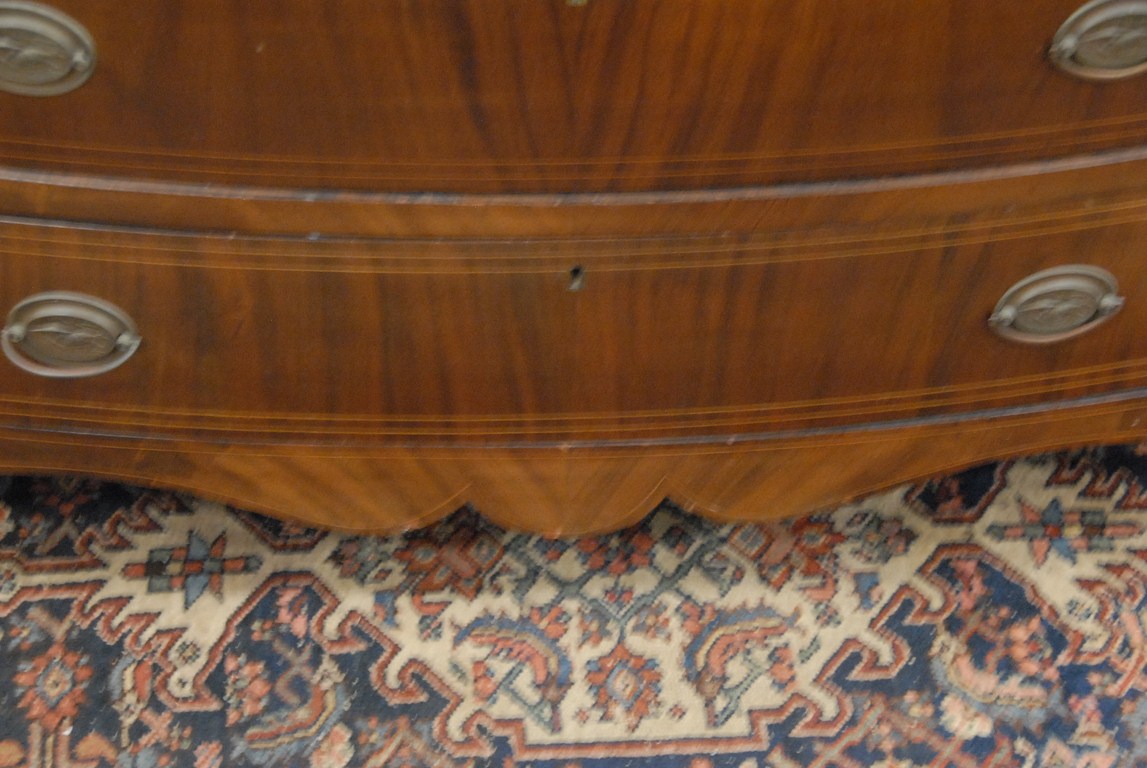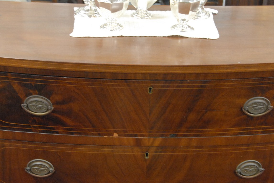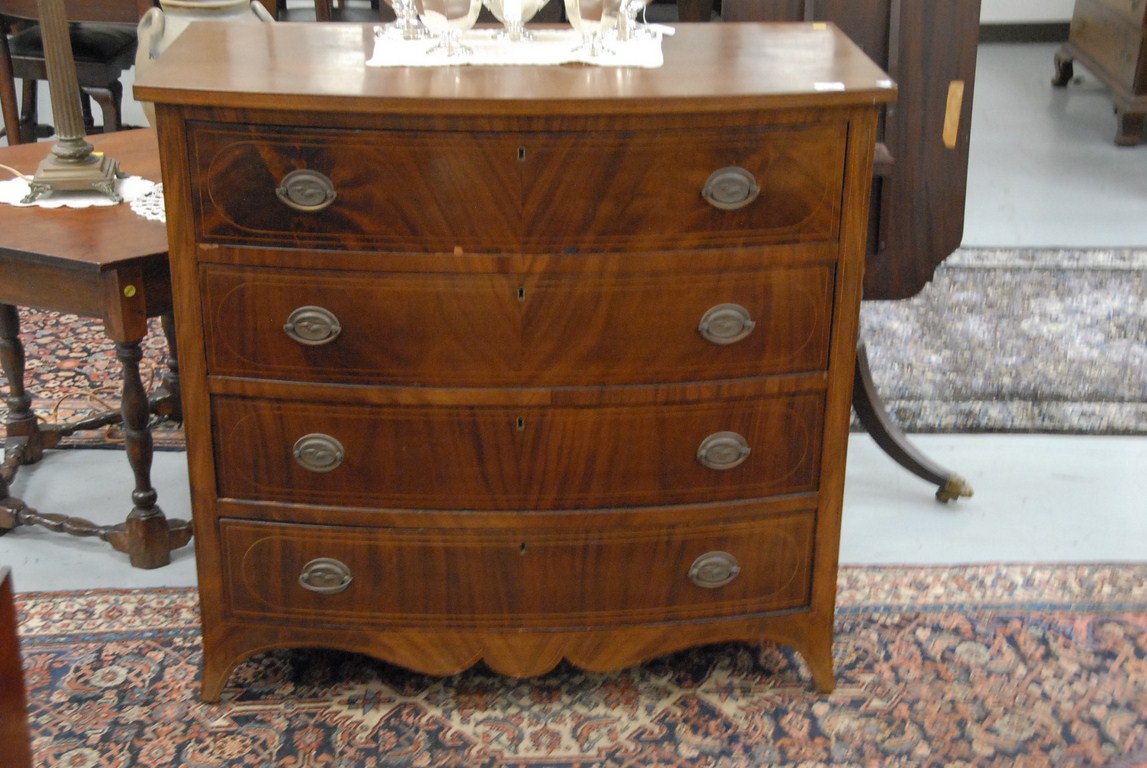 Lot 246: Federal mahogany chest of four drawers with bowed front on French feet. ht. 39in. wd. 40in.