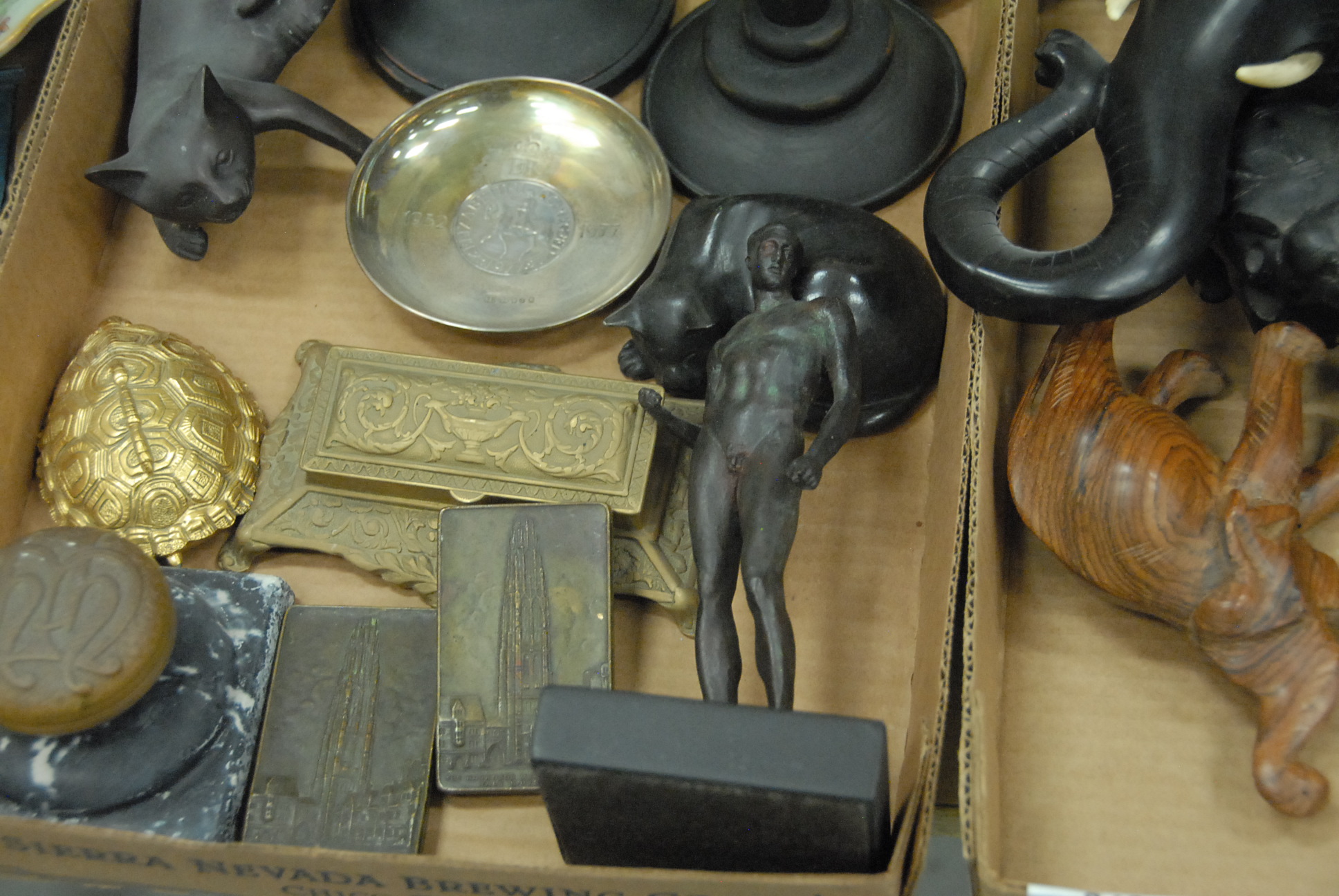 Lot 246: Four boxes to include carved animals, ebony elephant, carved mask, pair of parrots on stands, two Bastian Brothers bronzes, Michael …