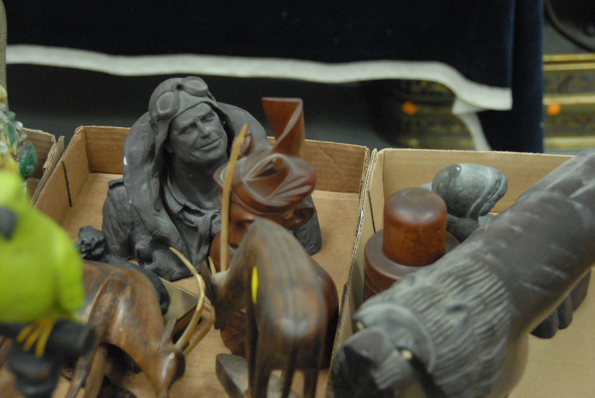 Four boxes to include carved animals, ebony elephant, carved mask, pair of parrots on stands, two Bastian Brothers bronzes, Michael Garman bust, etc.