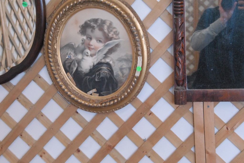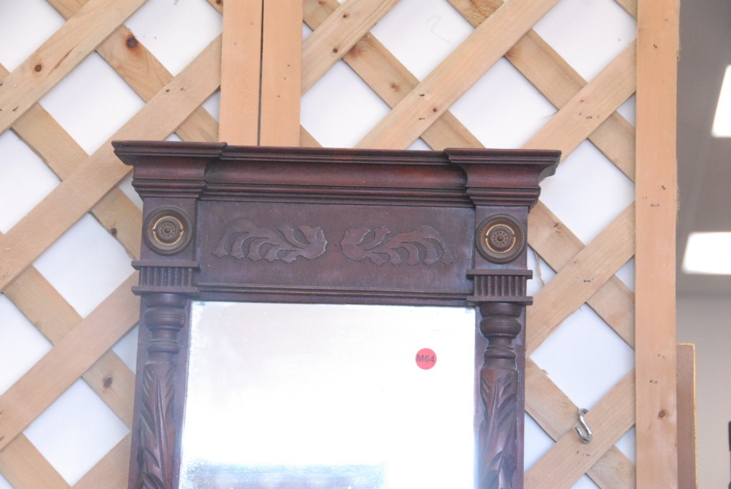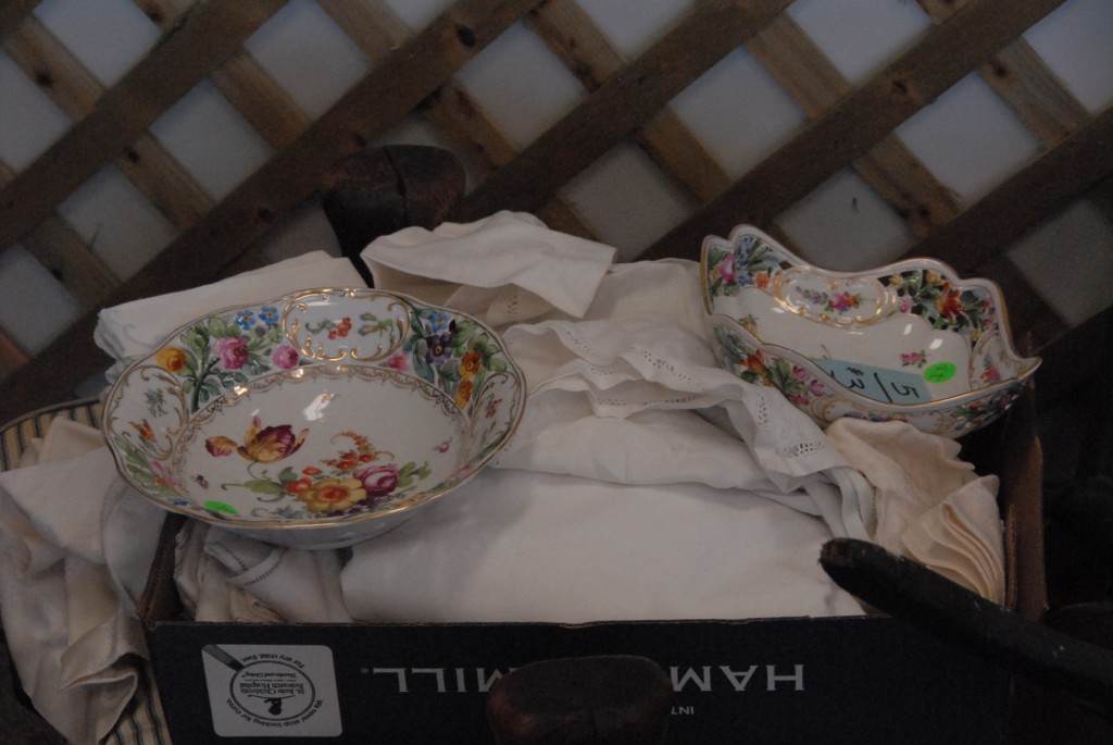 Group lot Federal mahogany two part mirror, linens, print, Dresden bowl, and reticulated bowl as is.