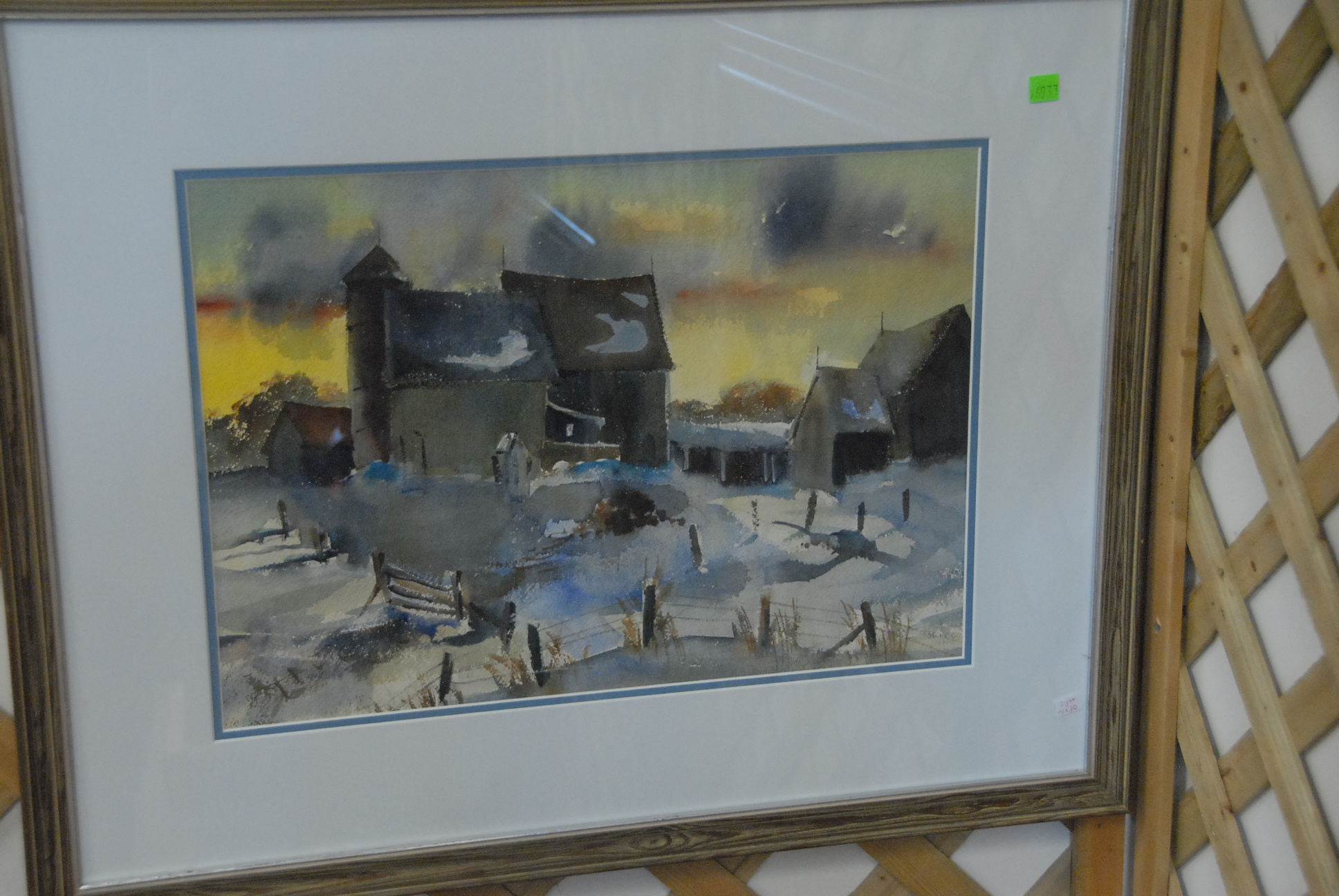 Lot 246: Group of five framed pieces to include an unsigned winter landscape, Roger Colton pen and ink, and three prints.