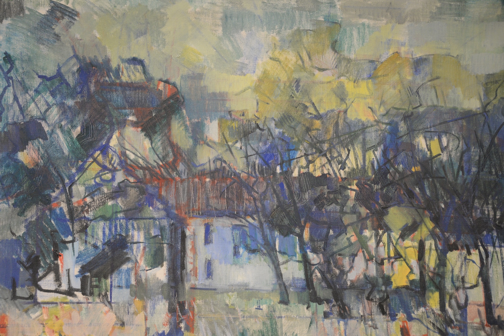 Irene Bataille (Belgian, 1913 – 1970), abstract landscape, oil on canvas, signed lower left I. Bataille, 32″ x 40″. Provenance: The Estate of Alina Roisen, Park Avenue, New York.