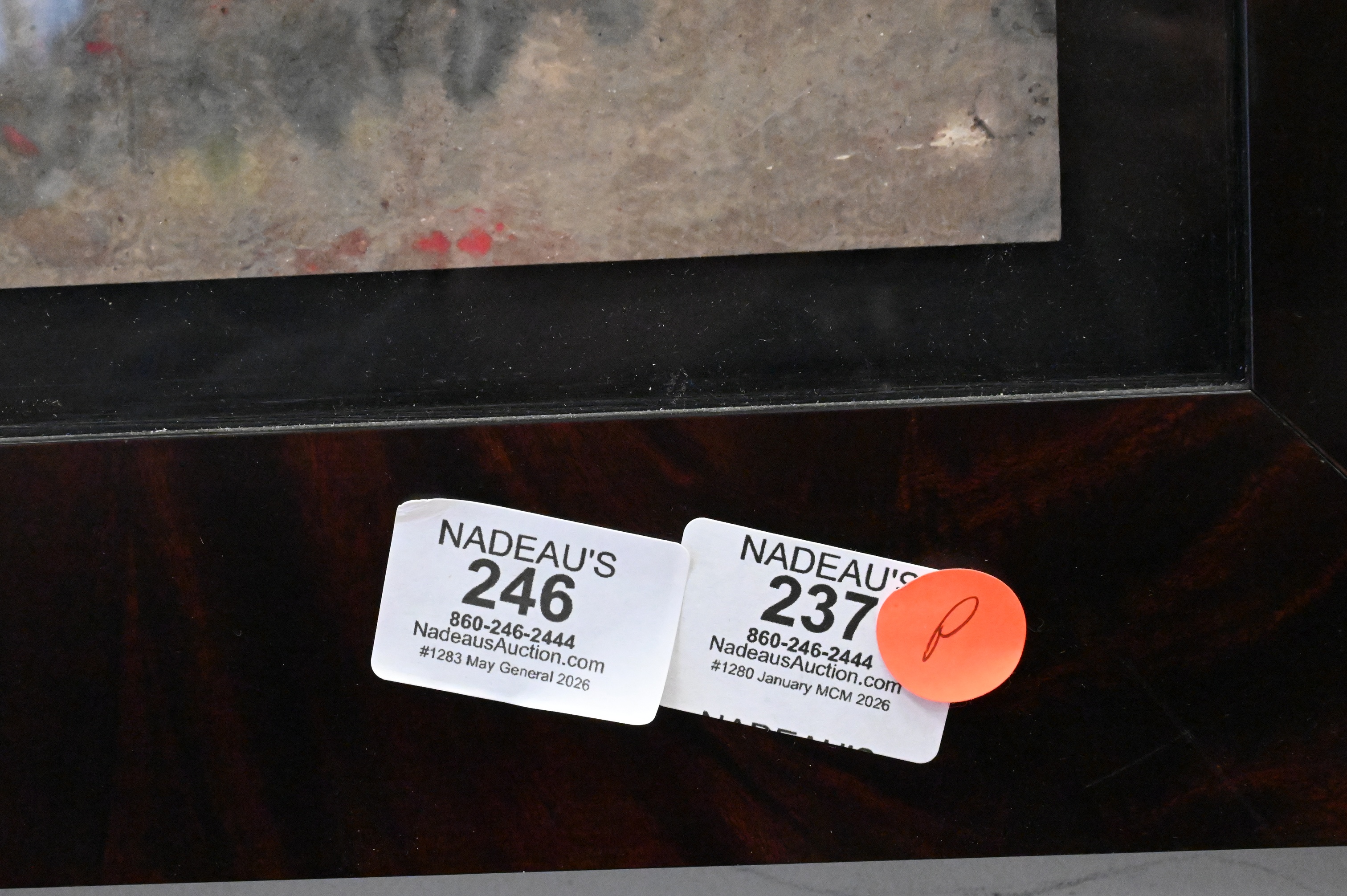 This report is provided by Nadeau’s Auction Gallery as a courtesy and reflects our opinion only. Bidders should conduct their own due diligence. The absence of a report does not imply the lot is free of issues. Assessments are based on visual inspection; unless noted, items have not been examined under UV light, movements and electrical components have not been tested, and artworks are generally not removed from frames. We are not professional conservators, and this report is not a comprehensive condition evaluation. Images provided form part of the report and should be reviewed carefully. All sales are final. For in-person inspection, please call 860-246-2444 or email info@nadeausauction.com.