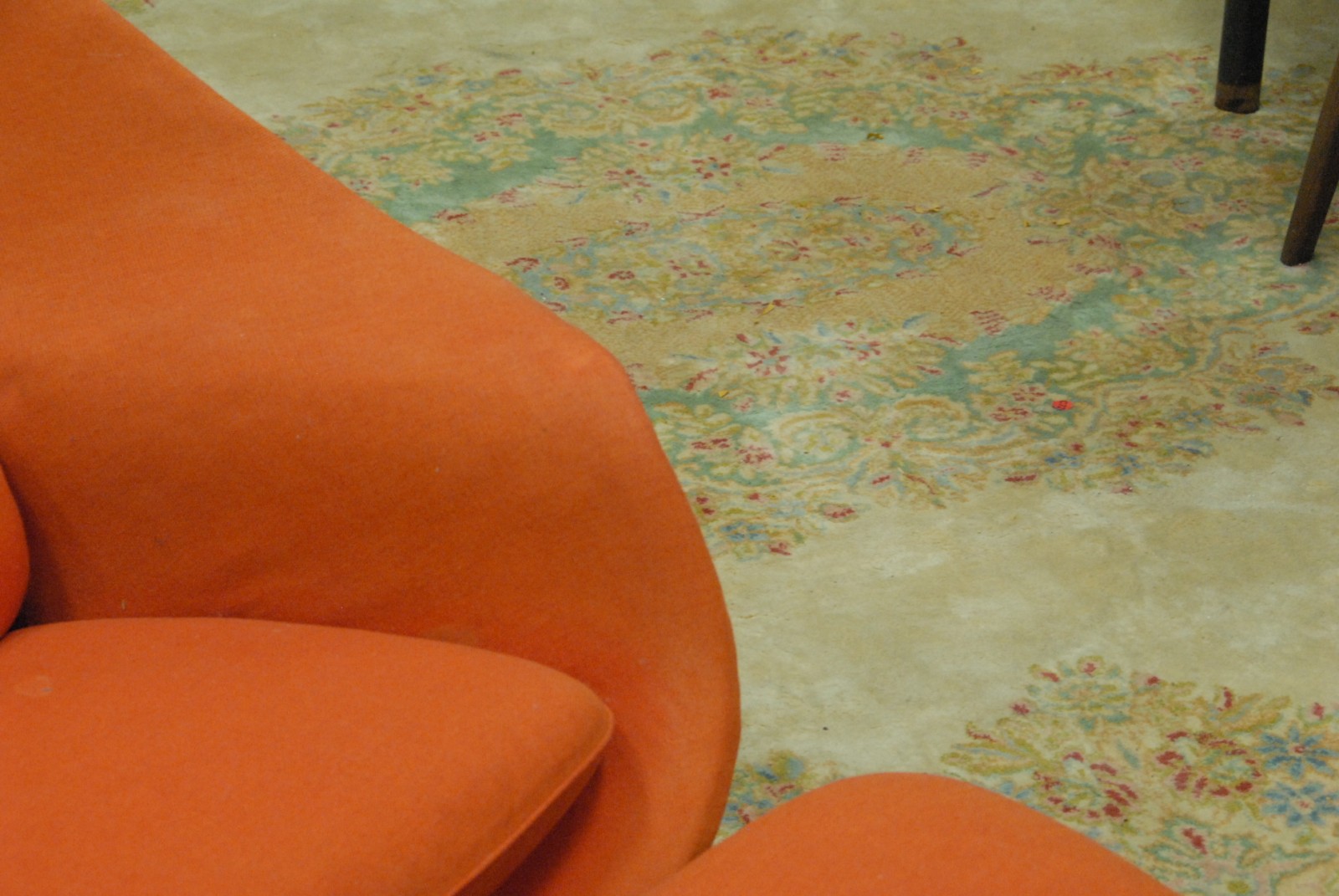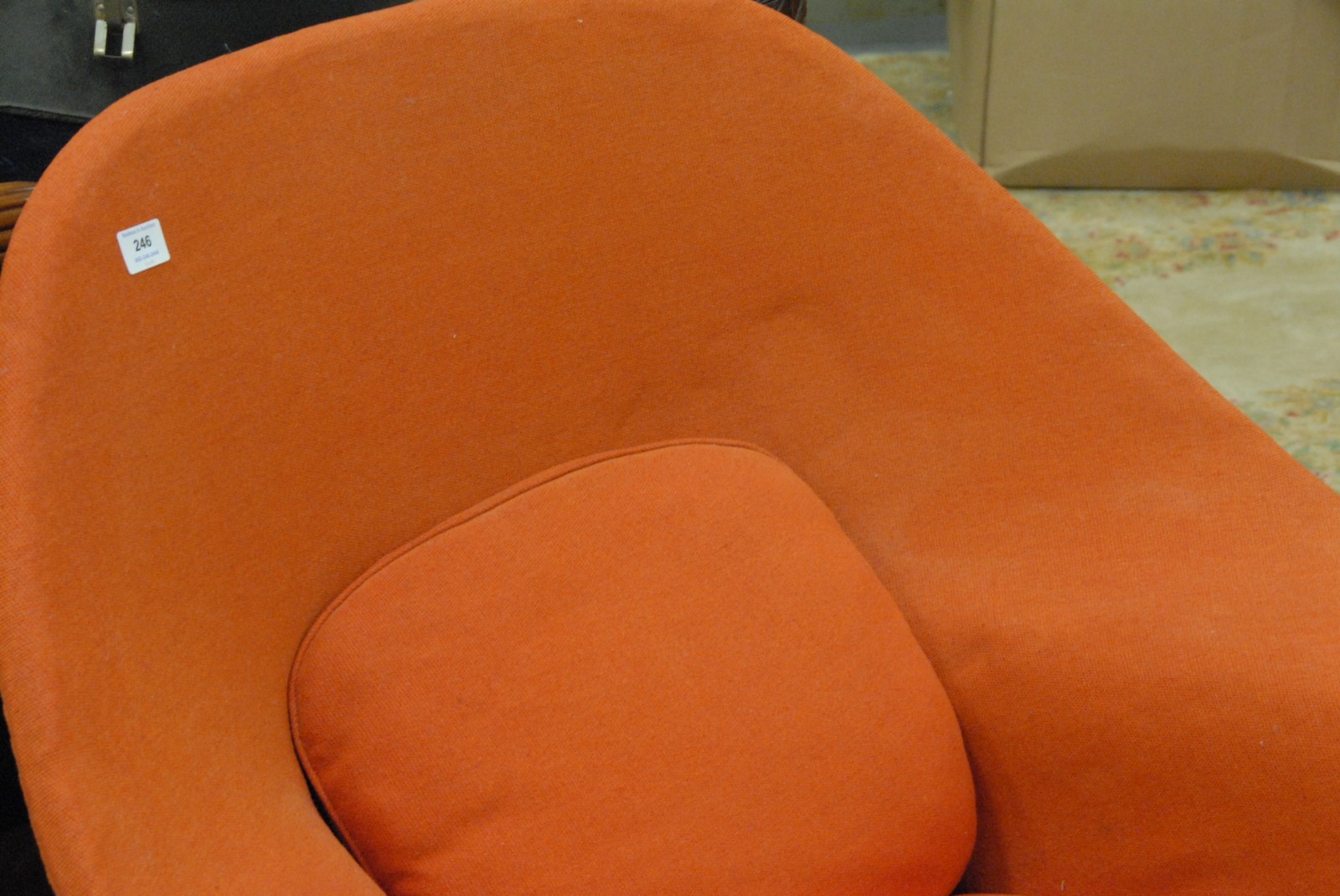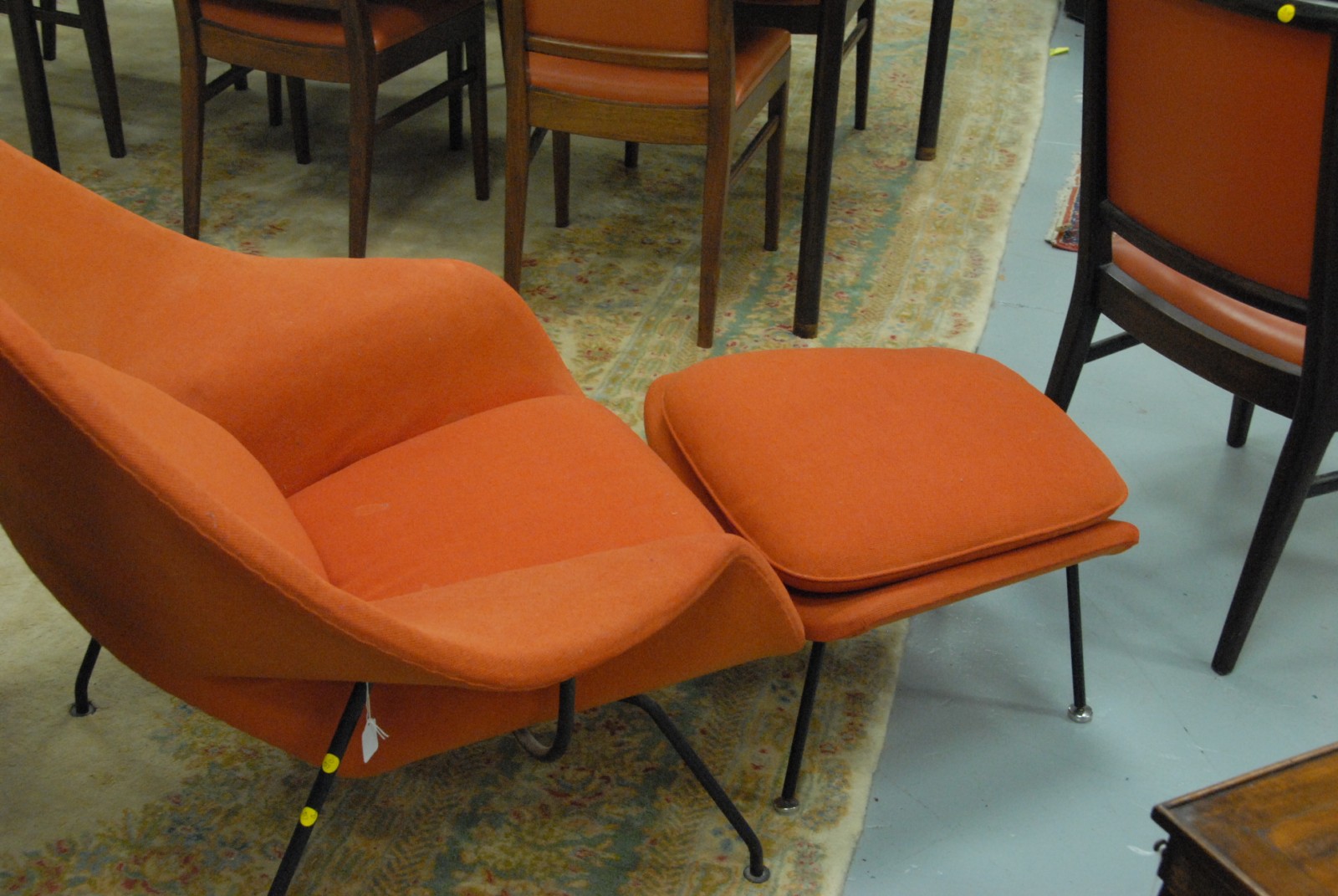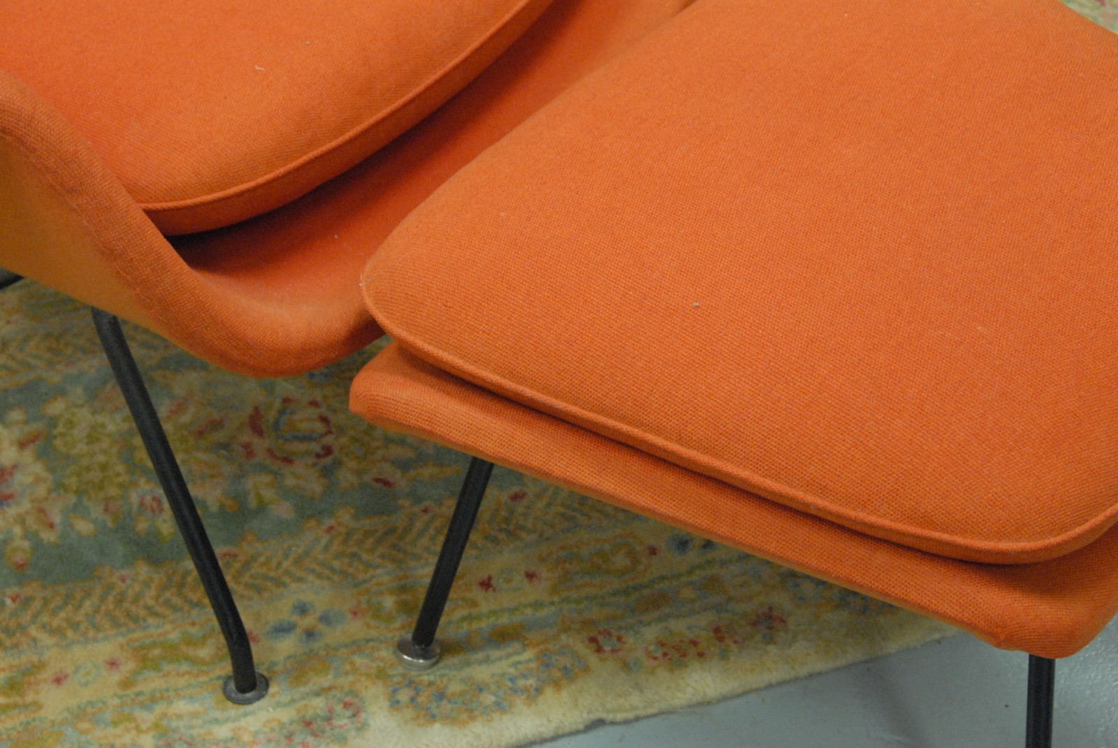 Knoll womb chair and ottoman possibly recovered in original style orange material.